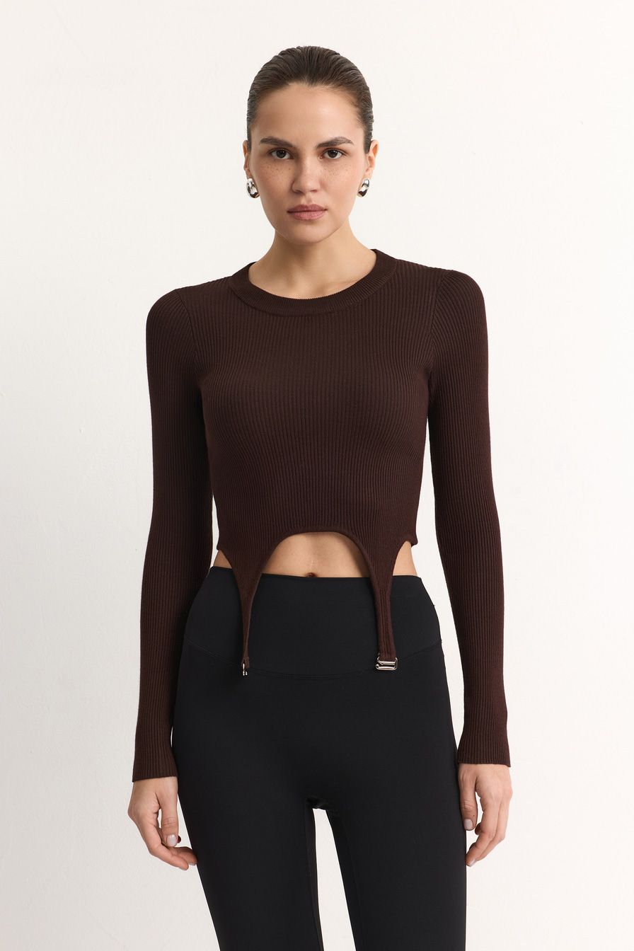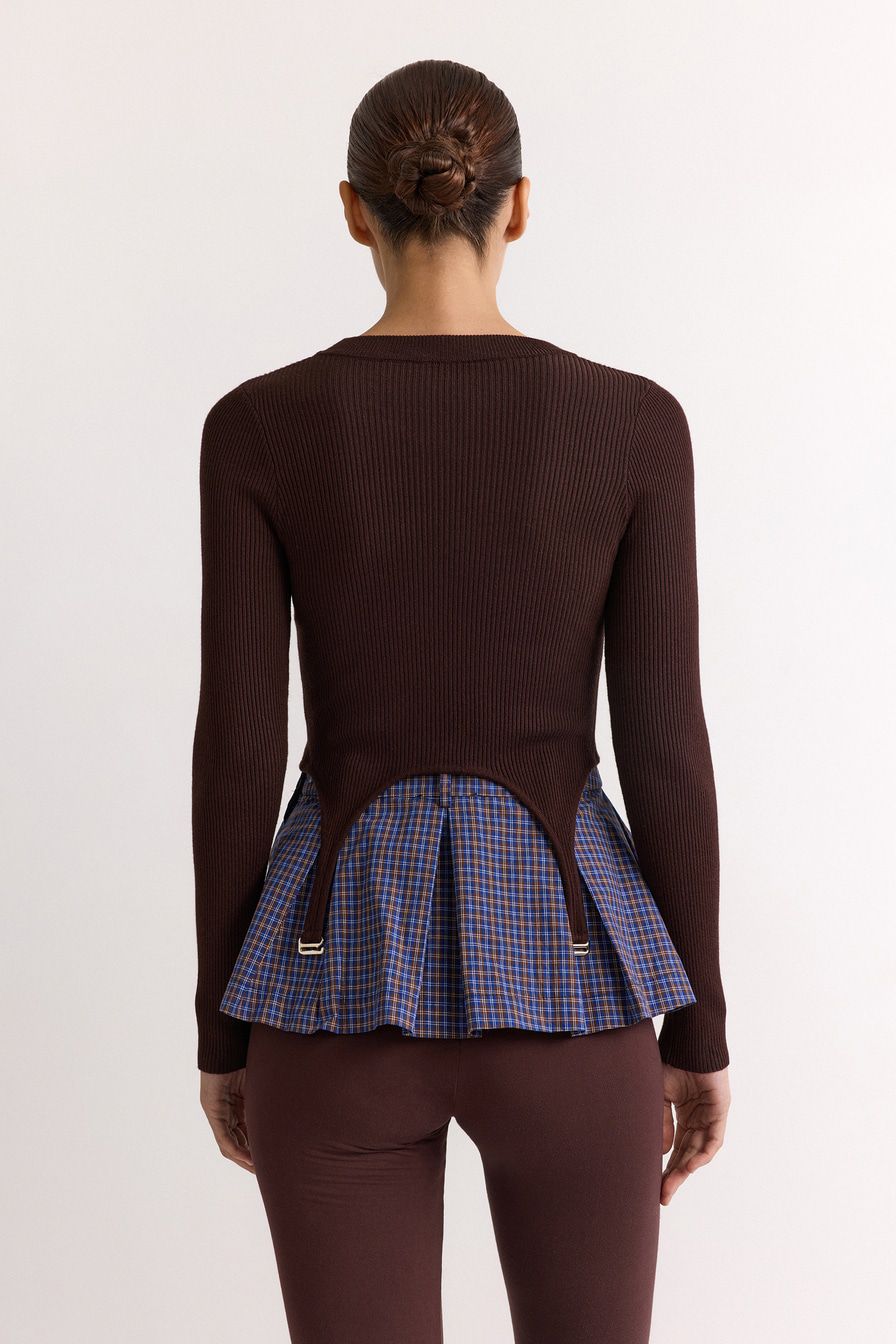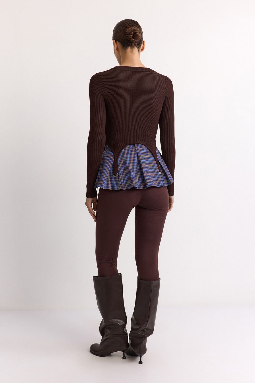 Укороченный облегающий джемпер выполнен из смесовой вискозы с фактурой в рубчик и дополнен декоративными лямками. В комплекте с джемпером идет юбка-баска со встречными складками и принтом «клетка».