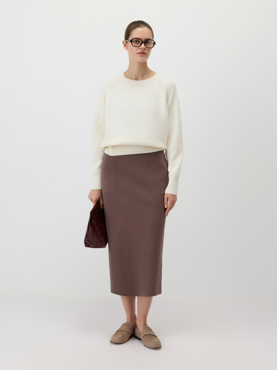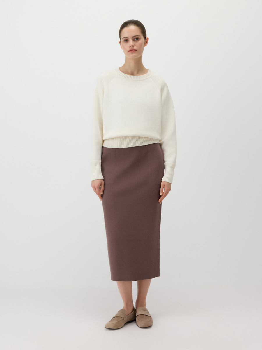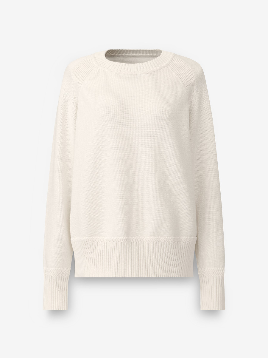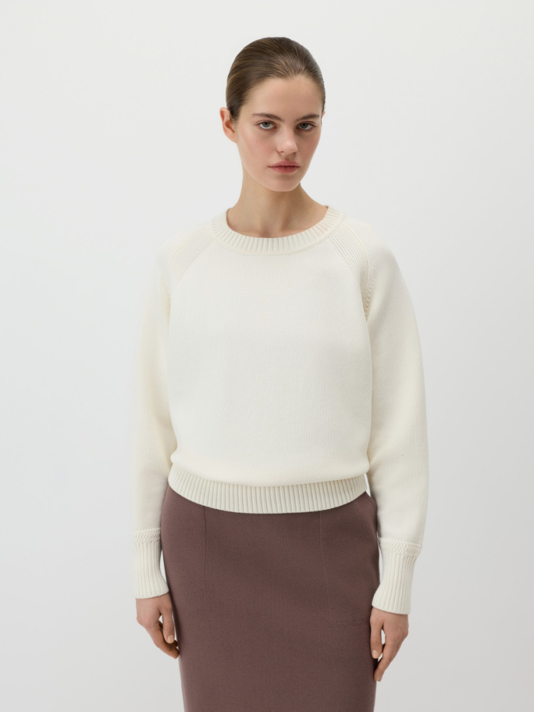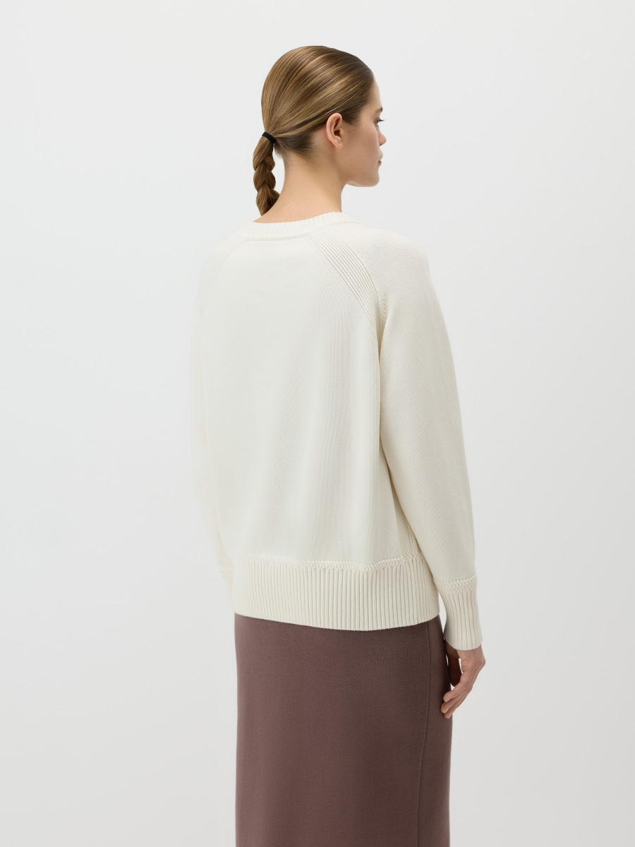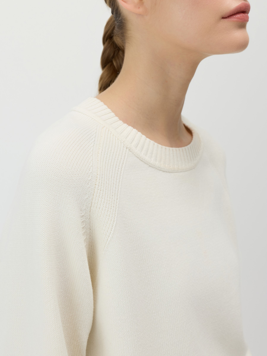 Свободный повседневный джемпер гладкой вязки из 100% хлопка. Круглый вырез, манжеты и низ обрамлены эластичной фактурной резинкой. Рукава реглан создают расслабленную посадку, которая подстраивается под объем плеч. Длина позволяет носить модель как навыпуск, так и частично заправленной.