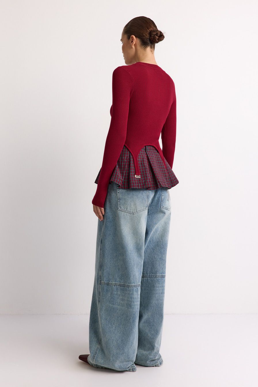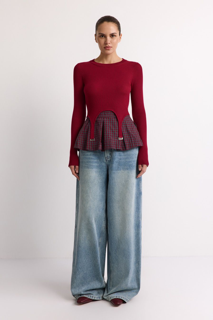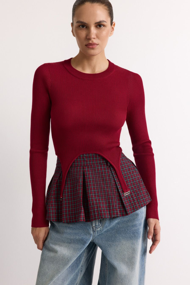 Укороченный облегающий джемпер выполнен из смесовой вискозы с фактурой в рубчик и дополнен декоративными лямками. В комплекте с джемпером идет юбка-баска со встречными складками и принтом «клетка».