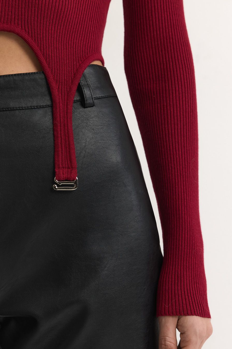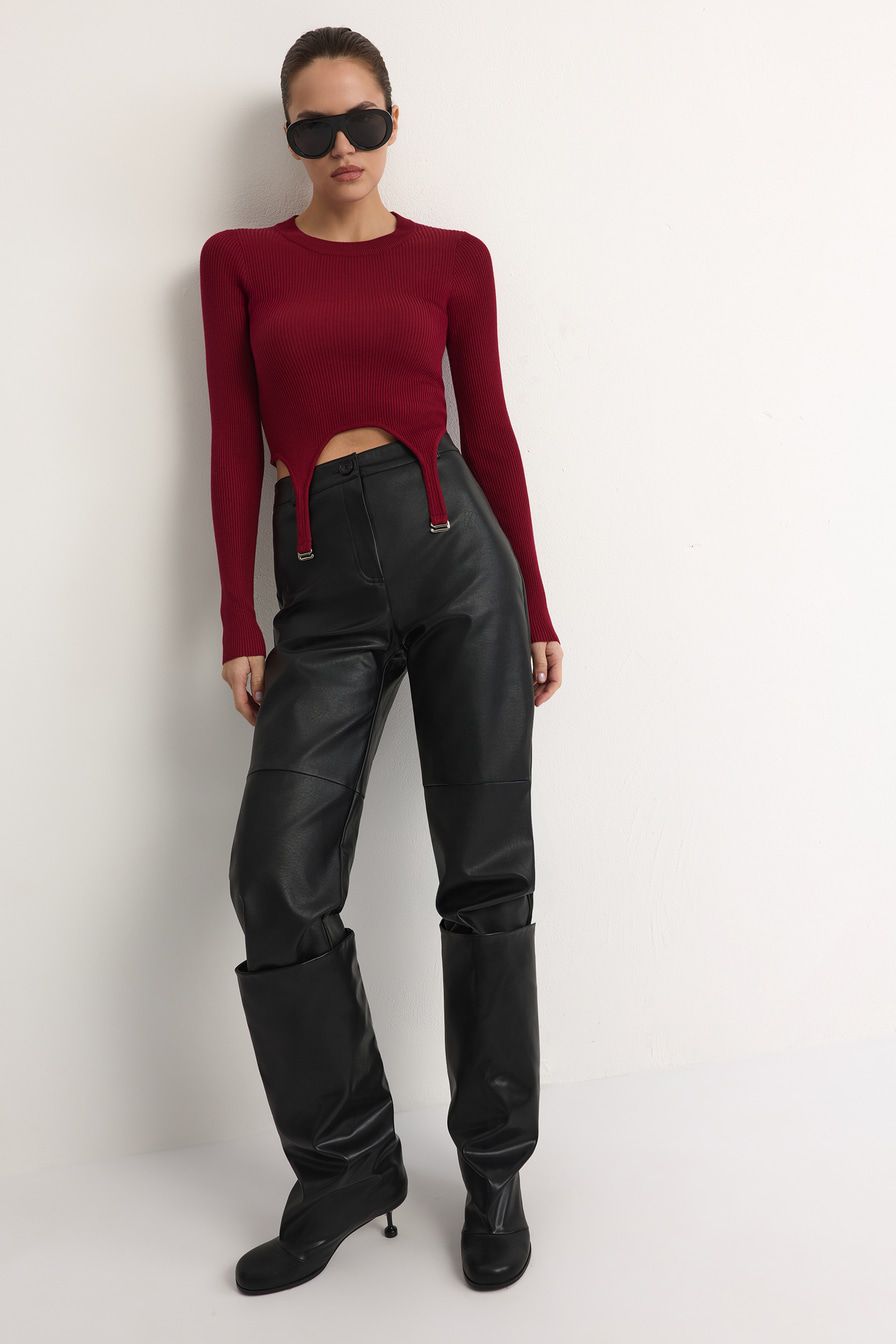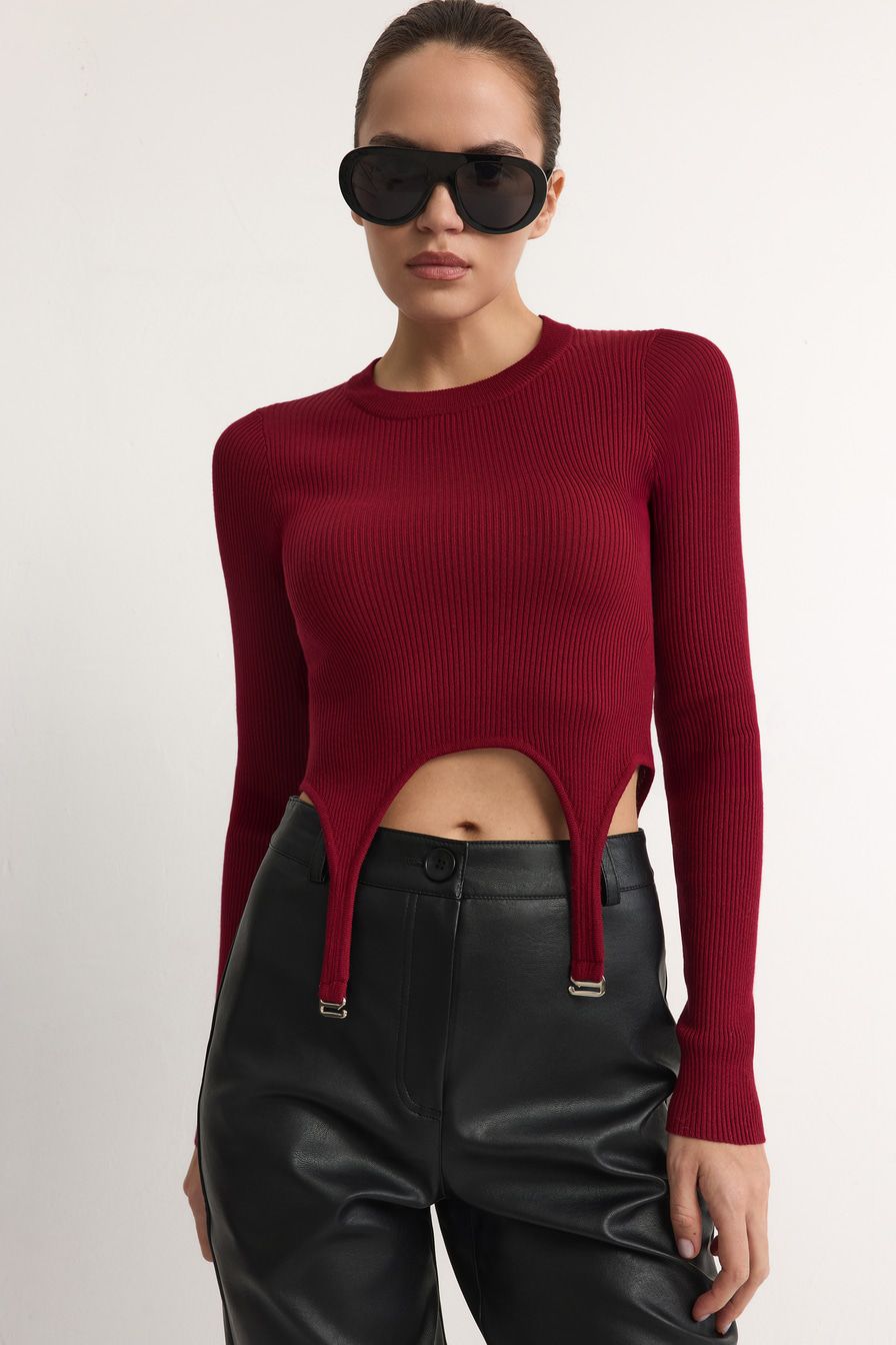 Укороченный облегающий джемпер выполнен из смесовой вискозы с фактурой в рубчик и дополнен декоративными лямками. В комплекте с джемпером идет юбка-баска со встречными складками и принтом «клетка».