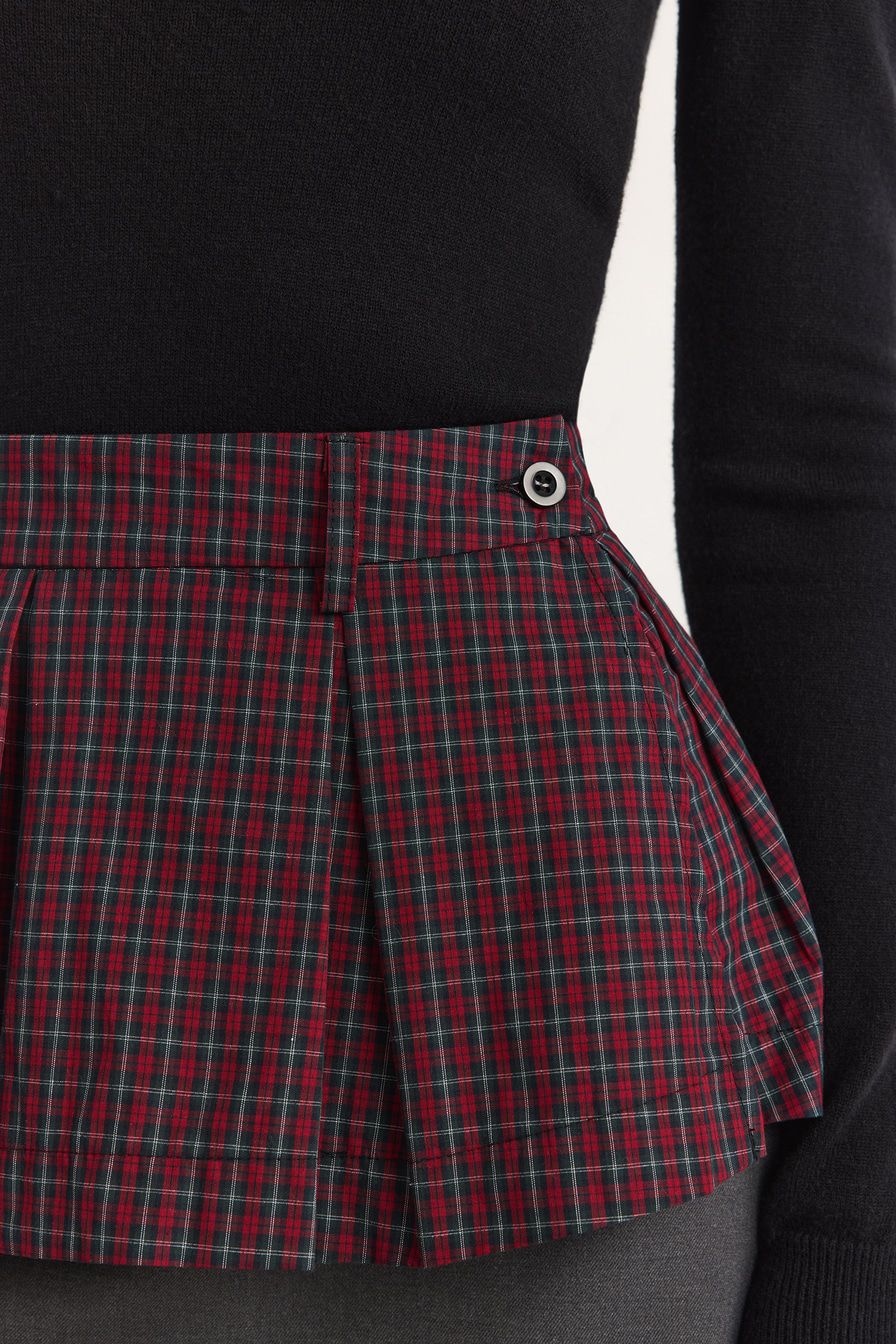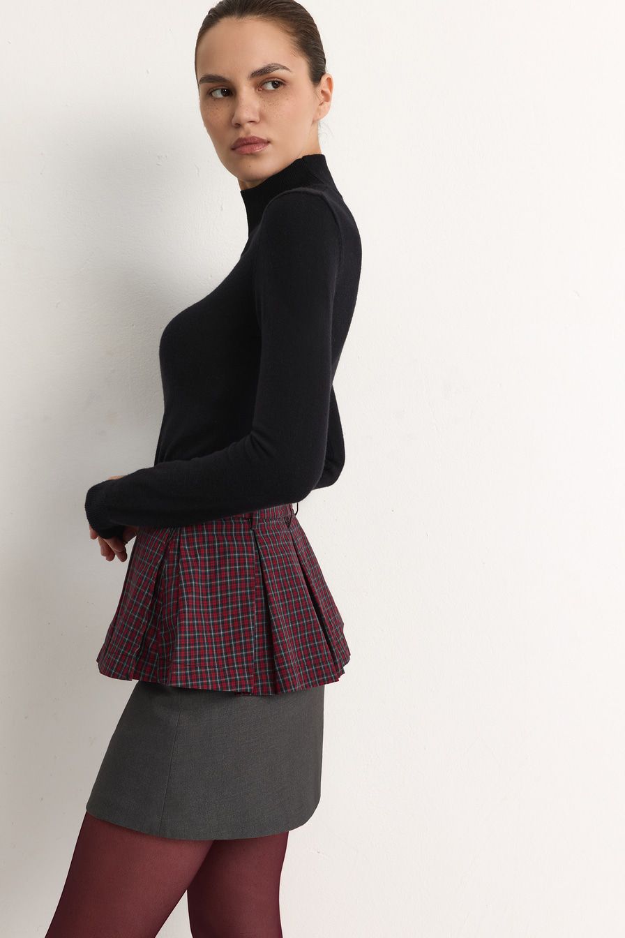 – Встречные складки и принт «клетка» на юбке;