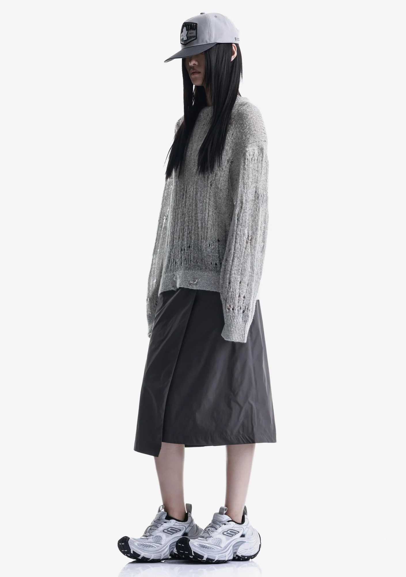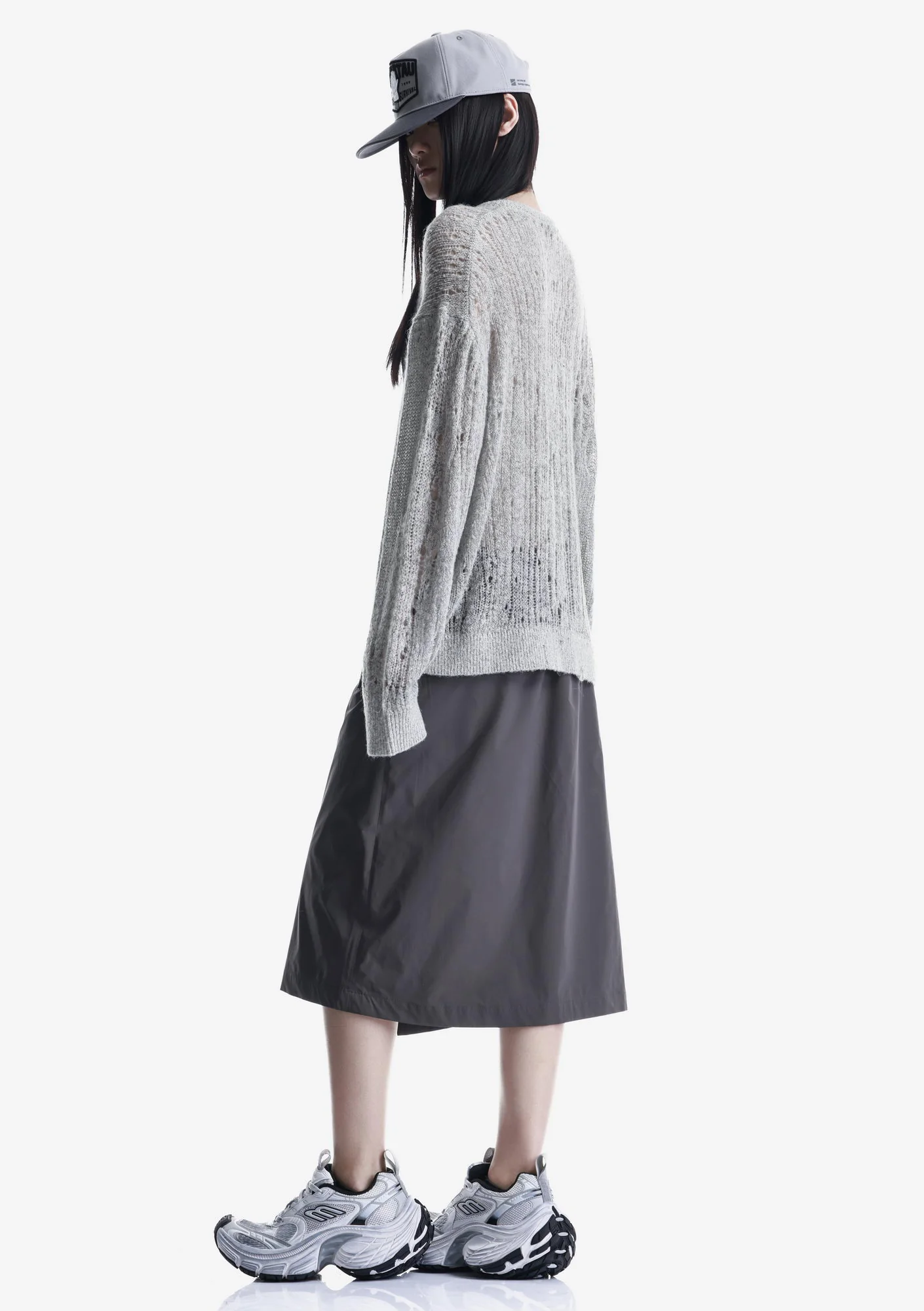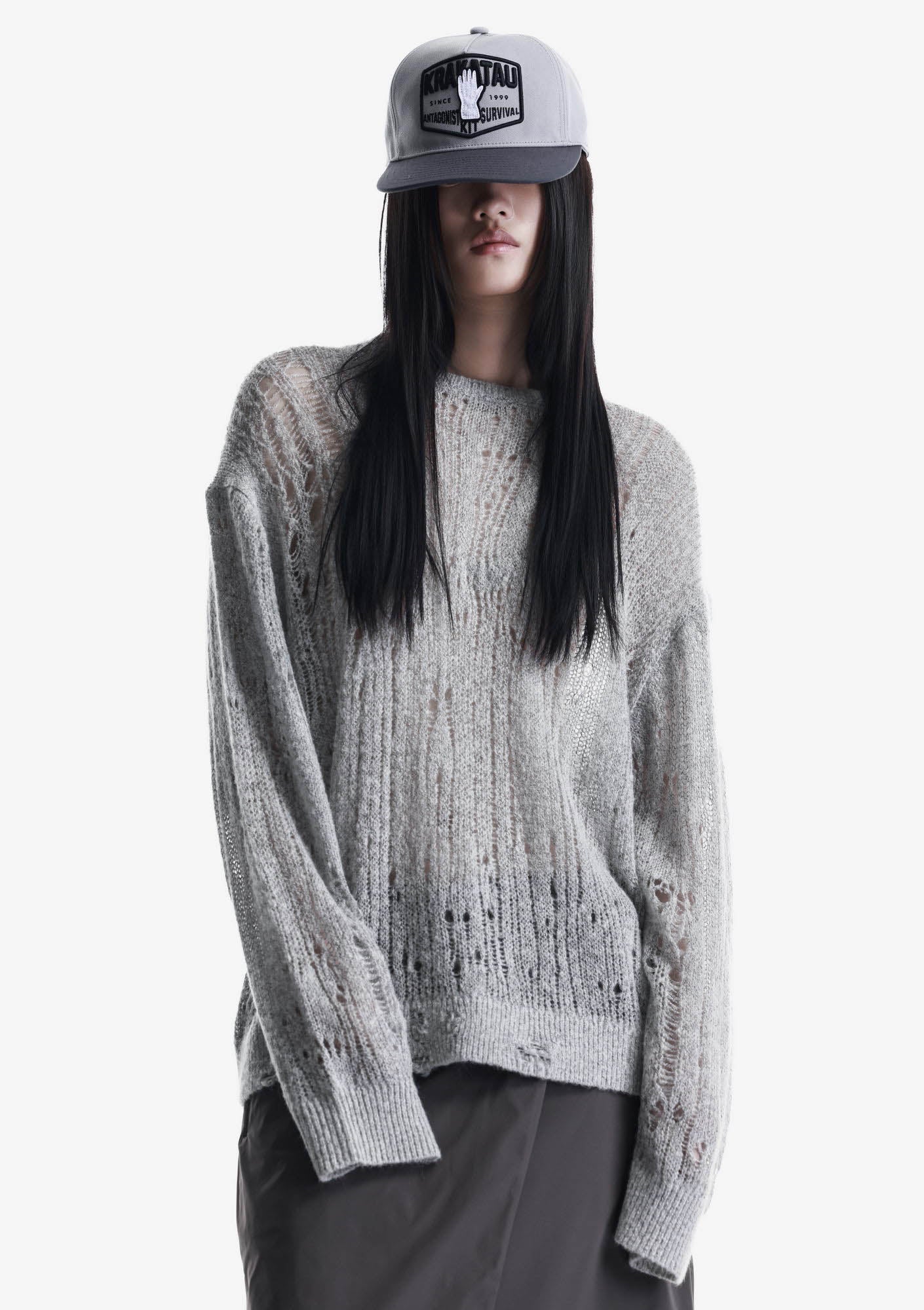 Свитер с круглым вырезом и удлинёнными рукавами выполнен сетчатой вязкой, создающей лёгкую, фактурную структуру. Смесовая пряжа на основе нейлона, акрила, шерсти и мохера сочетает мягкость, тепло и устойчивость формы, сохраняя прочность и комфорт в носке.