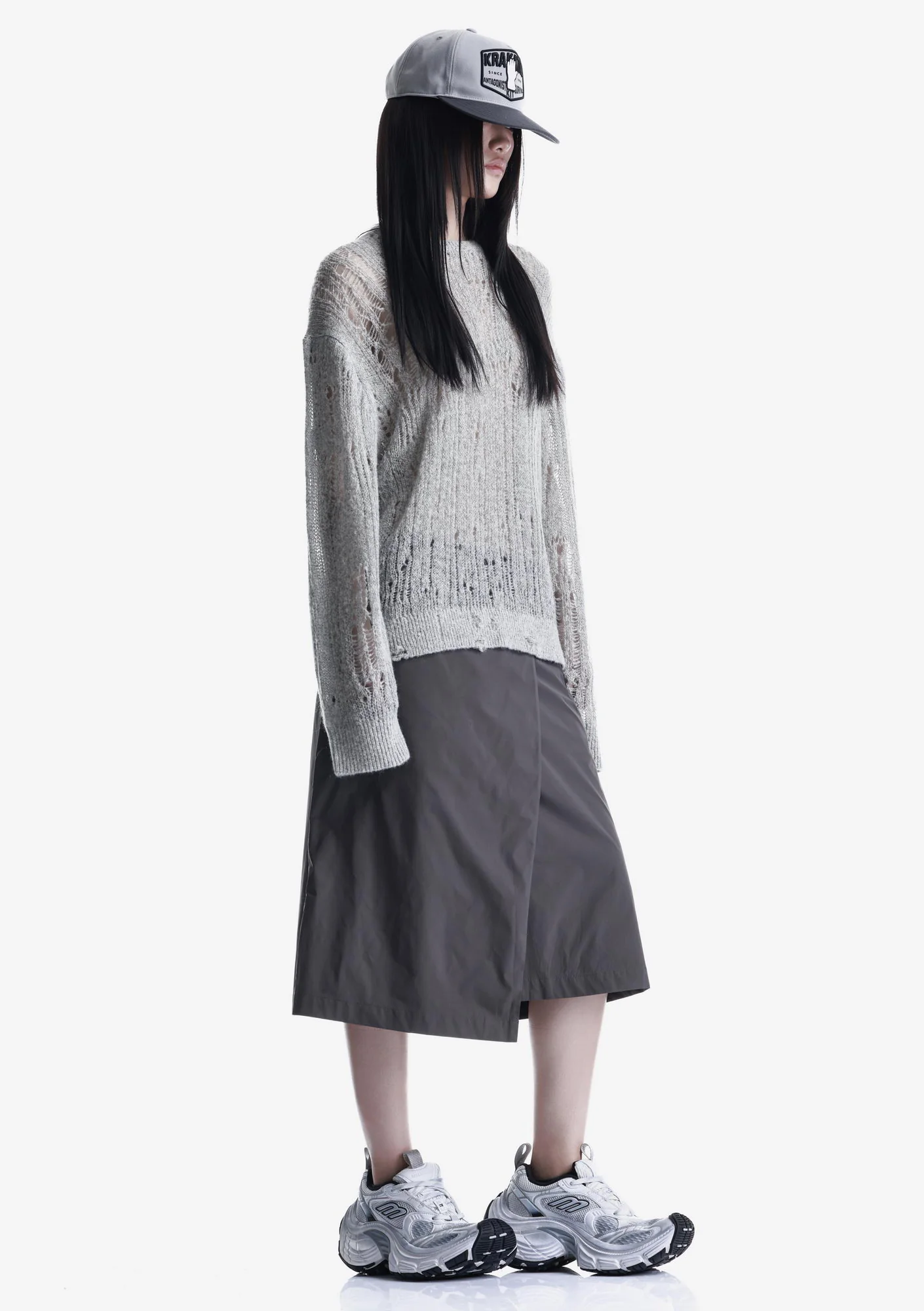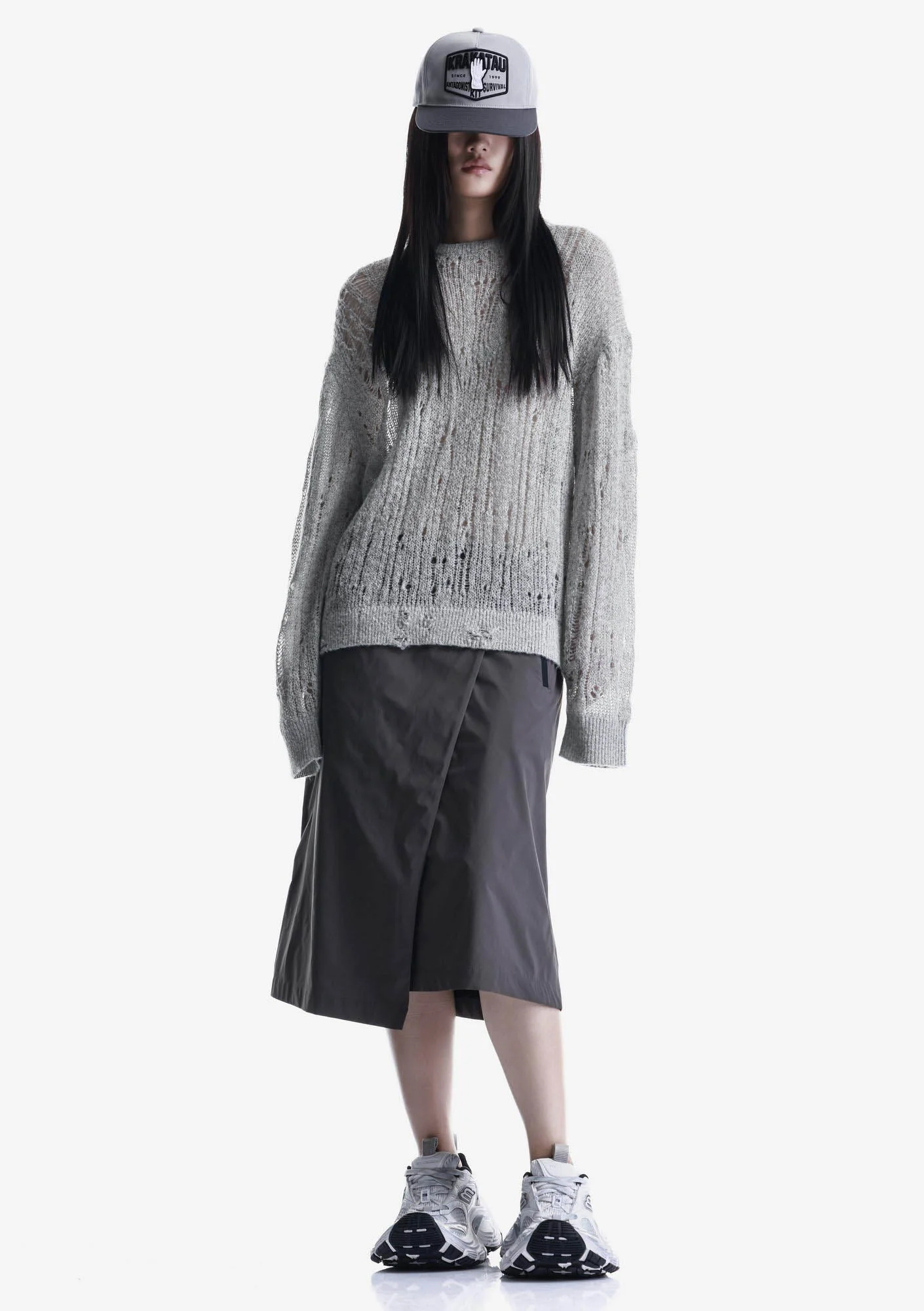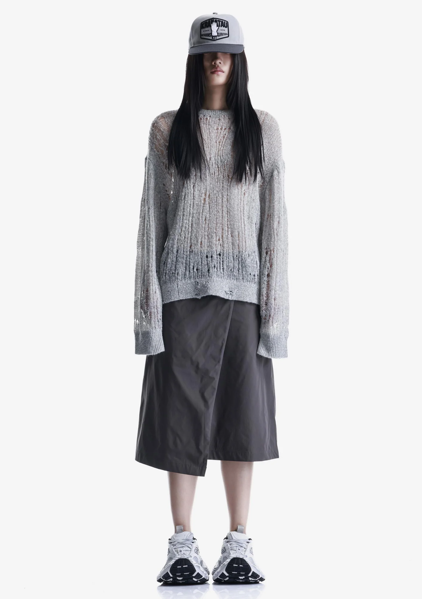 Свитер с круглым вырезом и удлинёнными рукавами выполнен сетчатой вязкой, создающей лёгкую, фактурную структуру. Смесовая пряжа на основе нейлона, акрила, шерсти и мохера сочетает мягкость, тепло и устойчивость формы, сохраняя прочность и комфорт в носке.