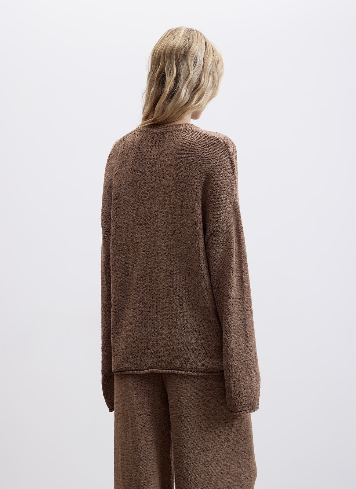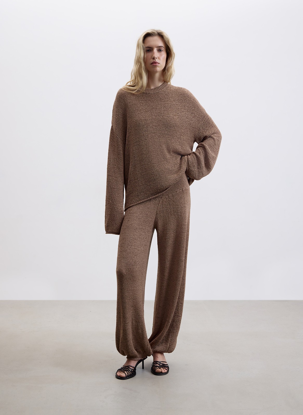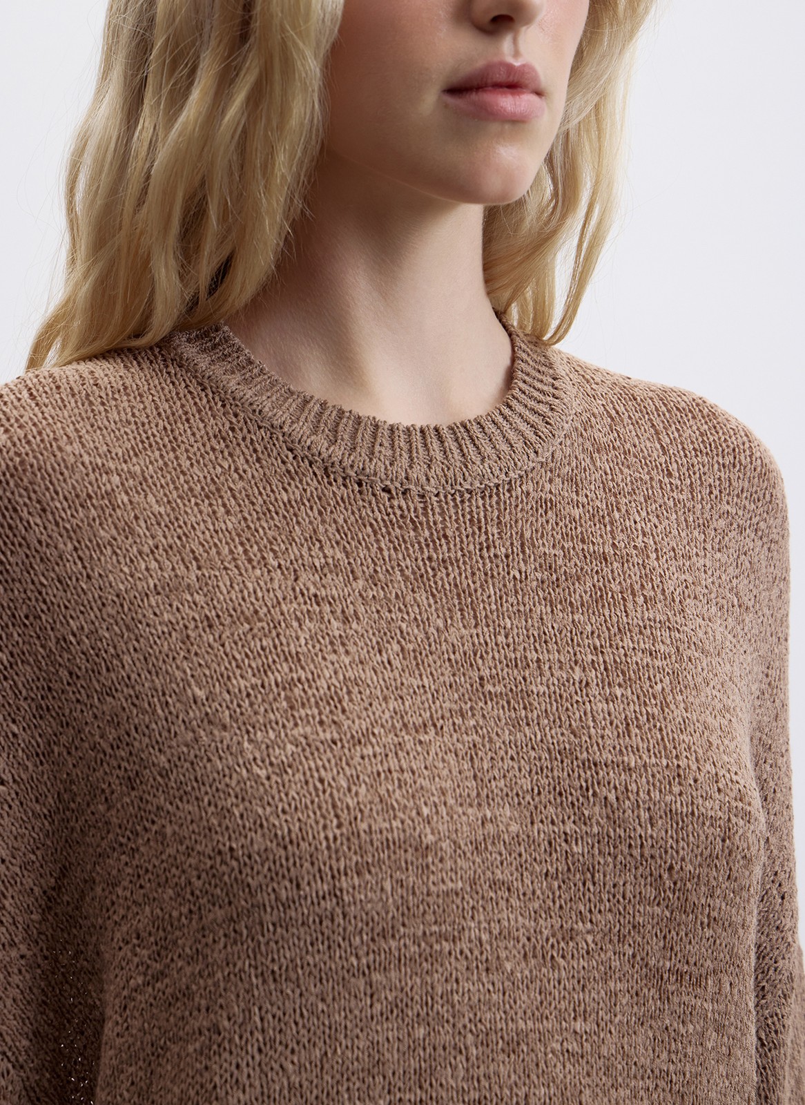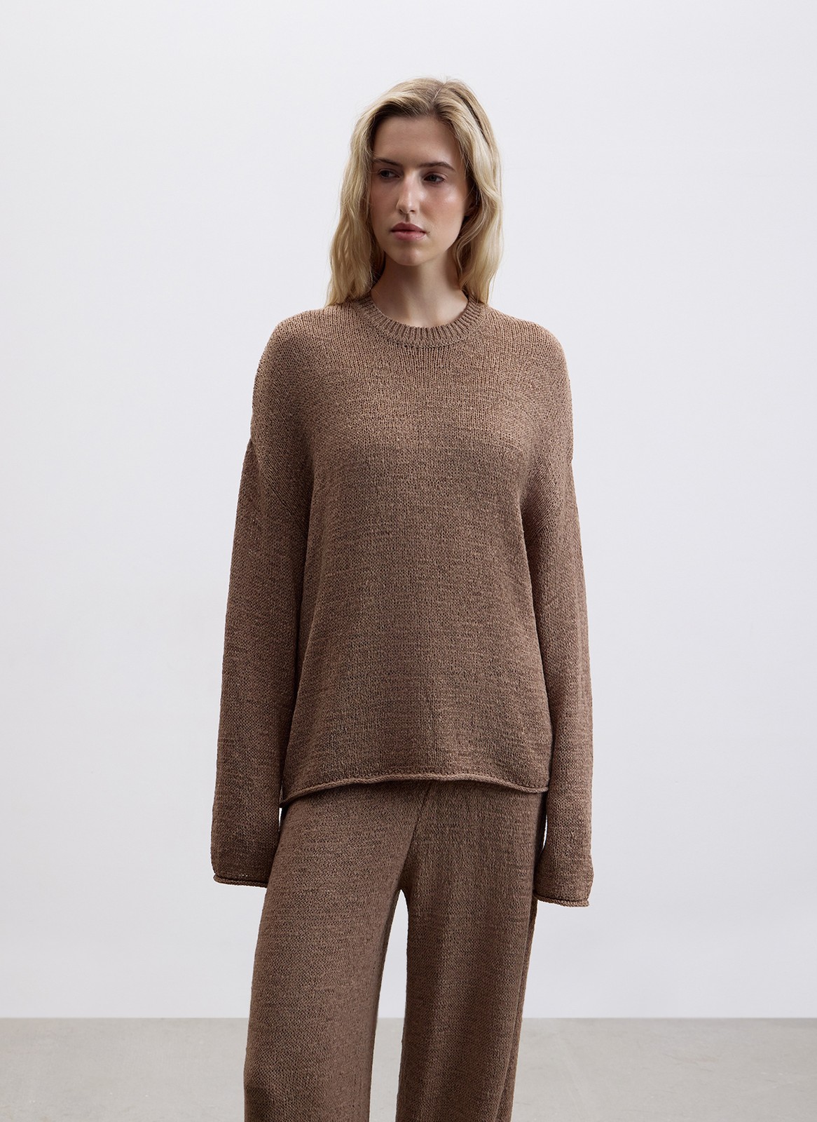 Ультраобъёмный джемпер с ажурной текстурой — главный акцент расслабленного летнего образа.