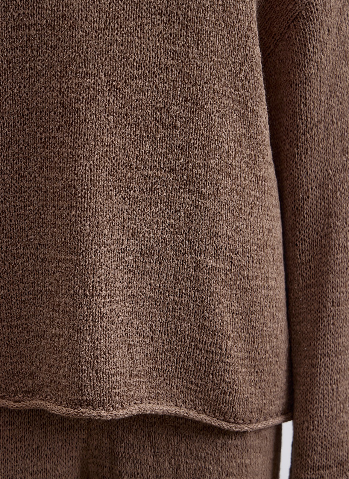 Расслабленный эффект достигается за счёт воздушной вязки пряжи, напоминающей ленточки. Материал дышит и не перегревает кожу в летний период. Пряжа подвижна и из-за своей структуры может немного растягиваться, поэтому рекомендуем хранить изделие в сложенном виде.
