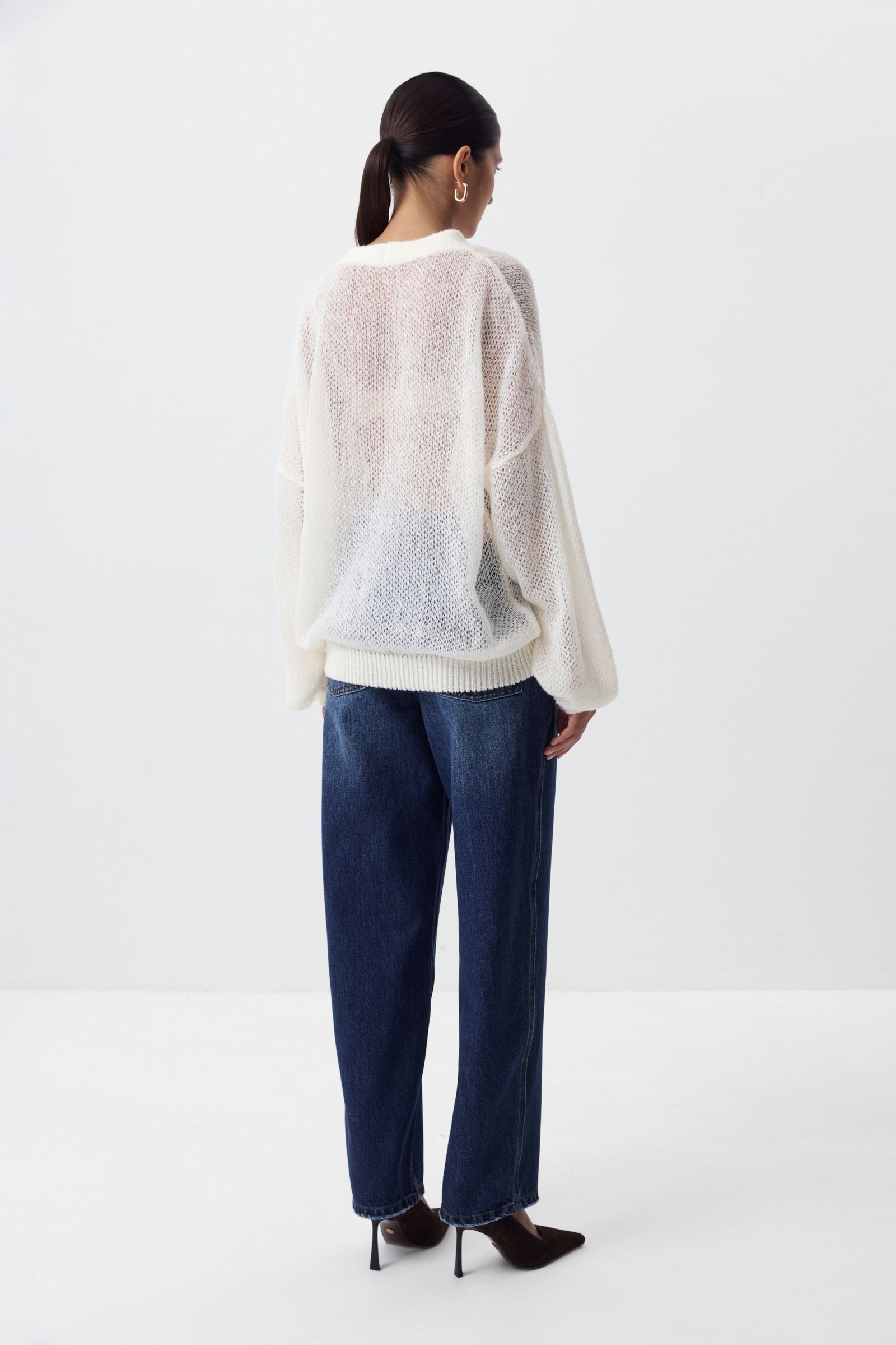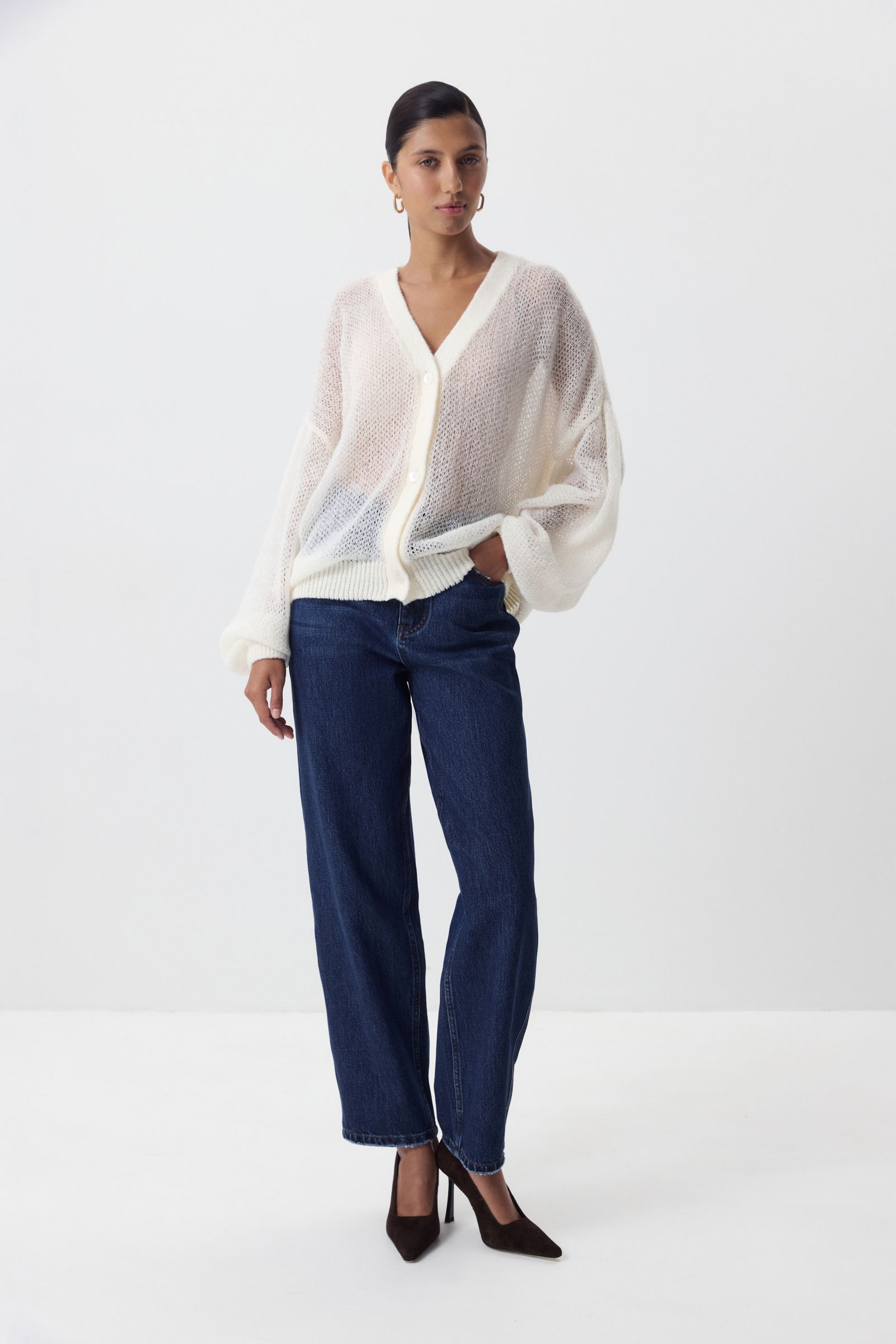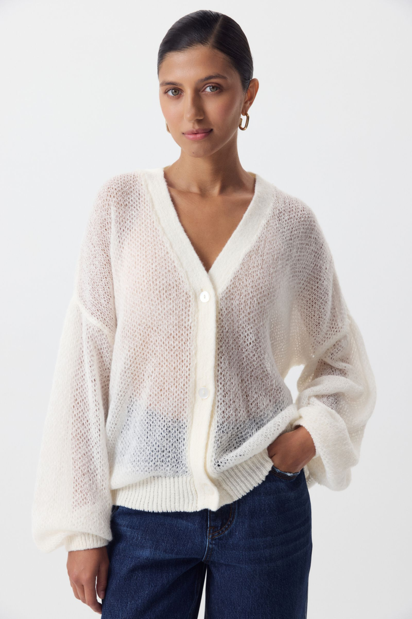 Модель со спущенным плечом и расклешенным рукавом практически не ощущается на плечах, а свободный силуэт позволяет сочетать кардиган с другими вещами, делая изделие завершением выхода. Для вязки была выбрана мягкая пряжа с добавлением мохера в составе, которая позволила его сделать полупрозрачным и невесомым.
