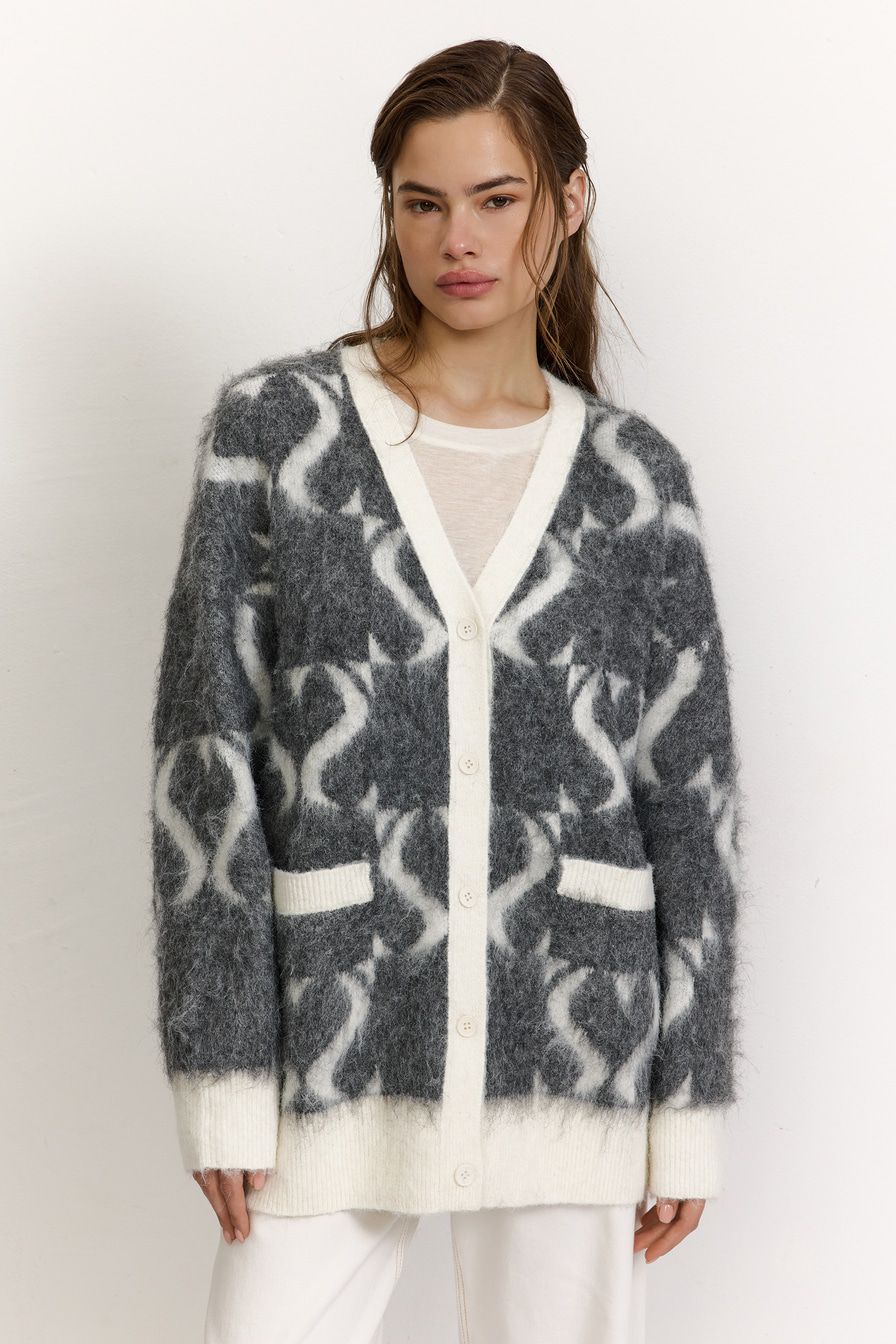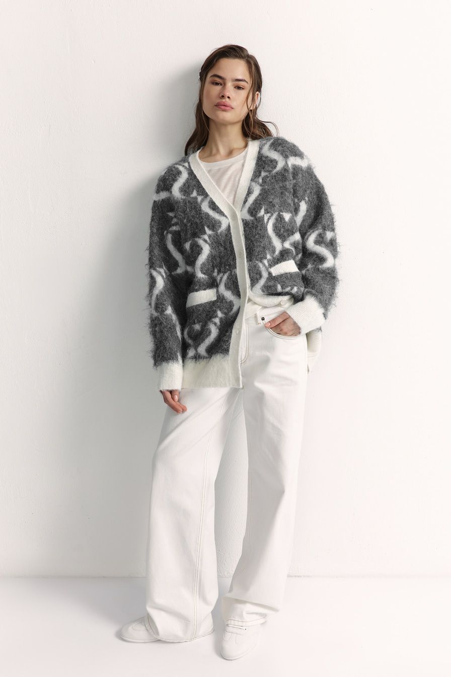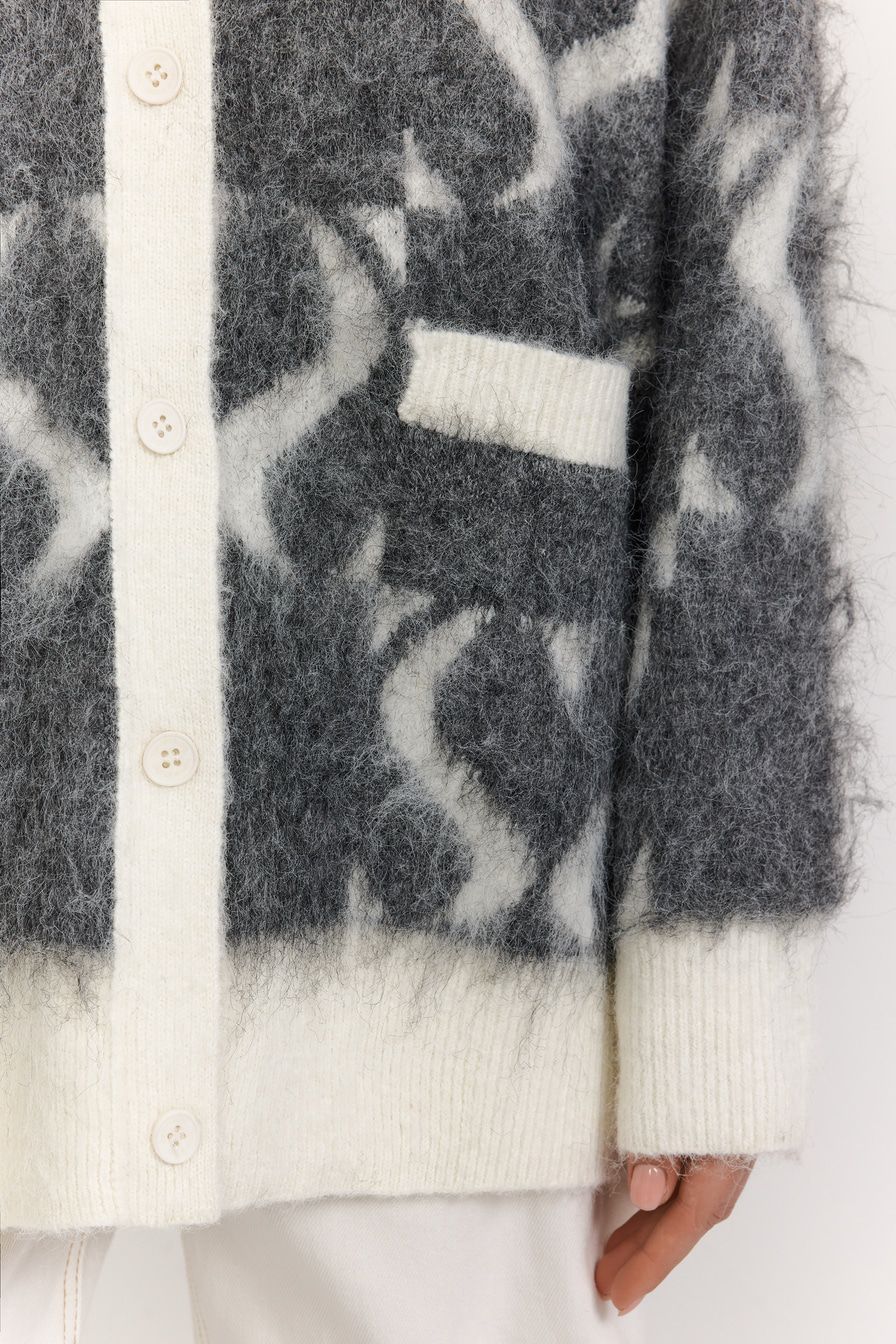 Объемный пушистый кардиган выполнен из смесовой ткани с добавлением переработанного полиэстера. Модель дополнена боковыми карманами и декорирована принтом-монограммой.