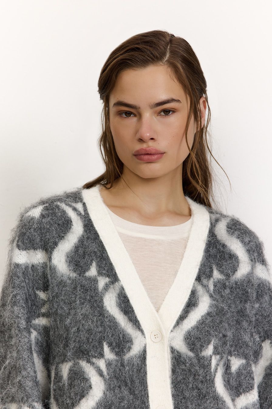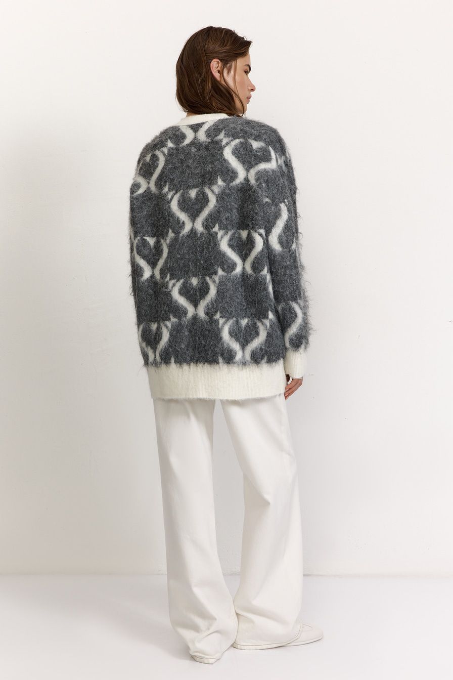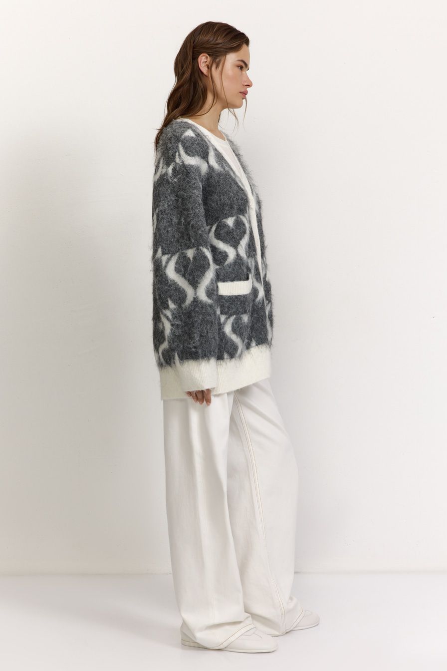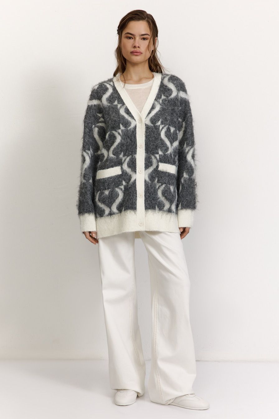 Объемный пушистый кардиган выполнен из смесовой ткани с добавлением переработанного полиэстера. Модель дополнена боковыми карманами и декорирована принтом-монограммой.