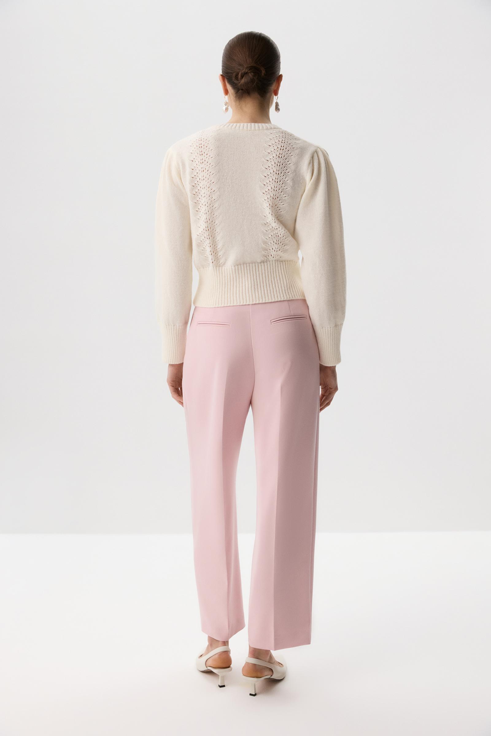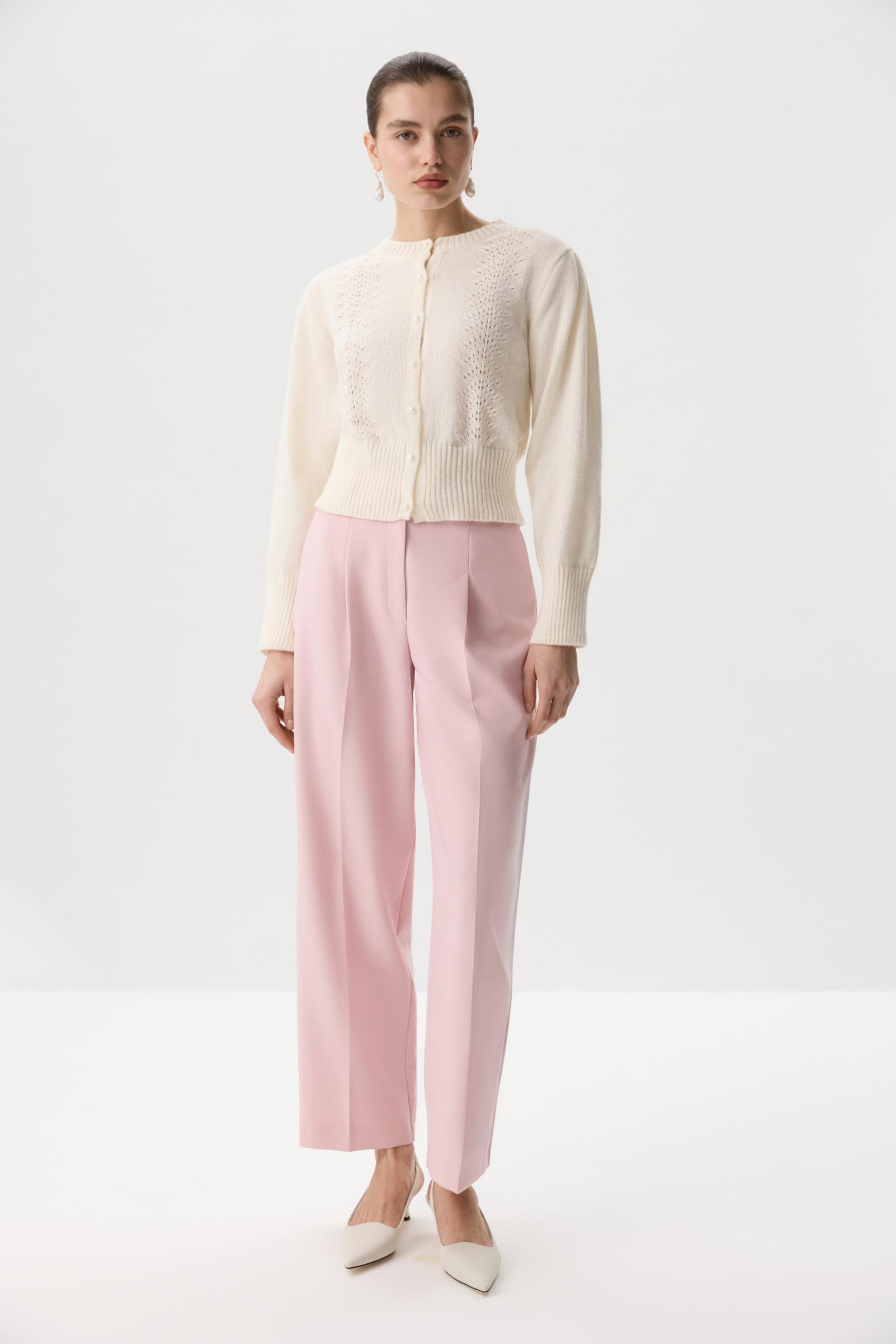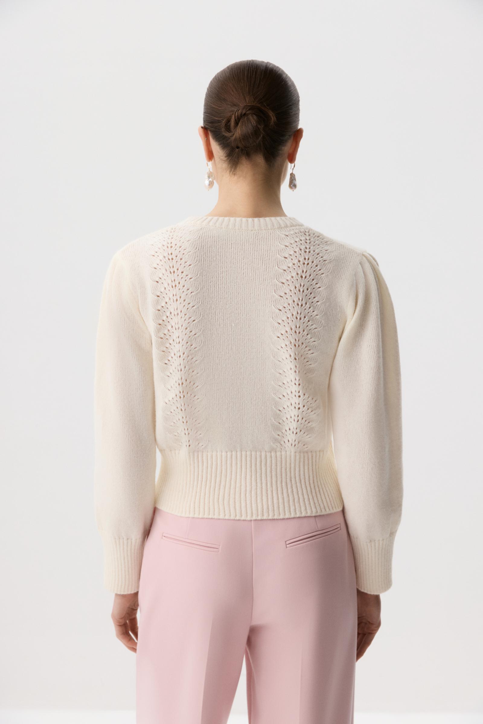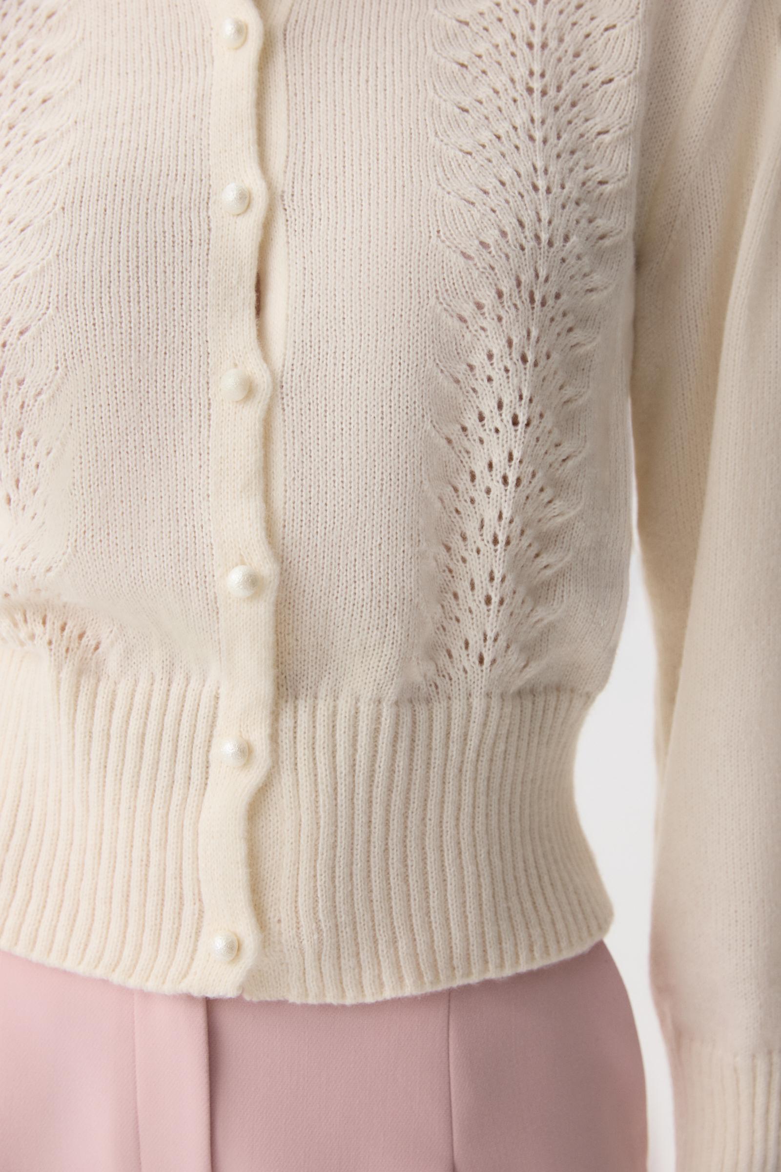 Кардиган с длинными рукавами, дополненный декоративным ажурным узором. Застежка на петли и аккуратные пуговицы - жемчужины в тон изделию, что придает модели игривое настроение и добавляет акцент на детали. Высокий риб по низу изделия сажает его по фигуре и подчеркивает талию.