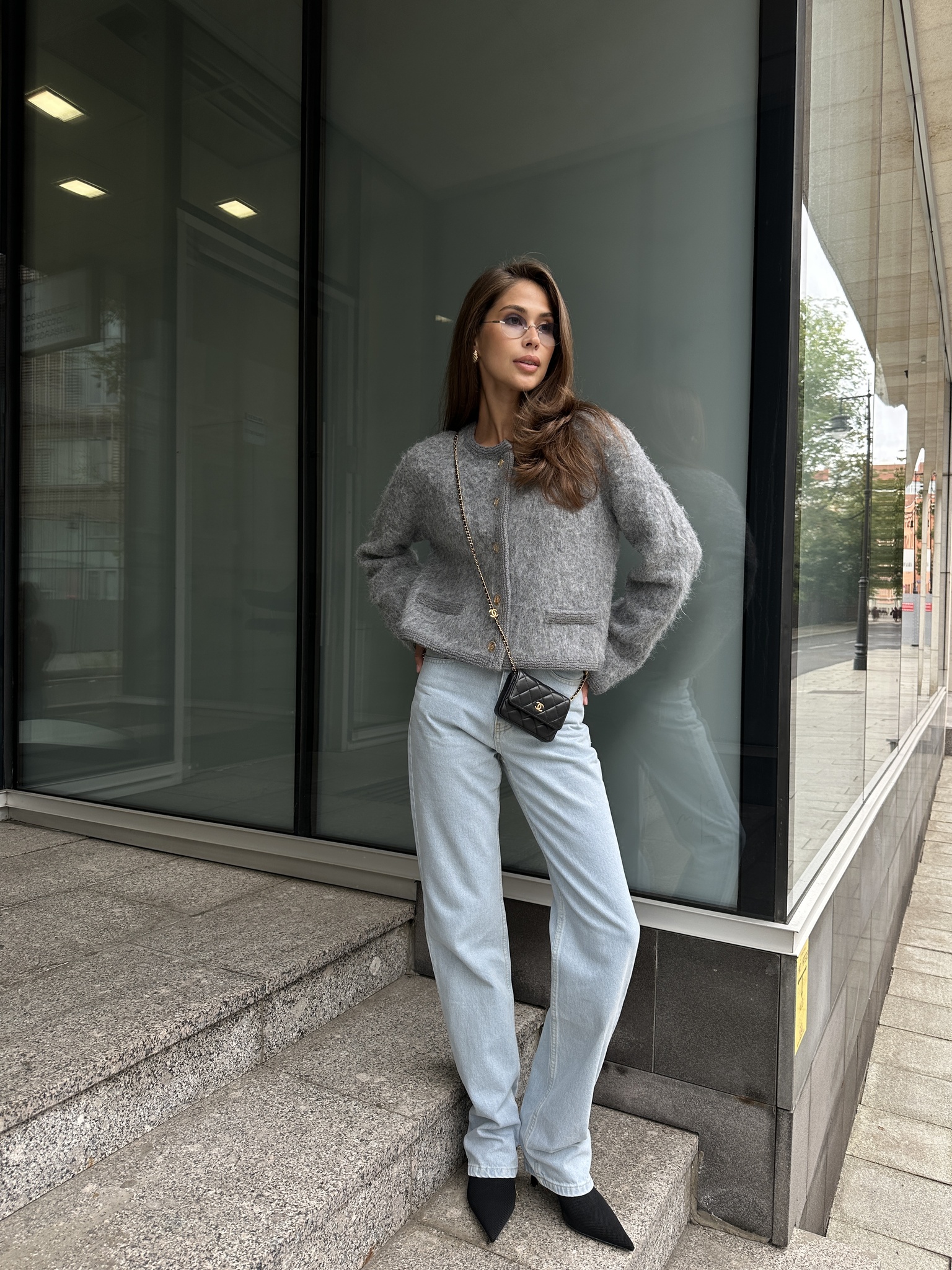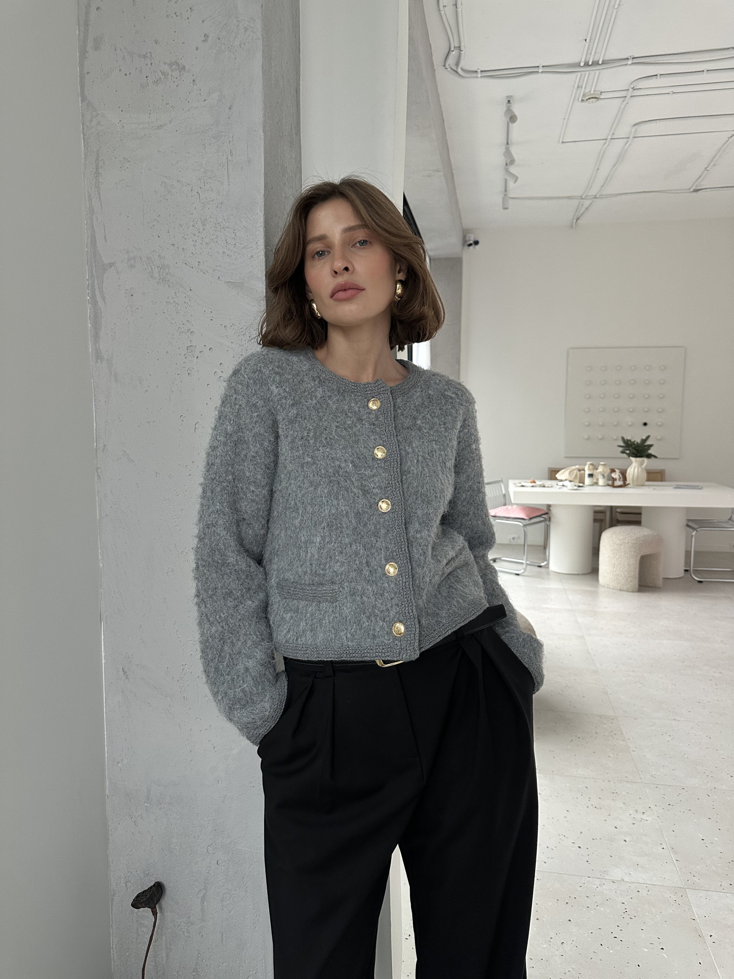 Укороченный кардиган из трикотажа пушистой фактуры с кантом в базовом сером оттенке.