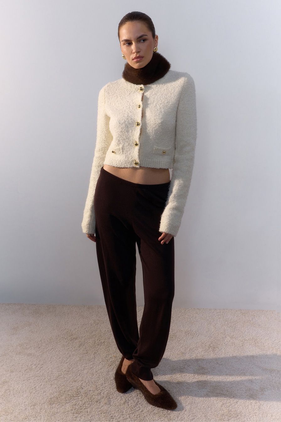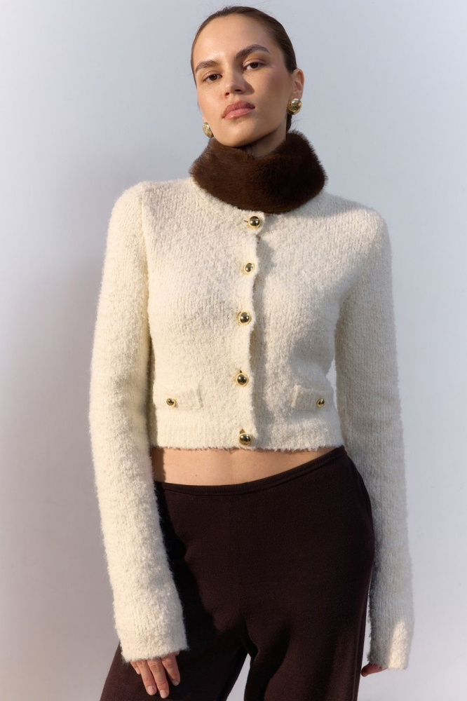 Вязаный укороченный жакет-кардиган молочного цвета выполнен из смесовой буклированной пряжи с добавлением шерсти, дополнен декоративными карманами и застежкой с пуговицами.