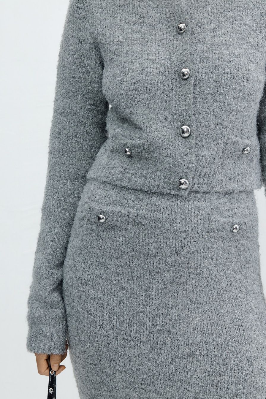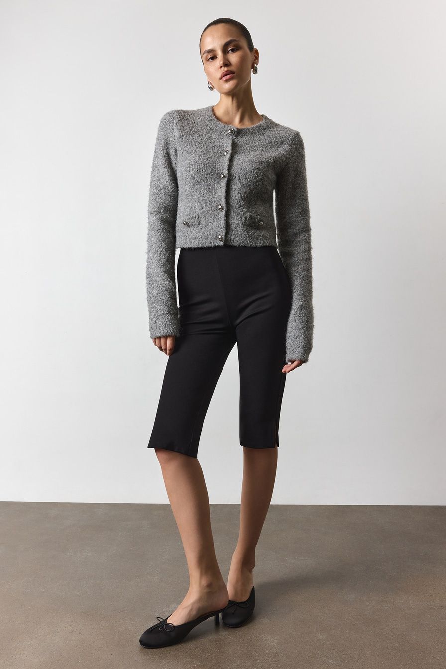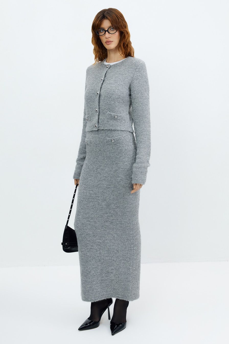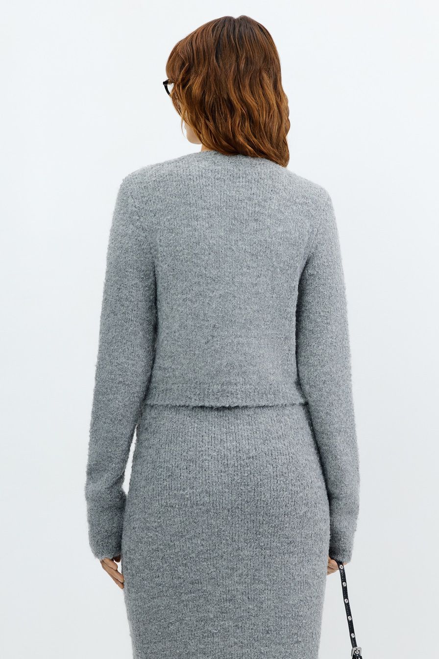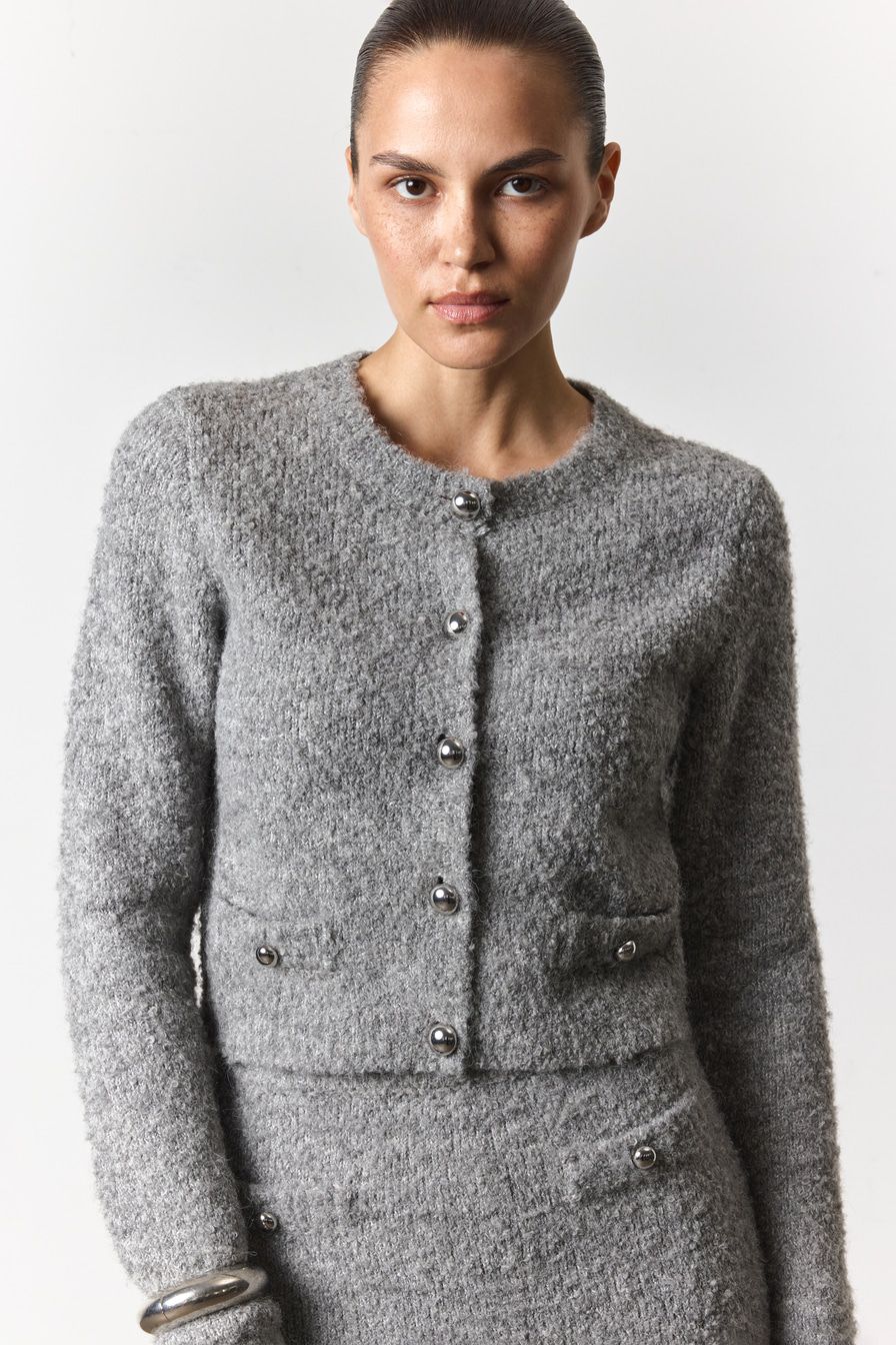 Вязаный укороченный жакет-кардиган серого цвета выполнен из смесовой буклированной пряжи с добавлением шерсти, дополнен декоративными карманами и застежкой с пуговицами.