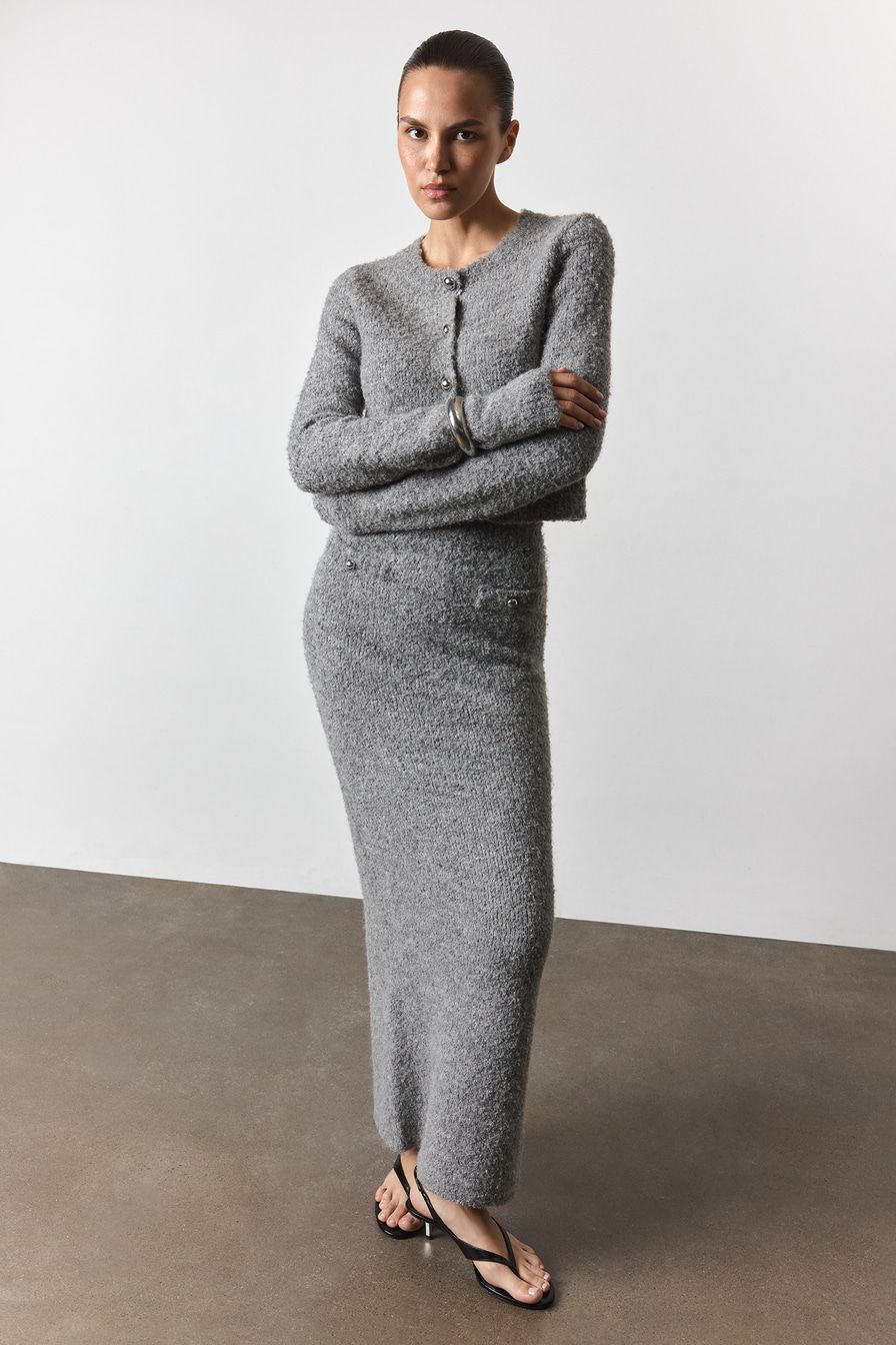 «Для повседневного лука сочетайте жакет с вязаной юбкой из комплекта, меховыми туфлями и небольшой сумкой с короткими ручками».