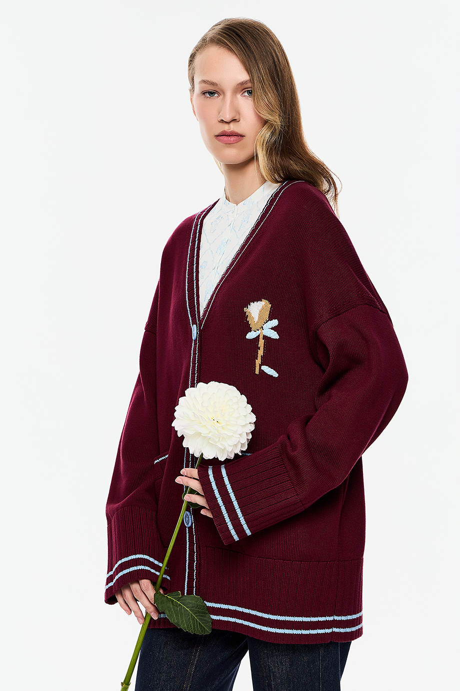Стильный и уютный элемент гардероба, который станет отличным дополнением к вашему образу. Бордовый цвет кардигана добавляет глубину и элегантность, делая его подходящим как для повседневных, так и для более формальных мероприятий.