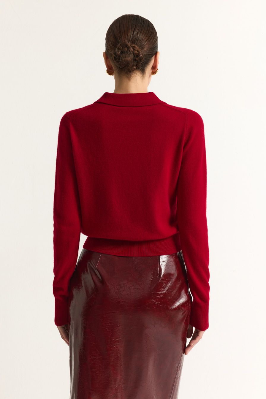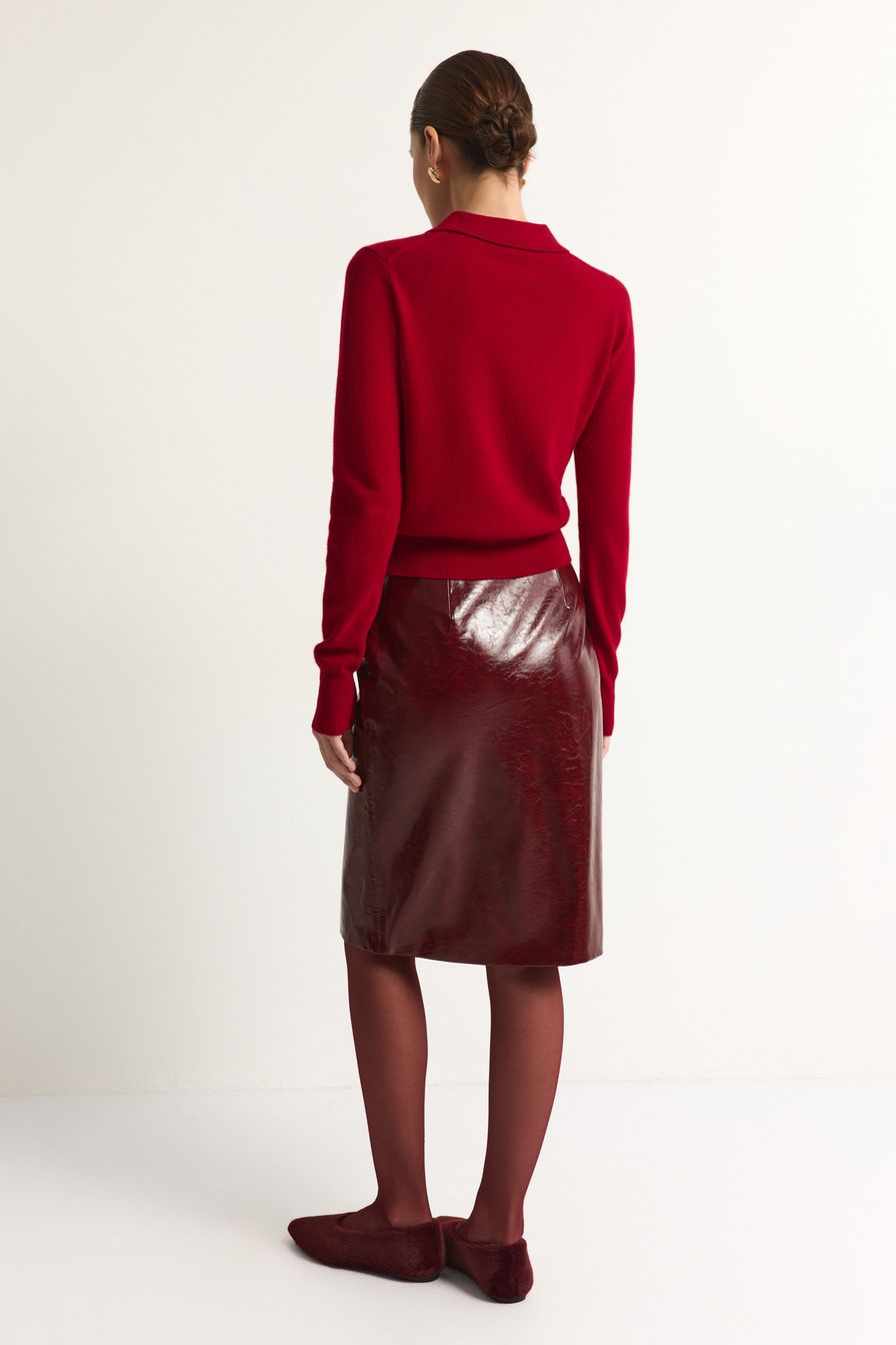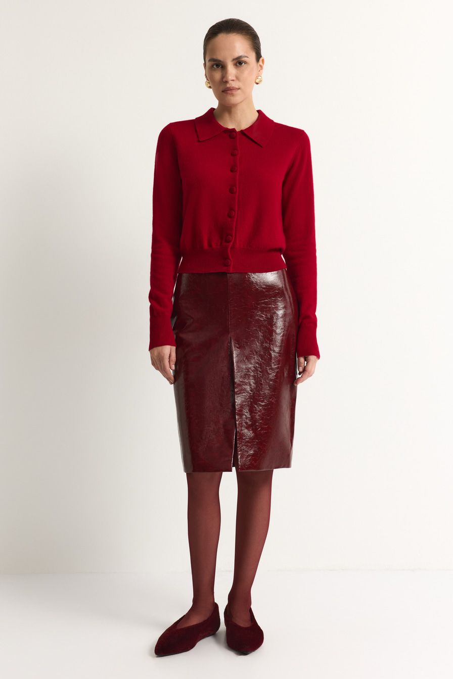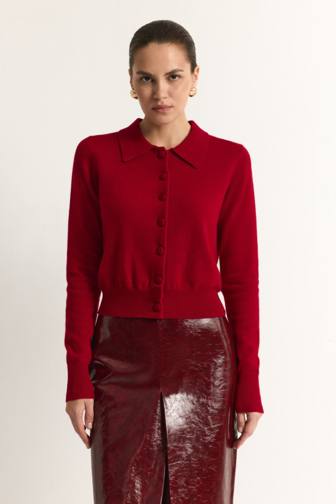 Красный кардиган из 100% шерсти мериноса – модель свободного кроя с застежкой на пуговицы. Кардиган дополнен отложным воротником.