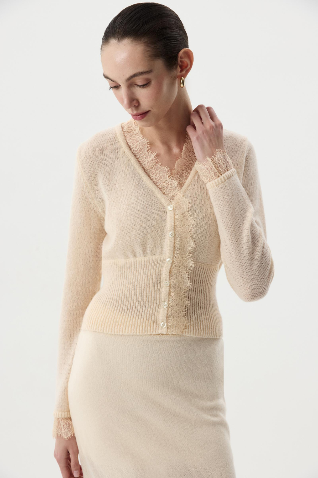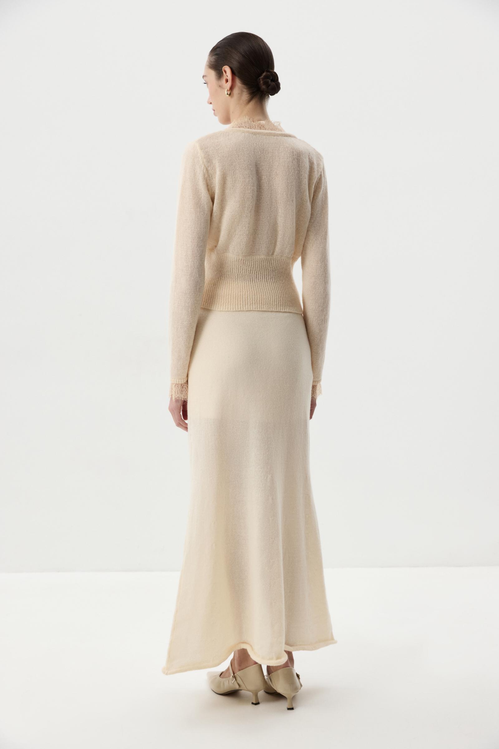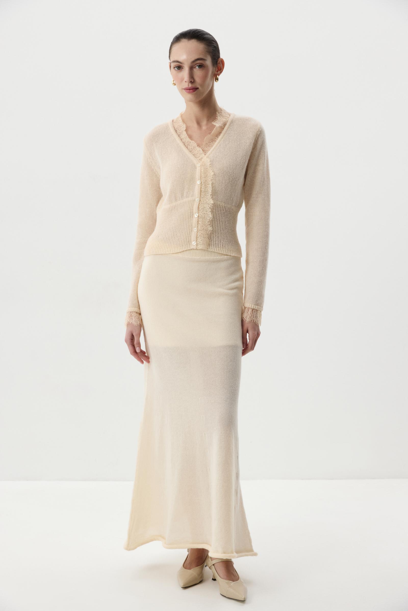 Кардиган из легкой мягкой пряжи с V-вырезом, приталенного силуэта, благодаря широкому рибу по линии низа. Изделие дополнено глубоким V- вырезом, декорировано нежной кружевной отделкой, которая подчеркивает изящный образ. Застежка на петли и пуговицы.