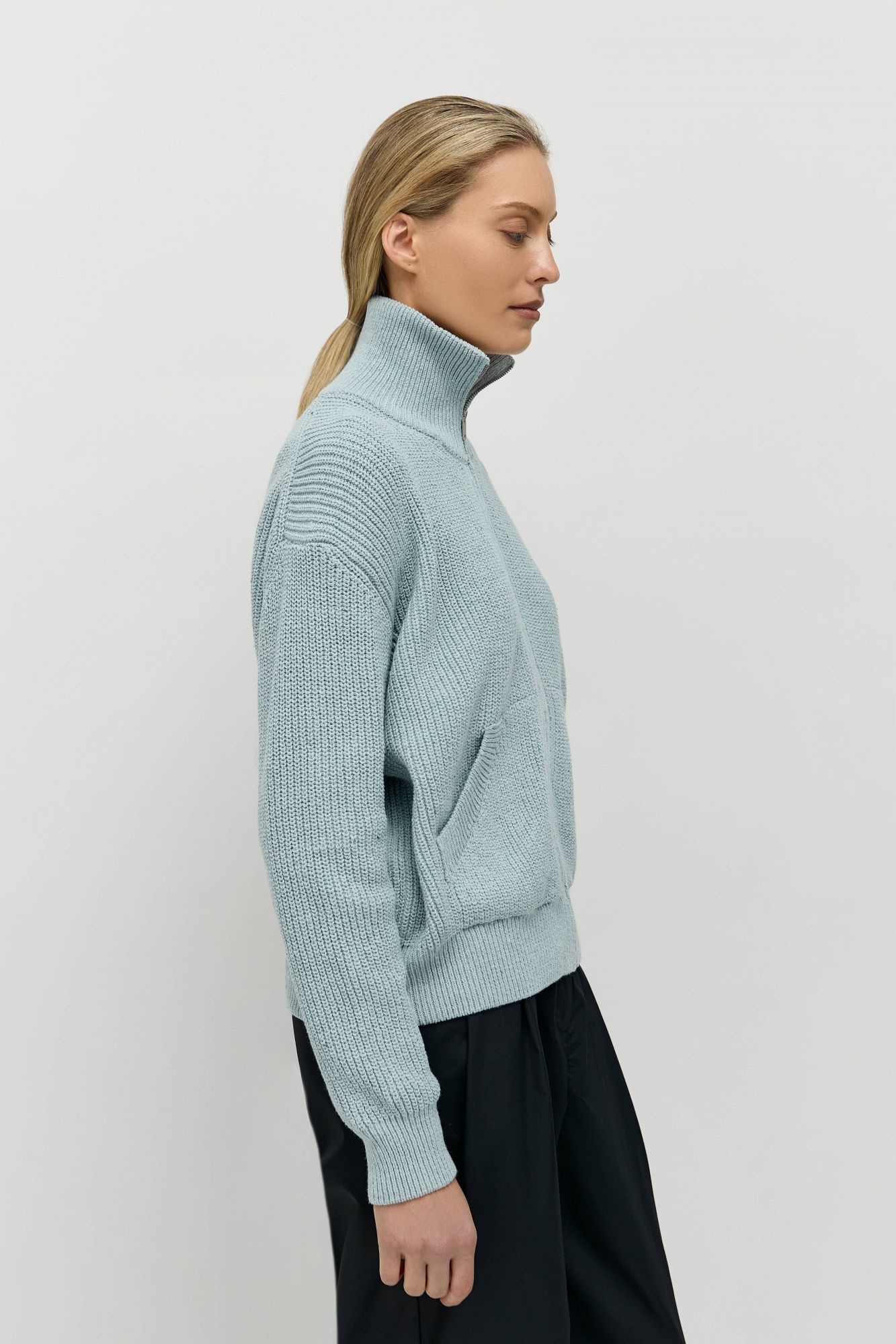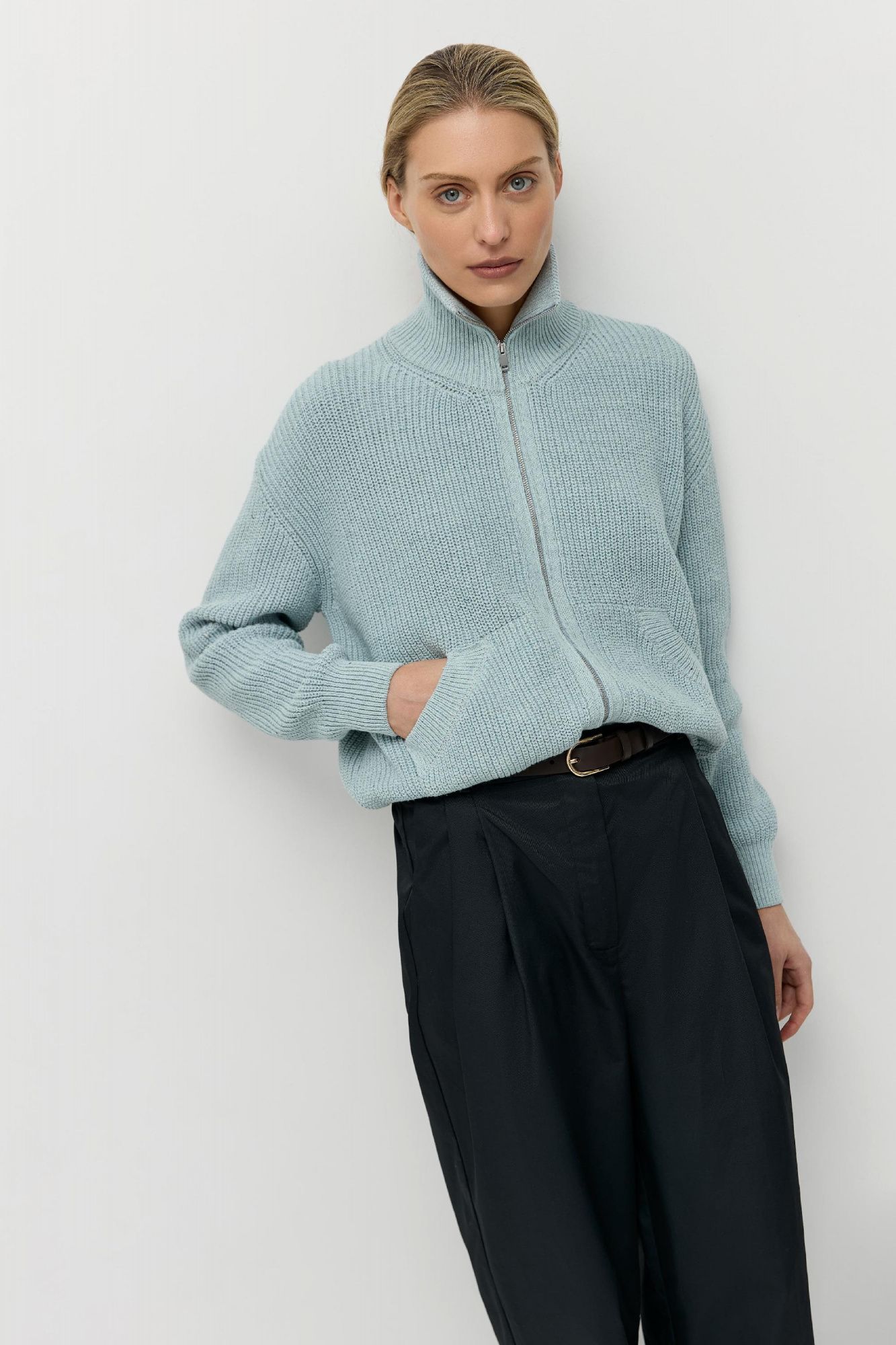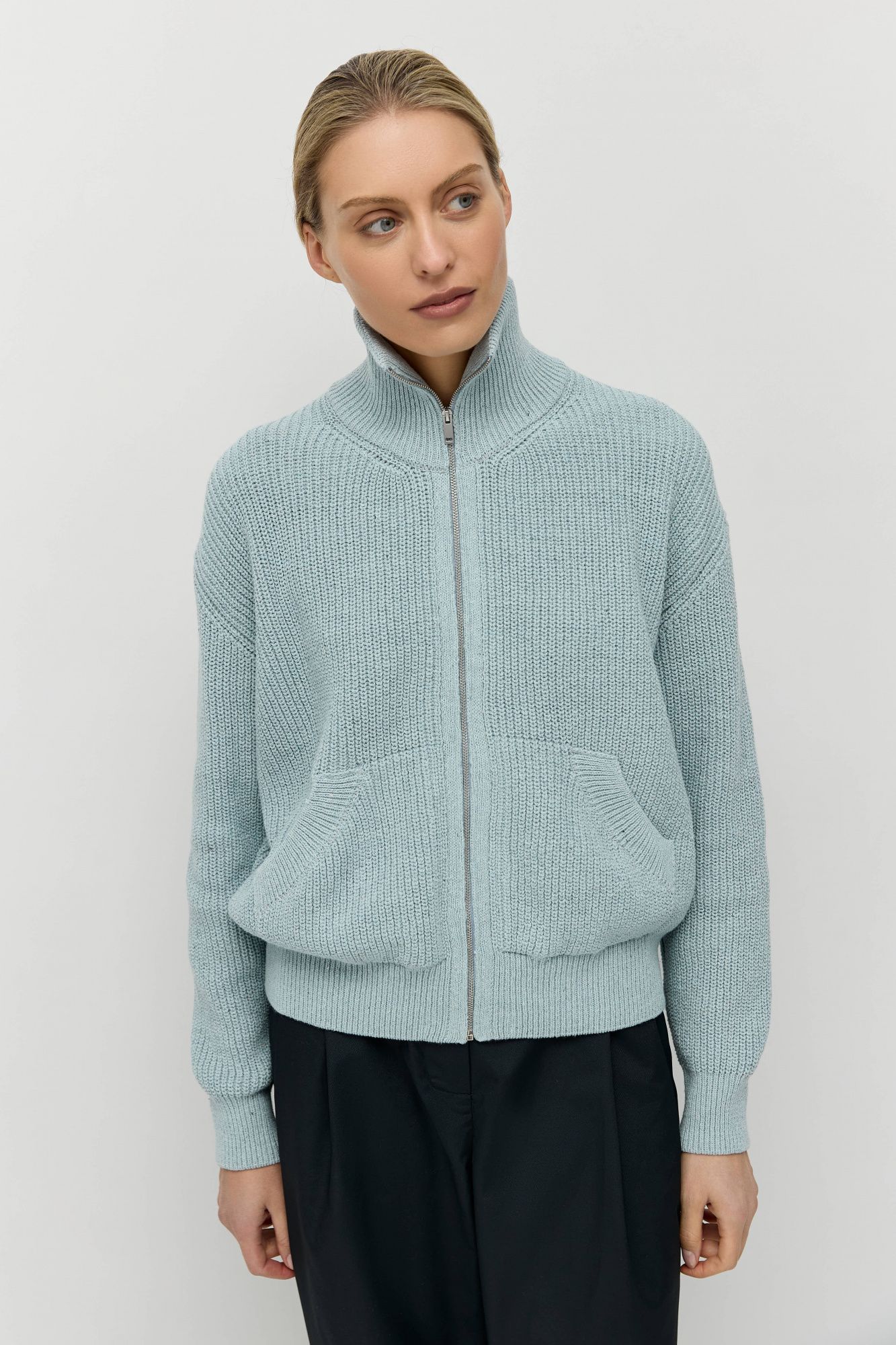 У него плотная пластичная вязка, высокий воротник-стойка, слегка О-образный силуэт и функциональные передние карманы. В весенне-летний сезон кардиган можно носить в качестве верхней одежды.