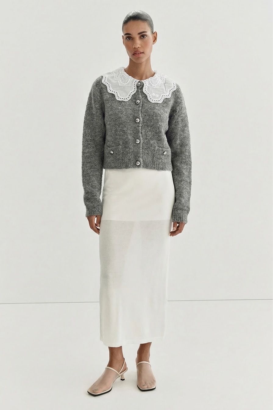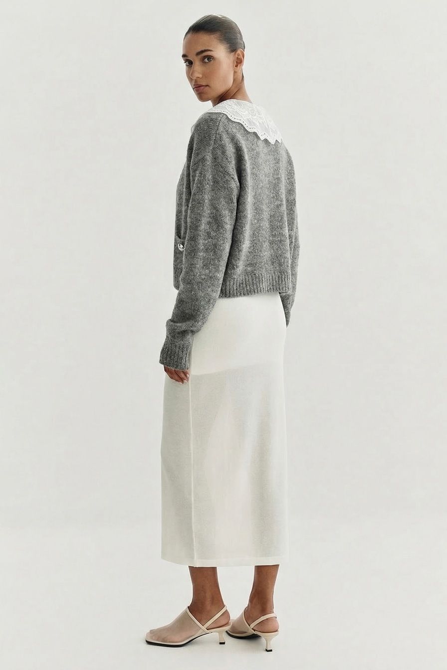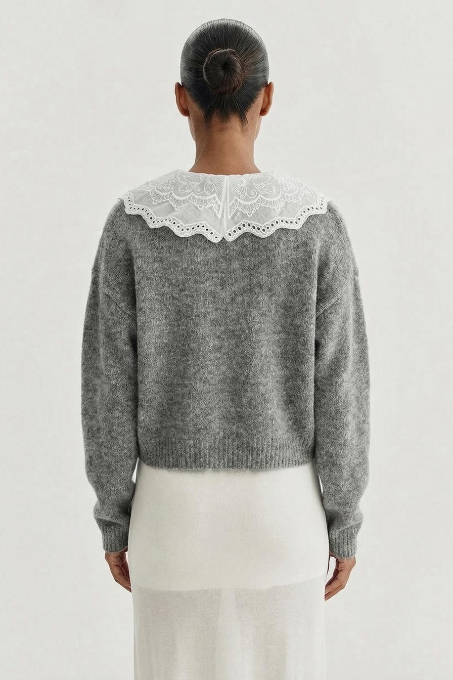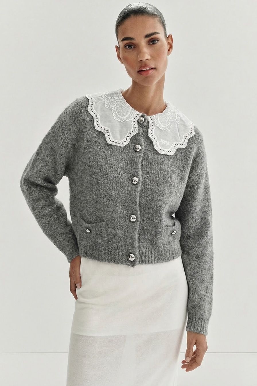 Серый укороченный кардиган свободного кроя выполнен из смесовой ткани с добавлением шерсти. Модель дополнена контрастным воротником с кружевной отделкой.