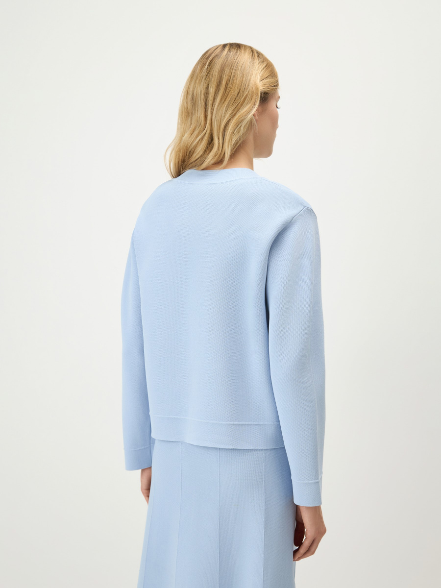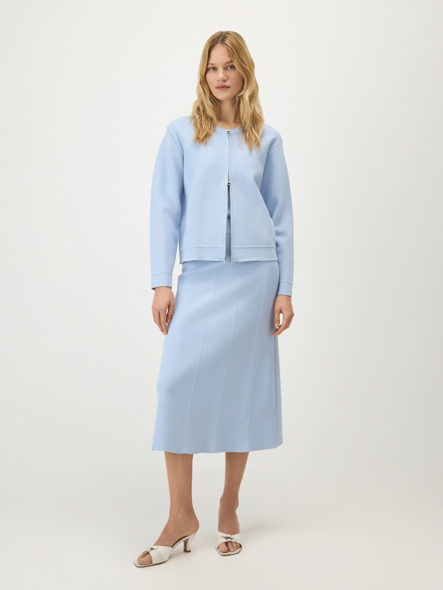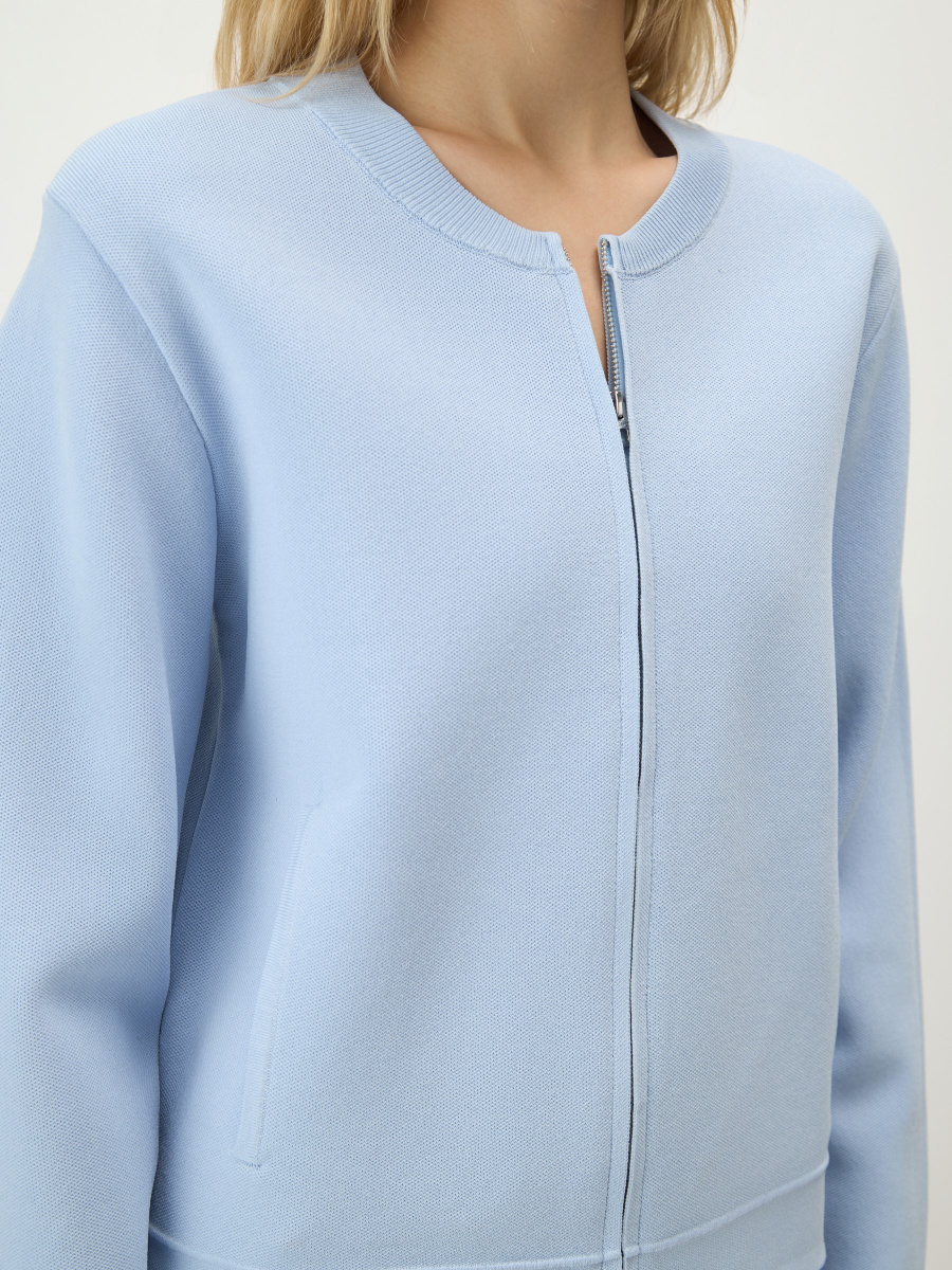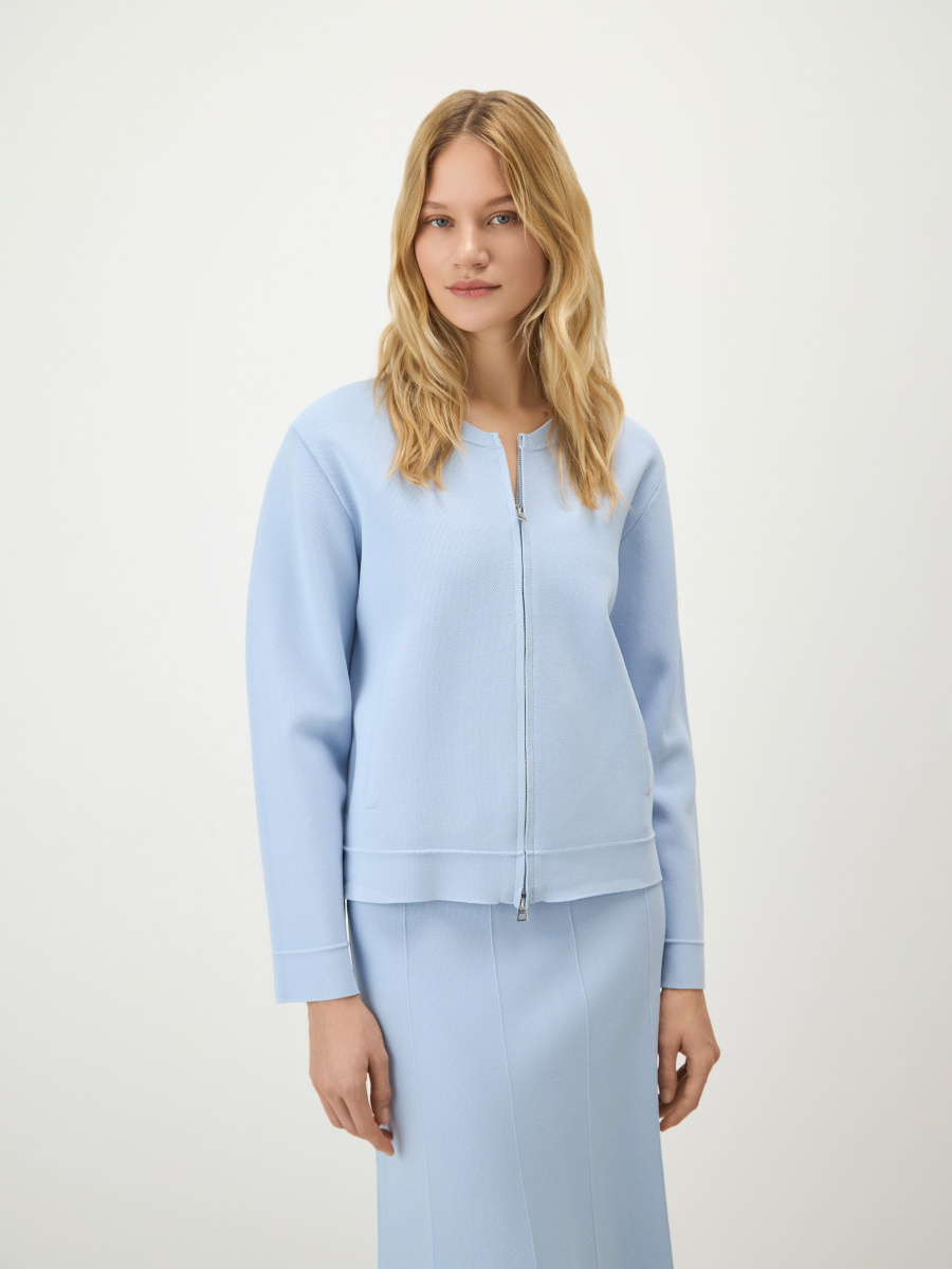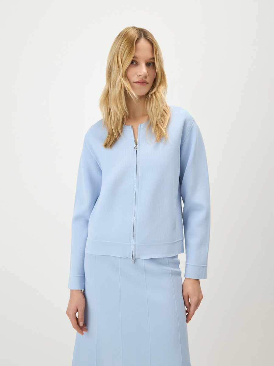 Прямой кардиган среднего облегания из плотного вискозного трикотажа с добавлением нейлона для прочности и насыщенности цвета. Выполнен в универсальной длине до линии бедер, с графичными вязаными линиями по низу и рукавам для структурности и чистоты силуэта. Дополнен двухслойным воротником-резинкой, двухзамковой металлической молнией и боковыми карманами.
