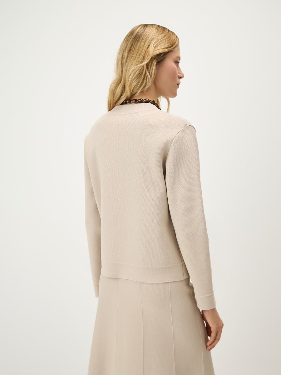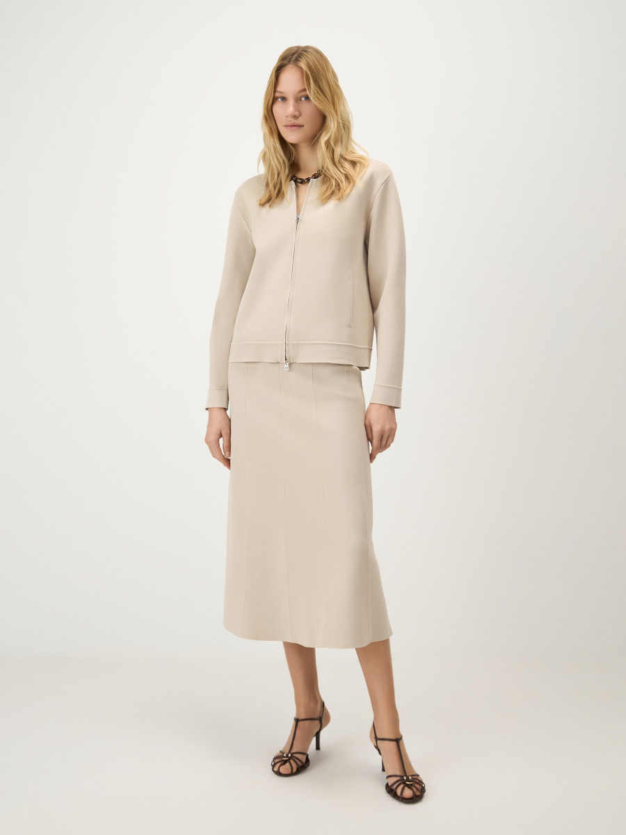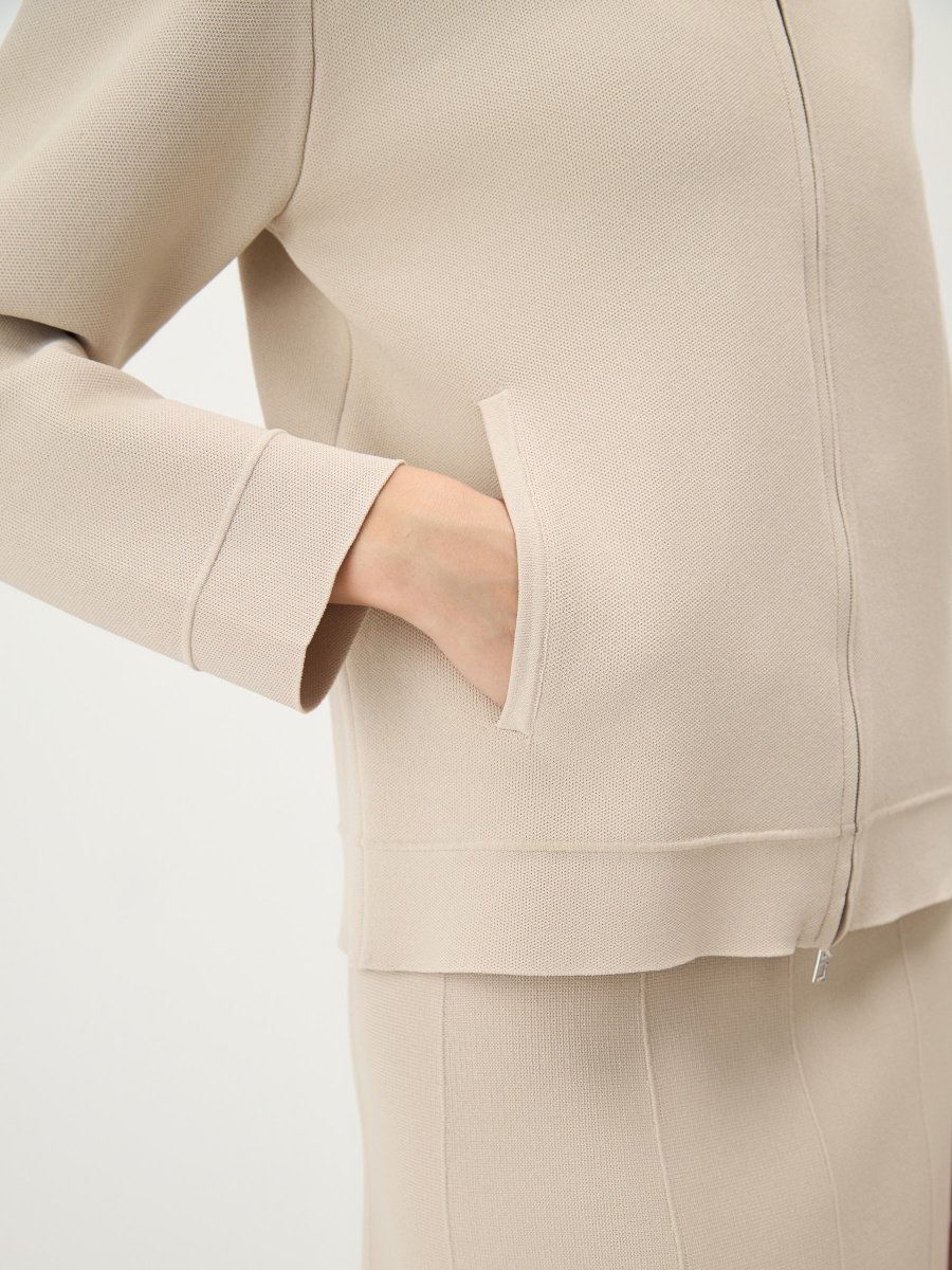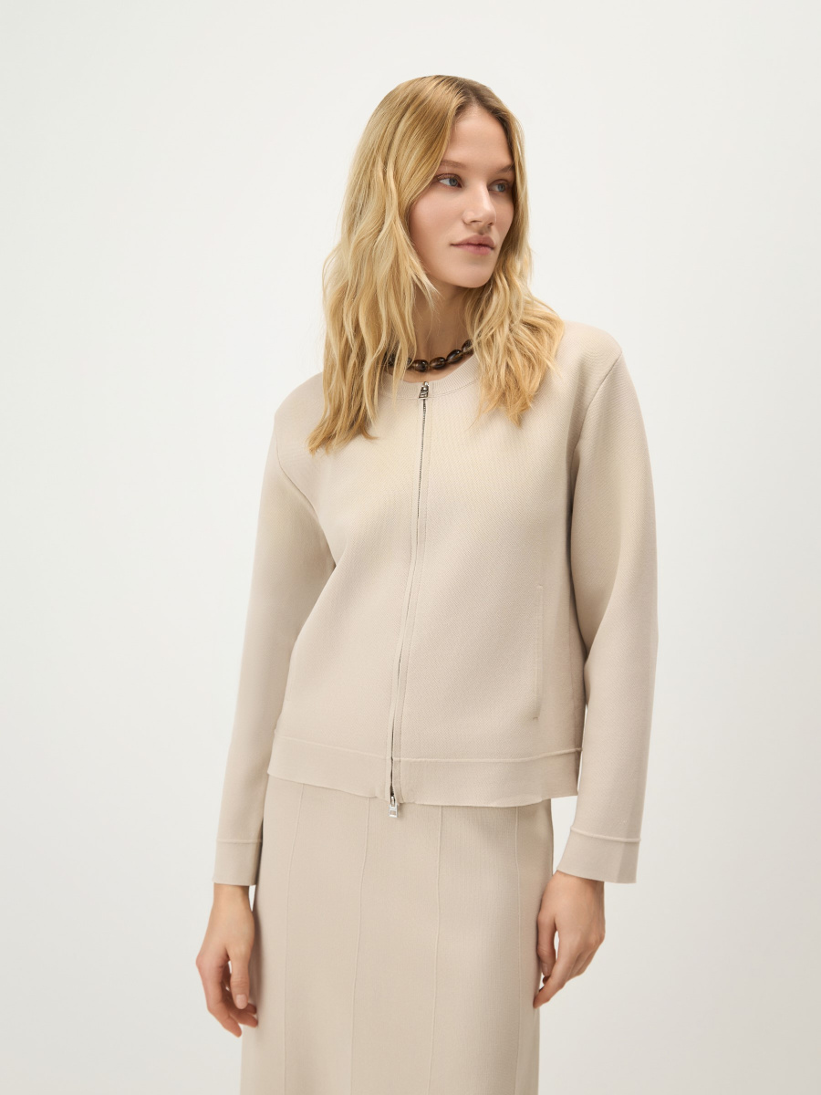 Прямой кардиган среднего облегания из плотного вискозного трикотажа с добавлением нейлона для прочности и насыщенности цвета. Выполнен в универсальной длине до линии бедер, с графичными вязаными линиями по низу и рукавам для структурности и чистоты силуэта. Дополнен двухслойным воротником-резинкой, двухзамковой металлической молнией и боковыми карманами.