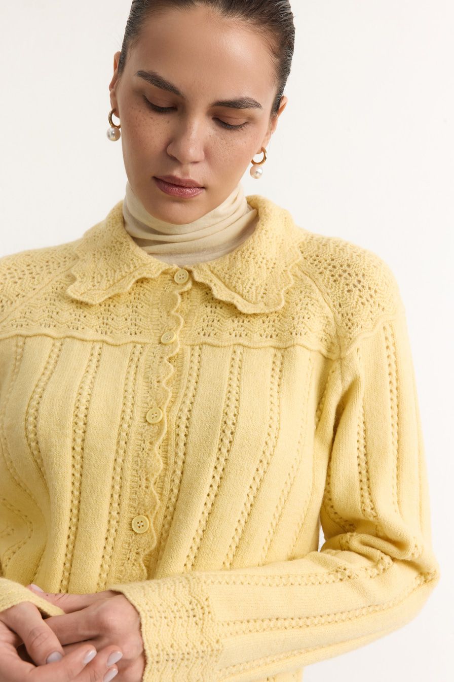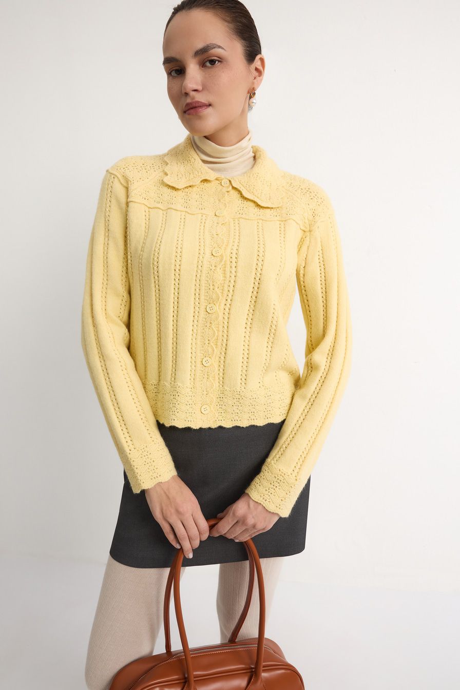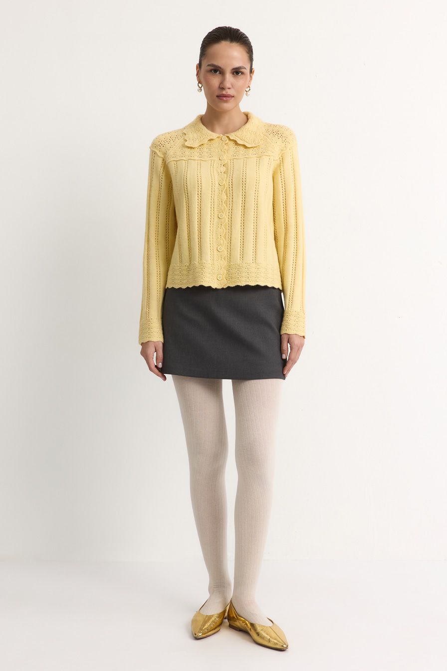 Желтый кардиган ажурной вязки дополнен отложным воротником и декорирован узором «полоска» с перфорацией.