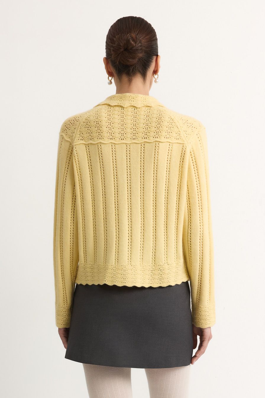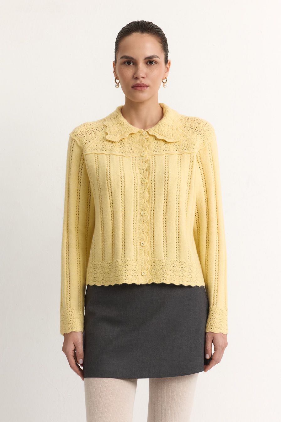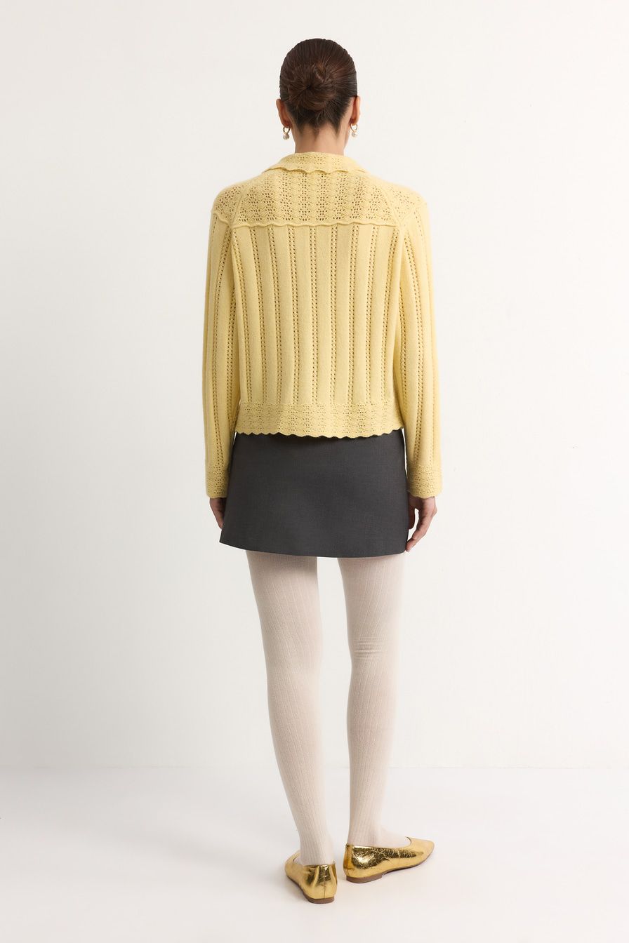 Желтый кардиган ажурной вязки дополнен отложным воротником и декорирован узором «полоска» с перфорацией.