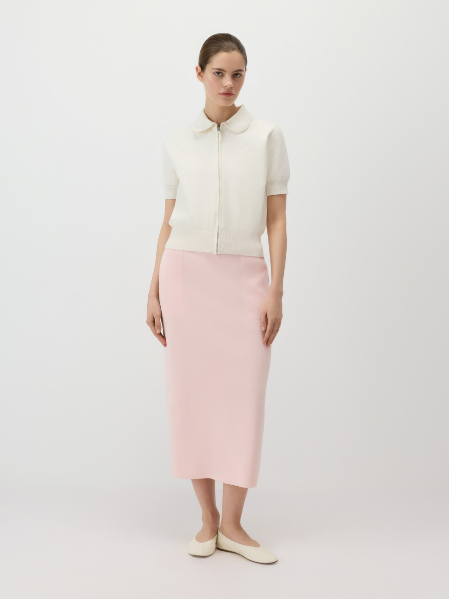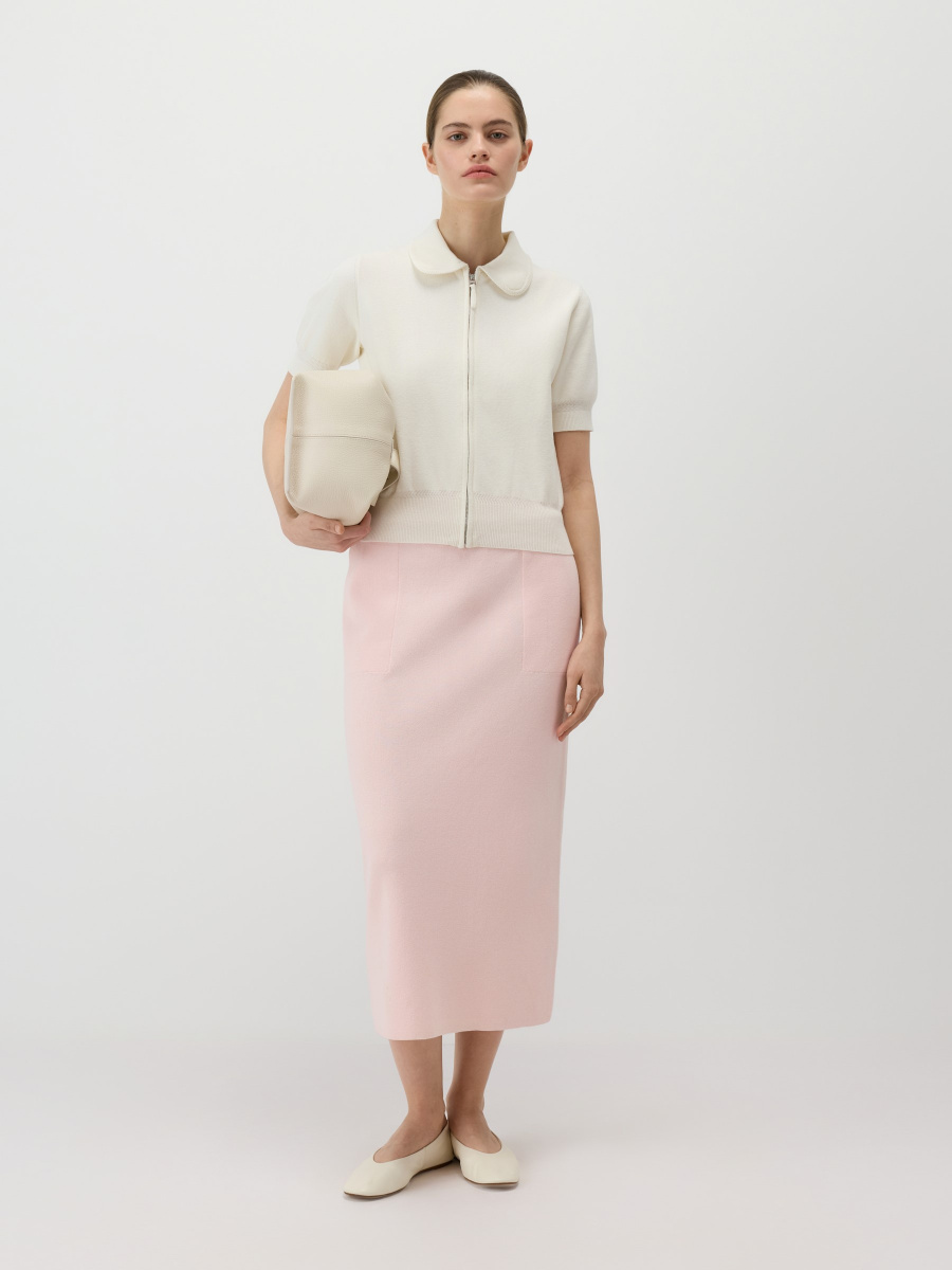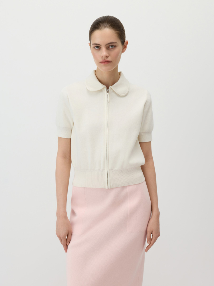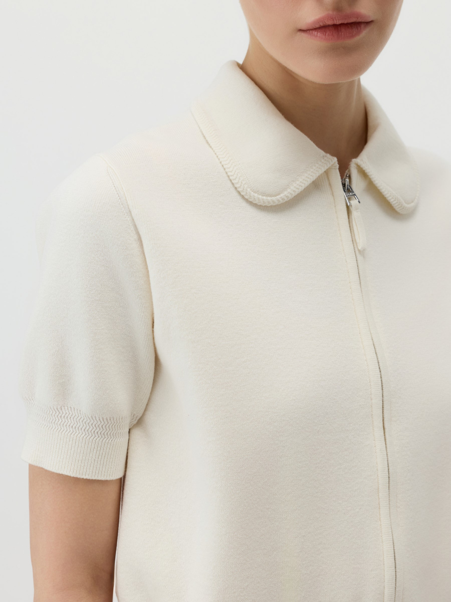 Романтичный укороченный кардиган на молнии подходит для офиса и прогулок. Гладкое тонкое полотно 12 класса из 100% хлопка — легкое и устойчивое к растяжению. Прямой крой, комфортное среднее облегание и слегка расслабленная посадка. Фигурный воротник с декоративной окантовкой придает изделию утонченный блузочный стиль.