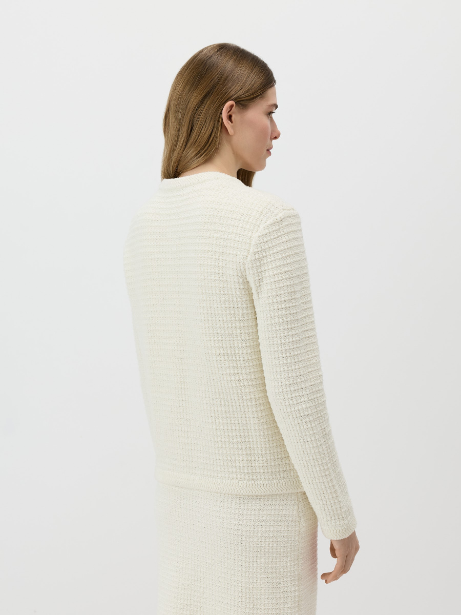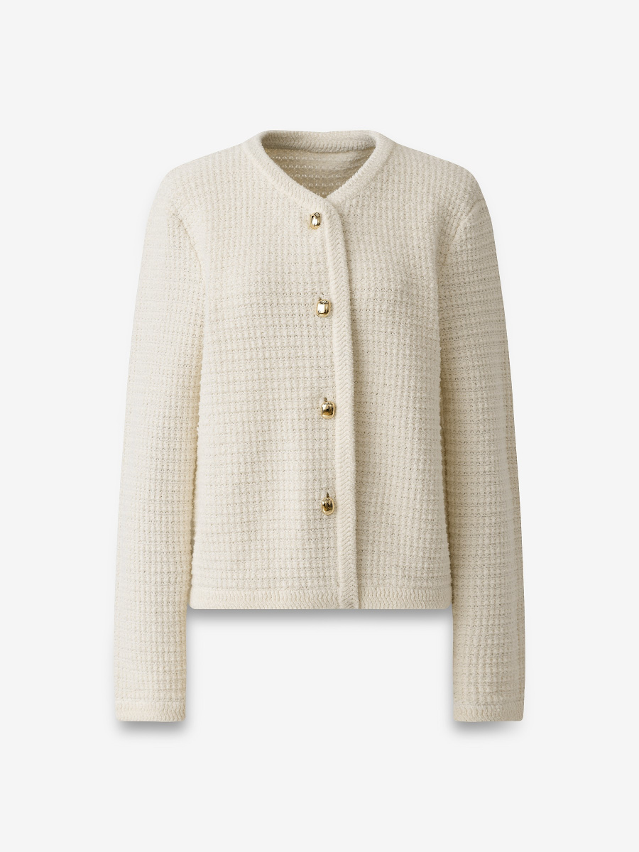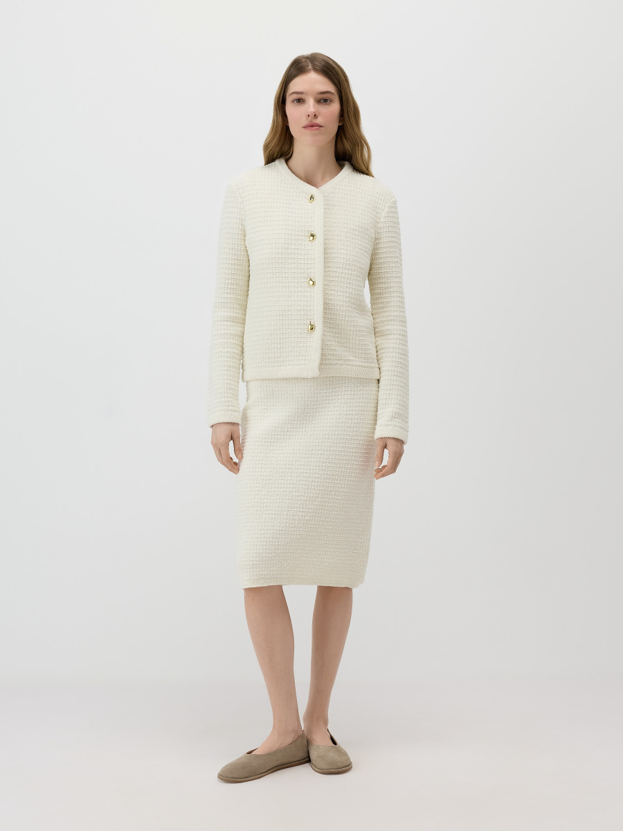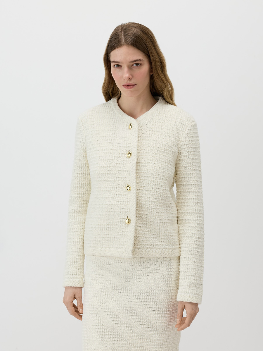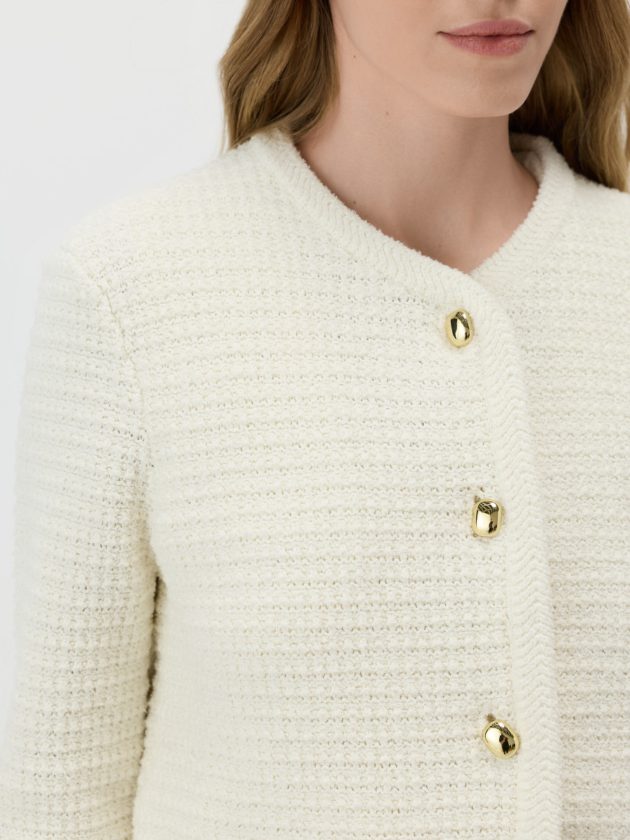 Прямой кардиган с округлым вырезом, мягкой линией плеча и прямыми рукавами. Плотное плетение из хлопковой пряжи букле создает фактурную поверхность и поддерживает форму изделия. Центральная планка оформлена пуговицами под золото, низ и рукава — декоративным вязанием, придающим модели завершенный вид. Длина до линии бедер допускает стилизацию как с юбками, так и с брюками.
