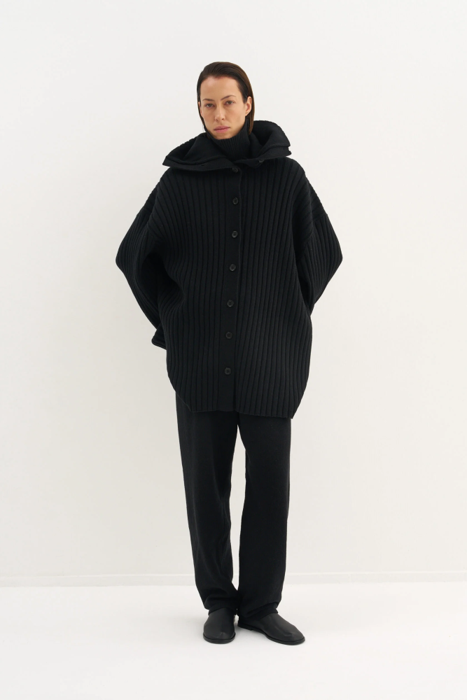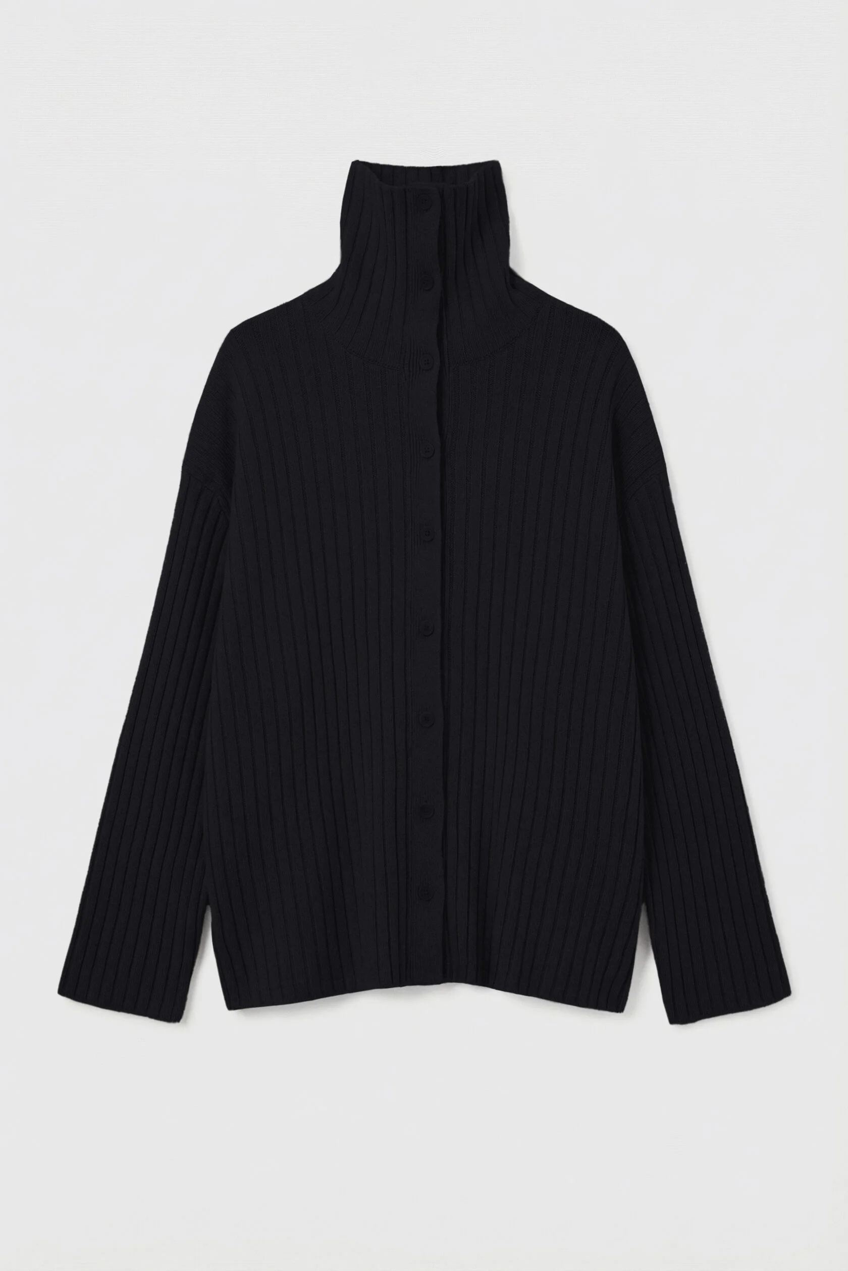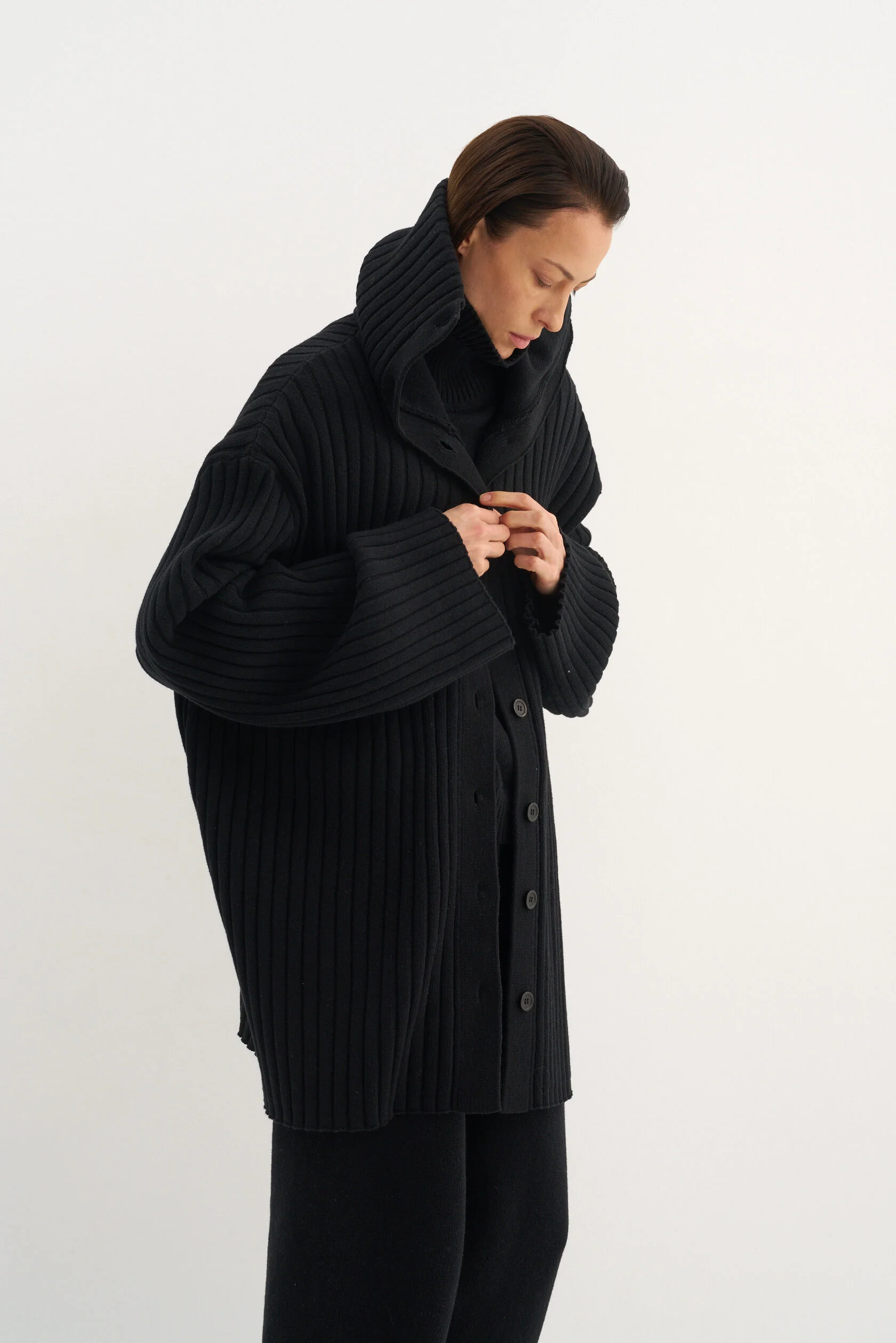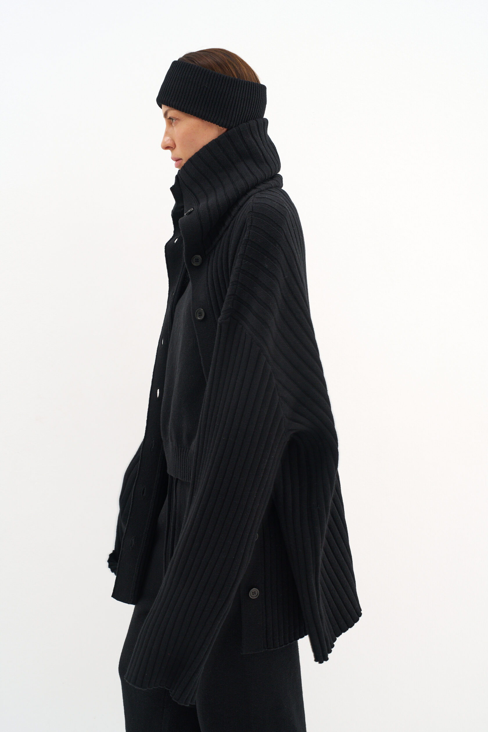 Кардиган свободного кроя задумывался как верхняя одежда на теплую весну, он может заменить куртку или бомбер. Модель выполнена из мягкого хлопка, фактурная вязка держит форму. Свободный силуэт дополнен застежкой на пуговицы и высоким воротником-стойкой, который можно носить поднятым или сложить на плечи.
