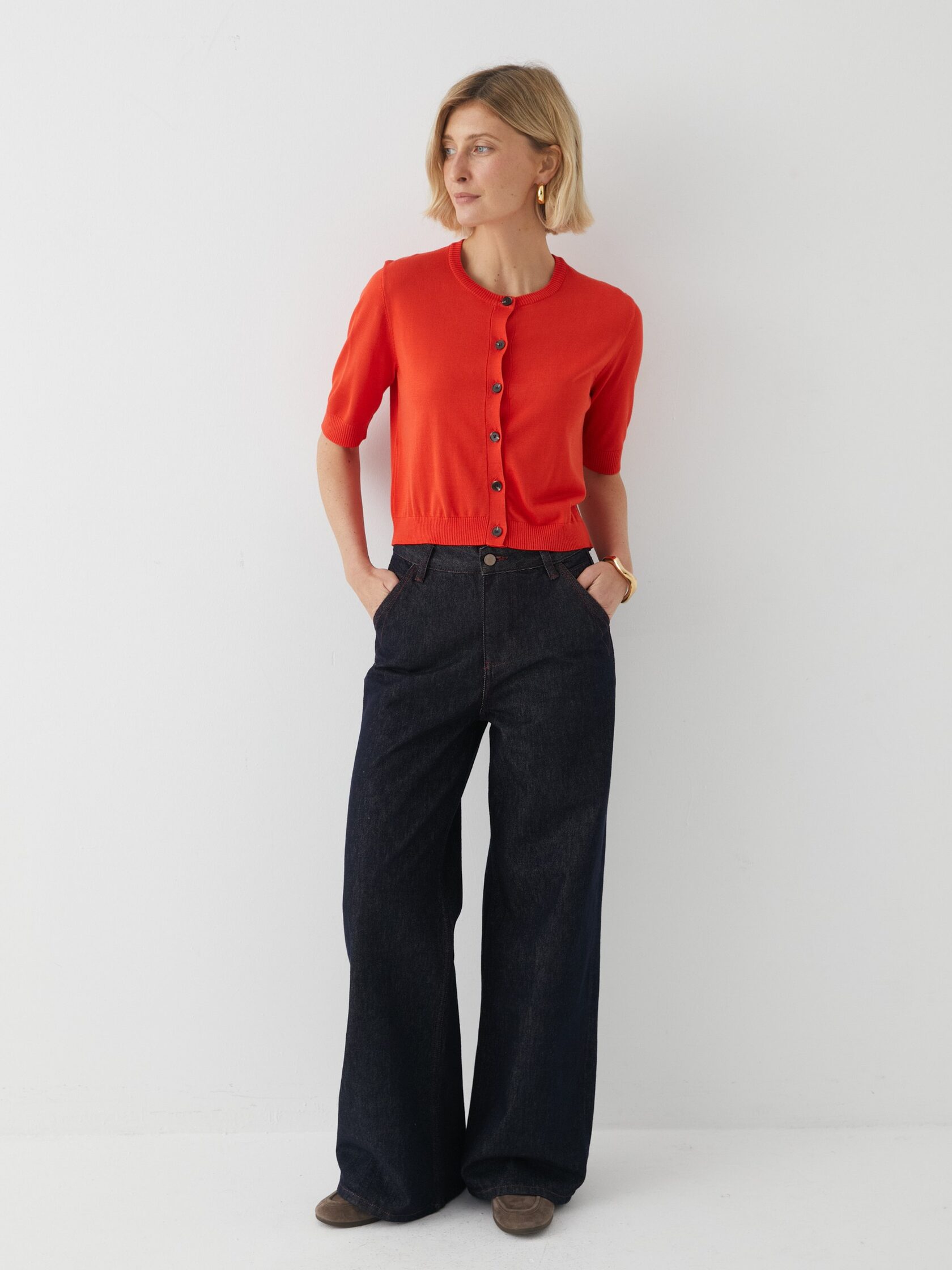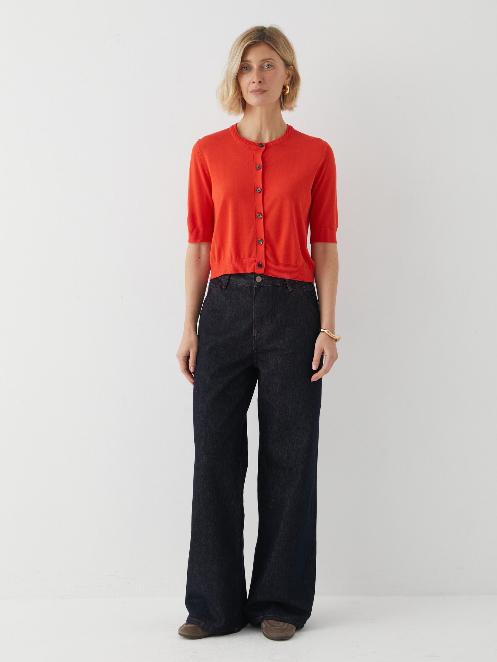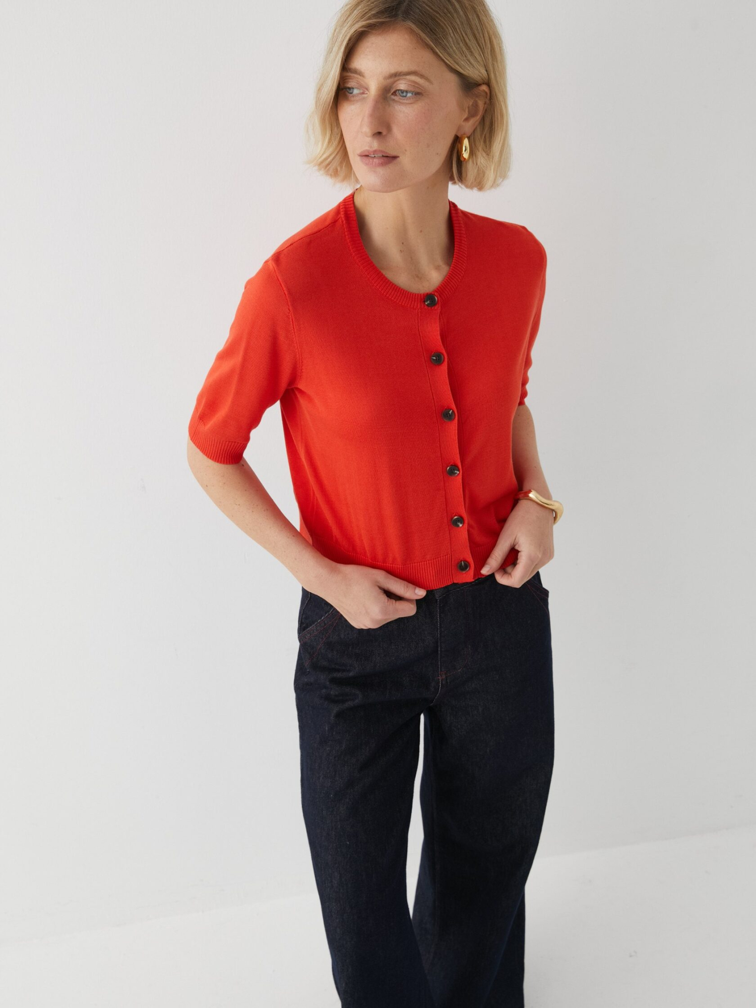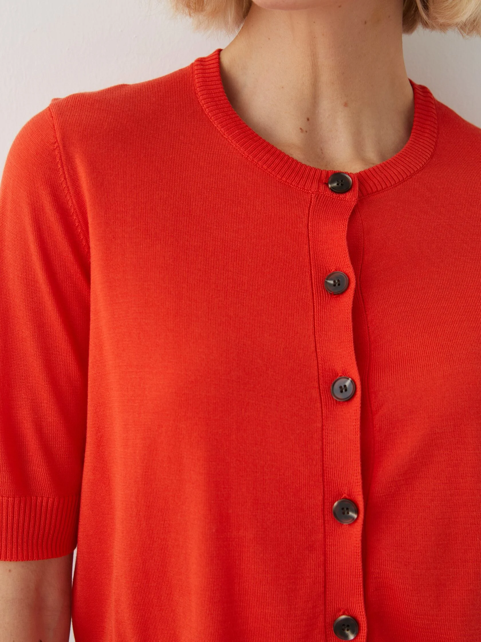 Короткий рукав делает кардиган более лёгким и воздушным, что позволяет сочетать его с различными элементами гардероба. Кардиган может стать как частью повседневного образа, так и элементом более элегантного наряда.