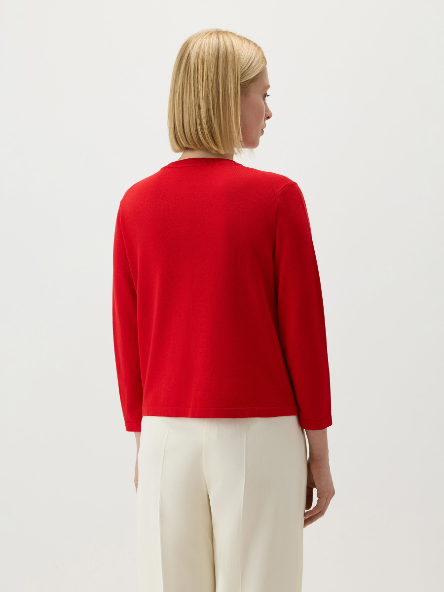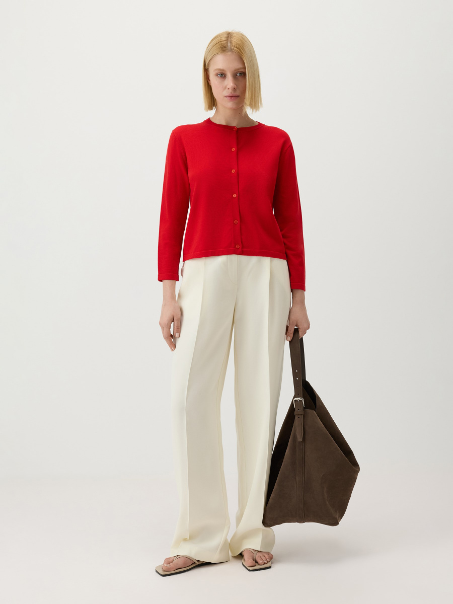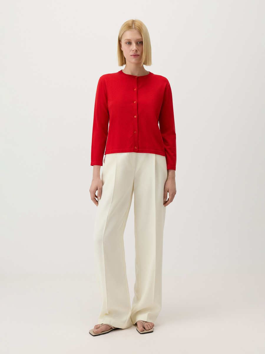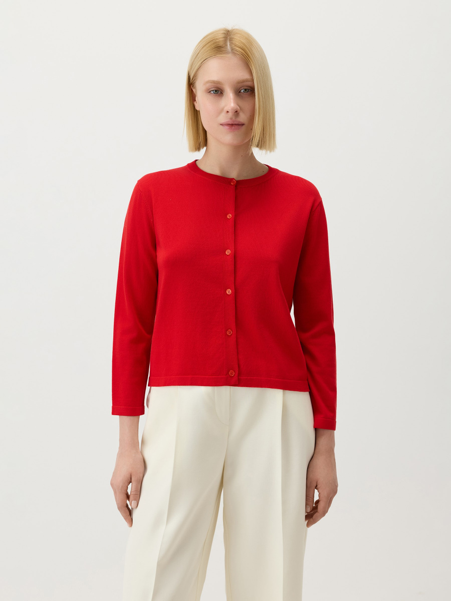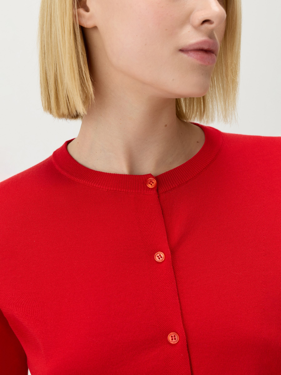 Укороченный кардиган с рукавом 7/8 в гладком плетении. Классическое исполнение: прямой крой, круглый вырез с фактурной обвязкой, втачное плечо для собранного силуэта. Тонкий премиальный трикотаж на основе лиоцелла — "древесного шелка" — свободно дышит, сохраняет исходную форму и почти не мнется. Дополнен мелкими пуговицами с перламутровыми переливами.
