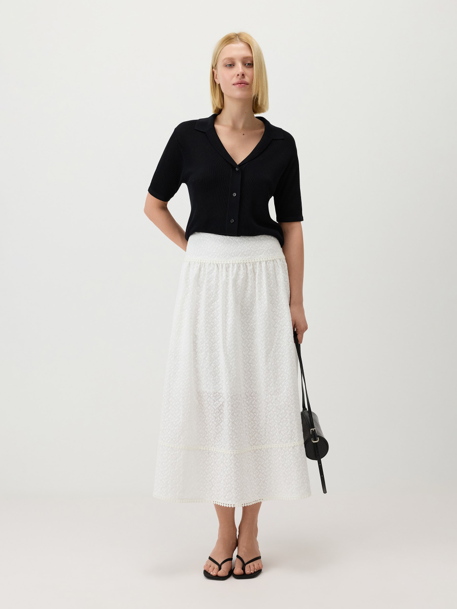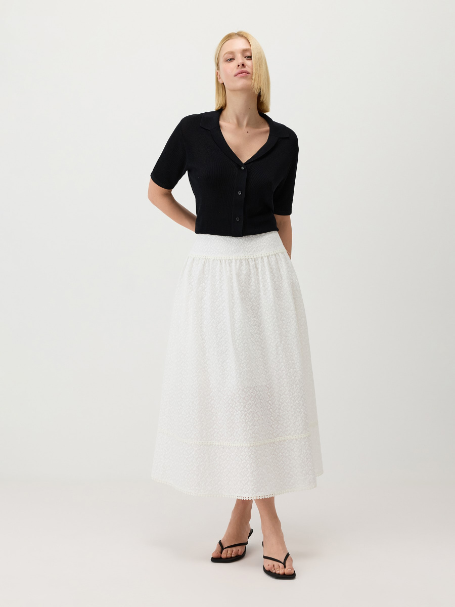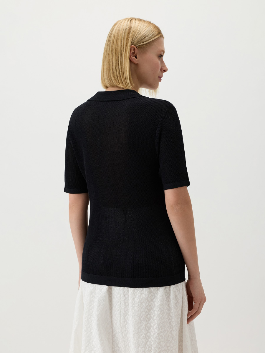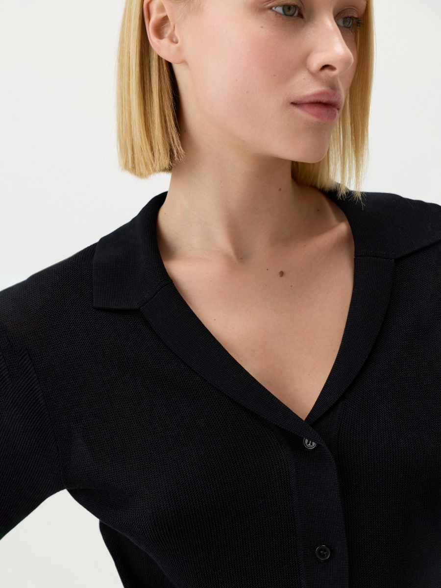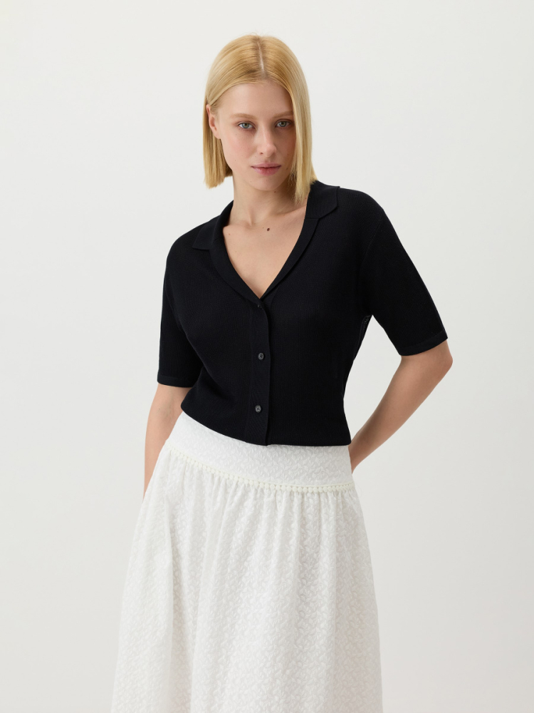 Прямой кардиган среднего объема с английским воротником, образующим неглубокий вырез. Фактурное полотно в вертикальную полоску выполнено из лиоцелла — “древесного шелка” — мягкого, воздушного и прочного материала . Низ и рукава оформлены тубулярной отделкой для четкого контура.