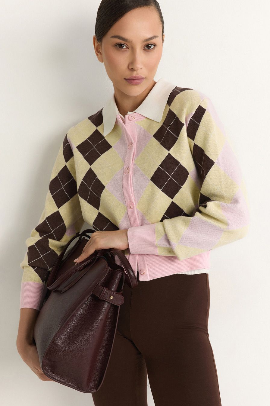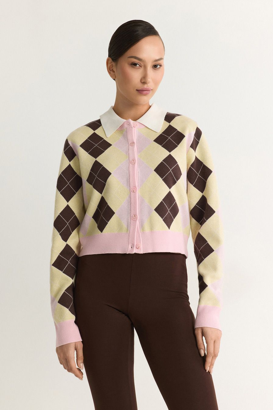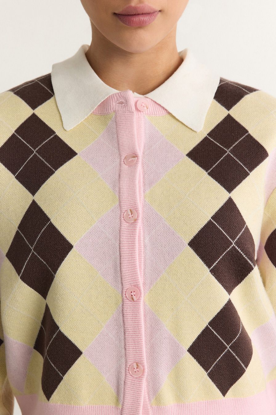 Укороченный кардиган свободного кроя выполнен из смесовой вискозы и декорирован принтом «аргайл».
