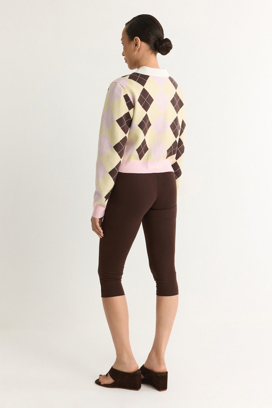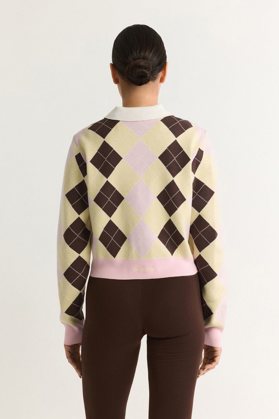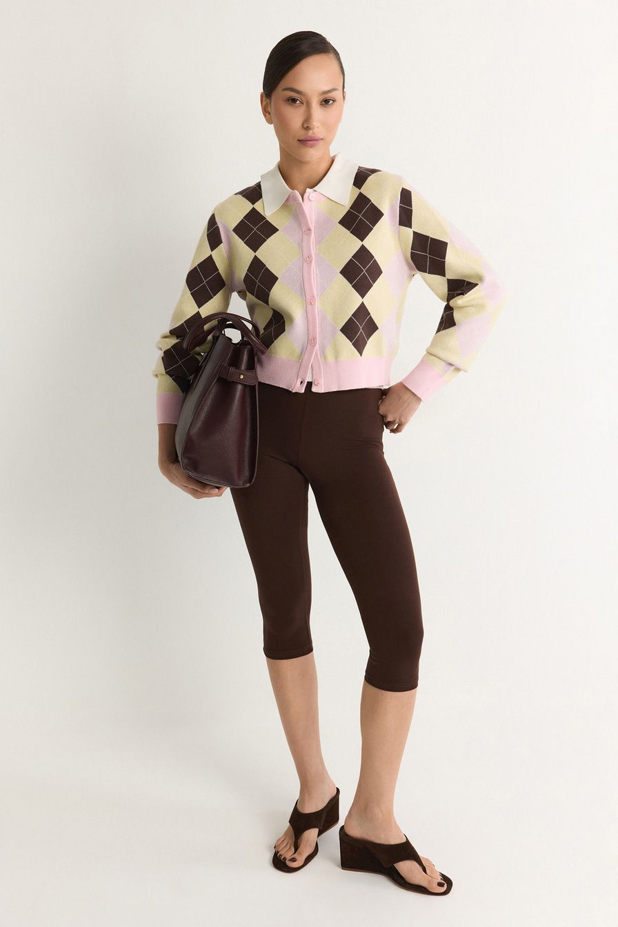 Укороченный кардиган свободного кроя выполнен из смесовой вискозы и декорирован принтом «аргайл».