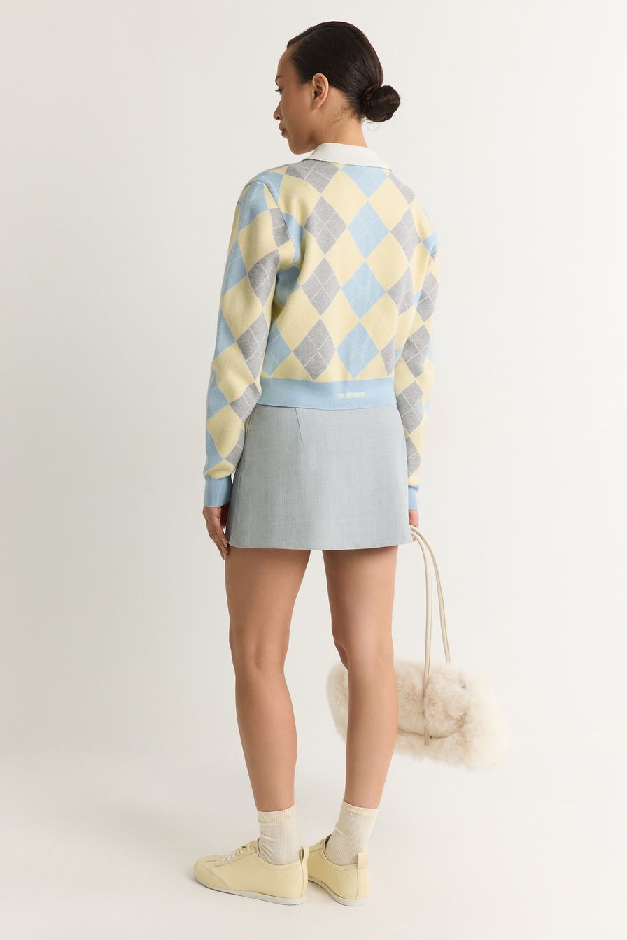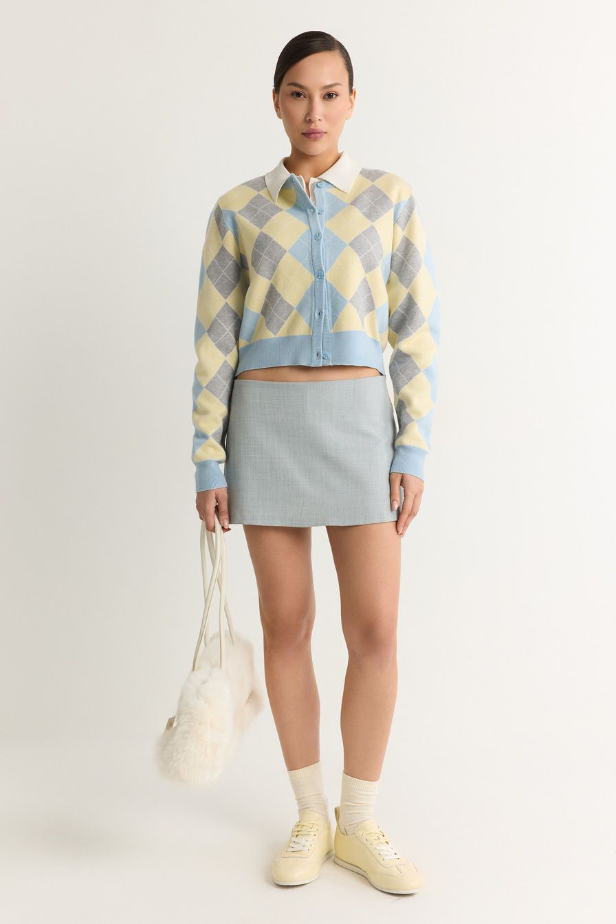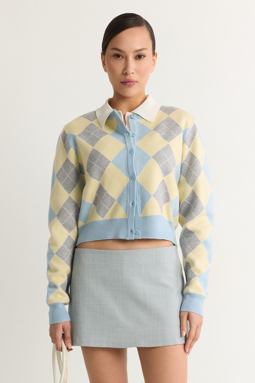 Укороченный кардиган свободного кроя выполнен из смесовой вискозы и декорирован принтом «аргайл».