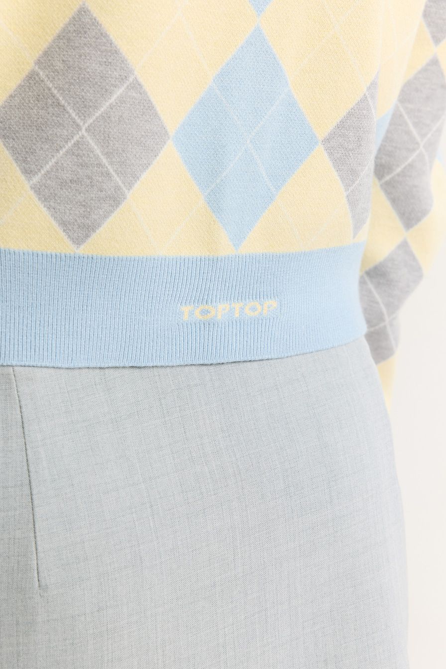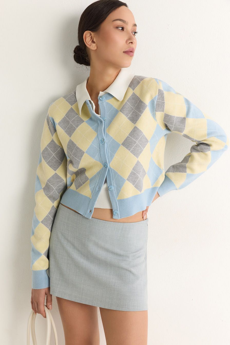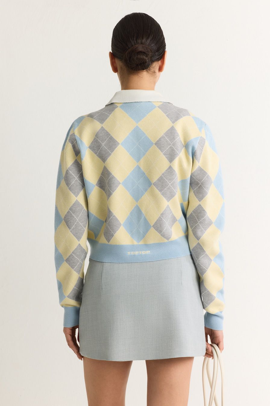 Укороченный кардиган свободного кроя выполнен из смесовой вискозы и декорирован принтом «аргайл».