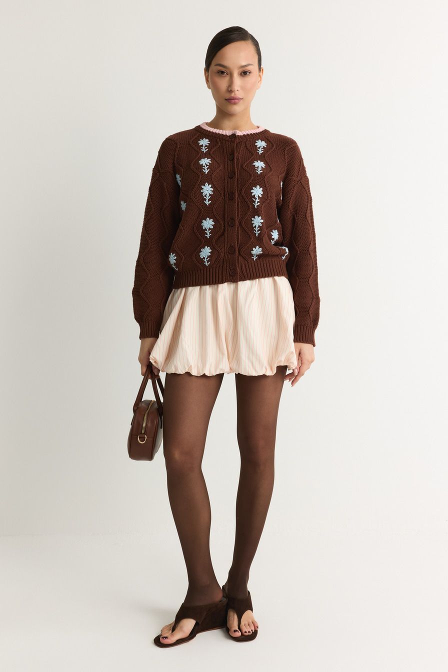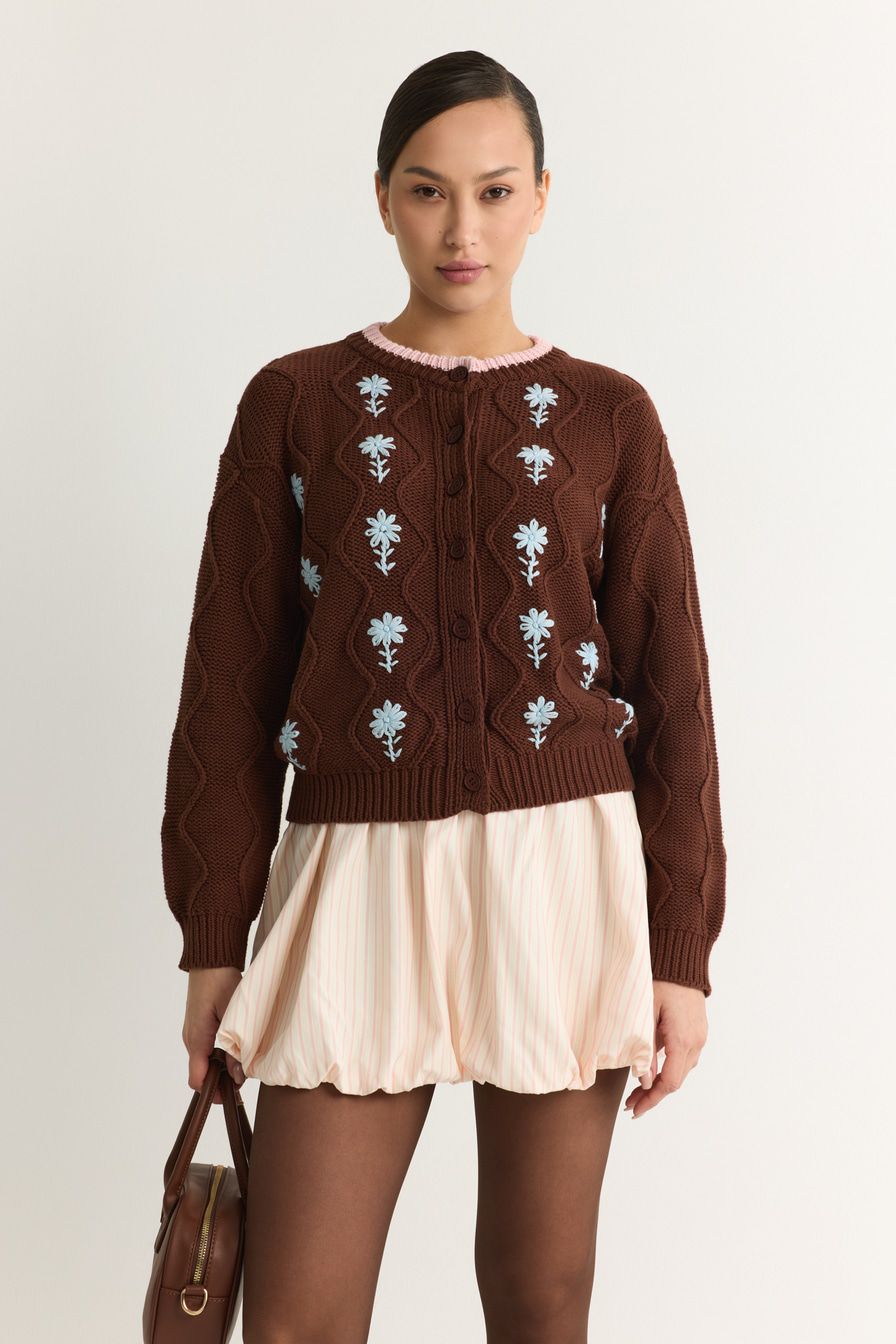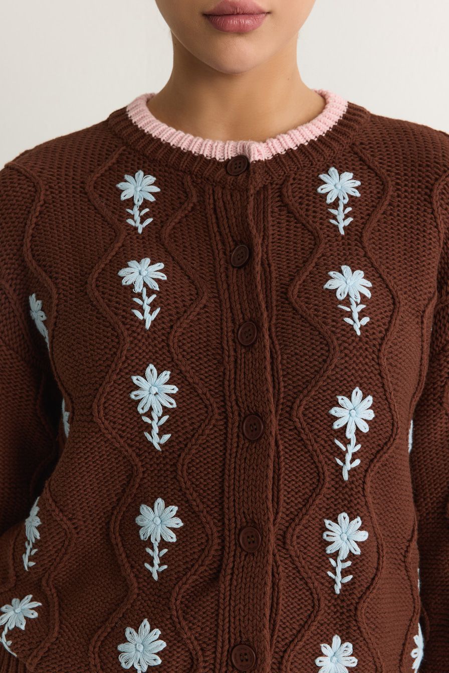 Коричневый кардиган из 100% хлопка крупной вязки – модель свободного кроя. Кардиган декорирован фактурной вязкой, контрастной отделкой и цветочной вышивкой.