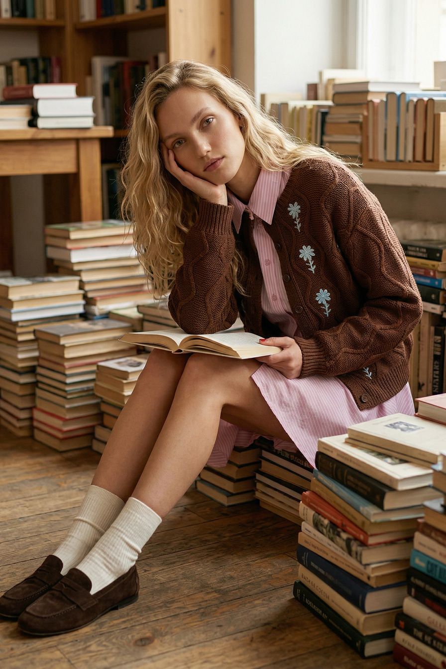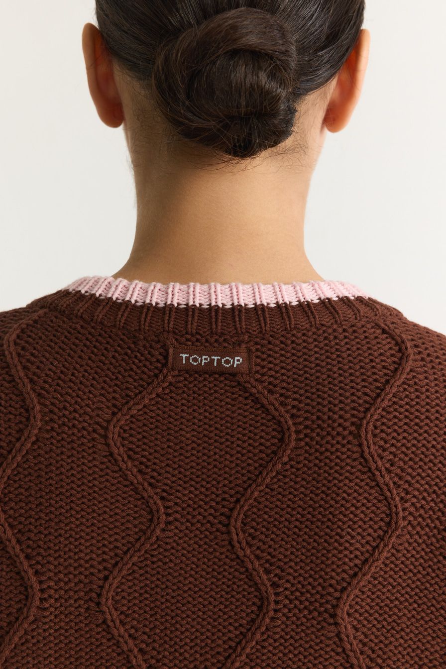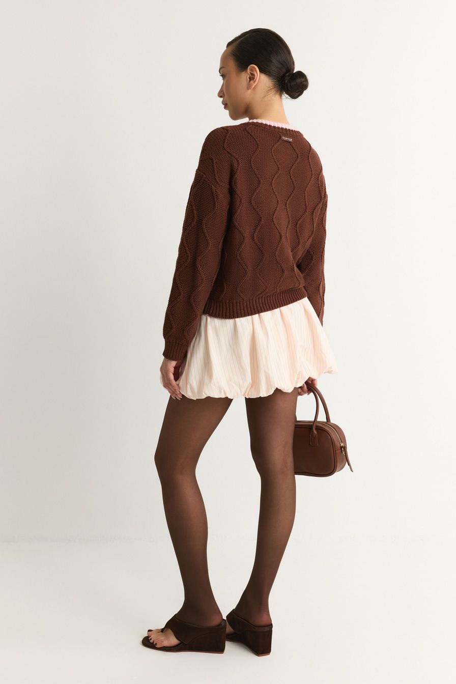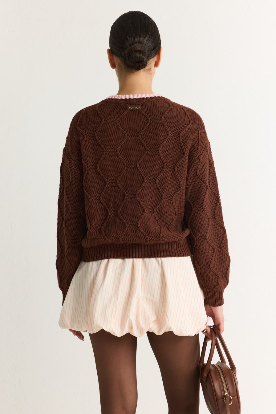 Коричневый кардиган из 100% хлопка крупной вязки – модель свободного кроя. Кардиган декорирован фактурной вязкой, контрастной отделкой и цветочной вышивкой.
