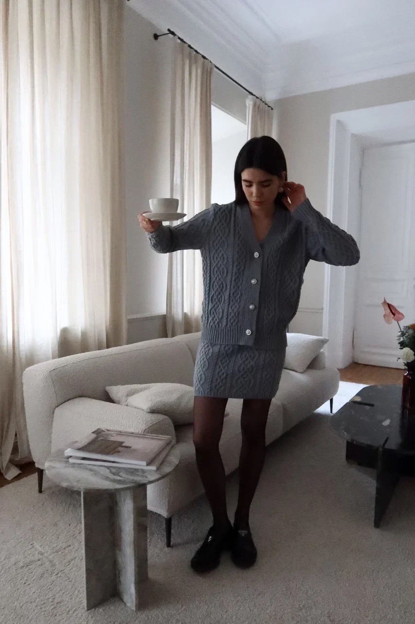Вязаный костюм из плотного, фактурного трикотажа с рельефными косами в сером оттенке.