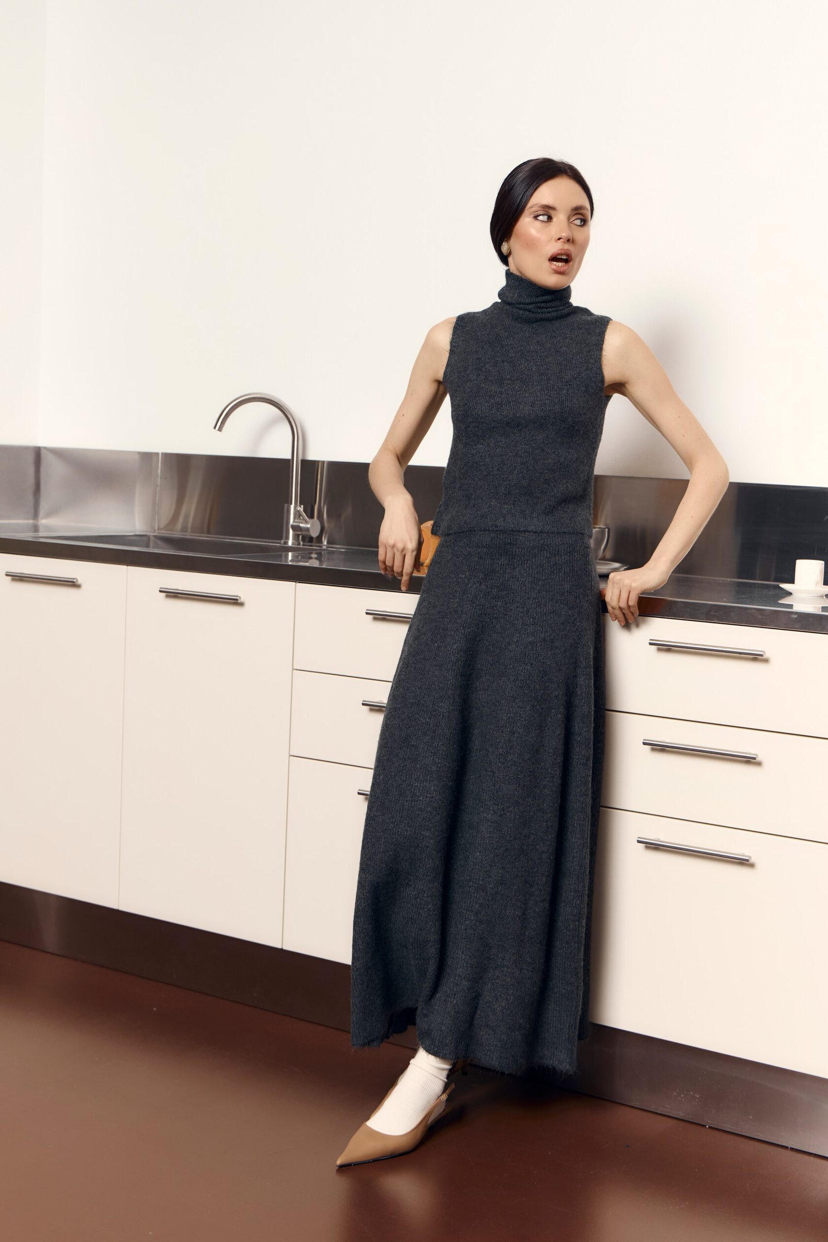 Комплект из топа с воротником-стойкой и юбки-карандаш.