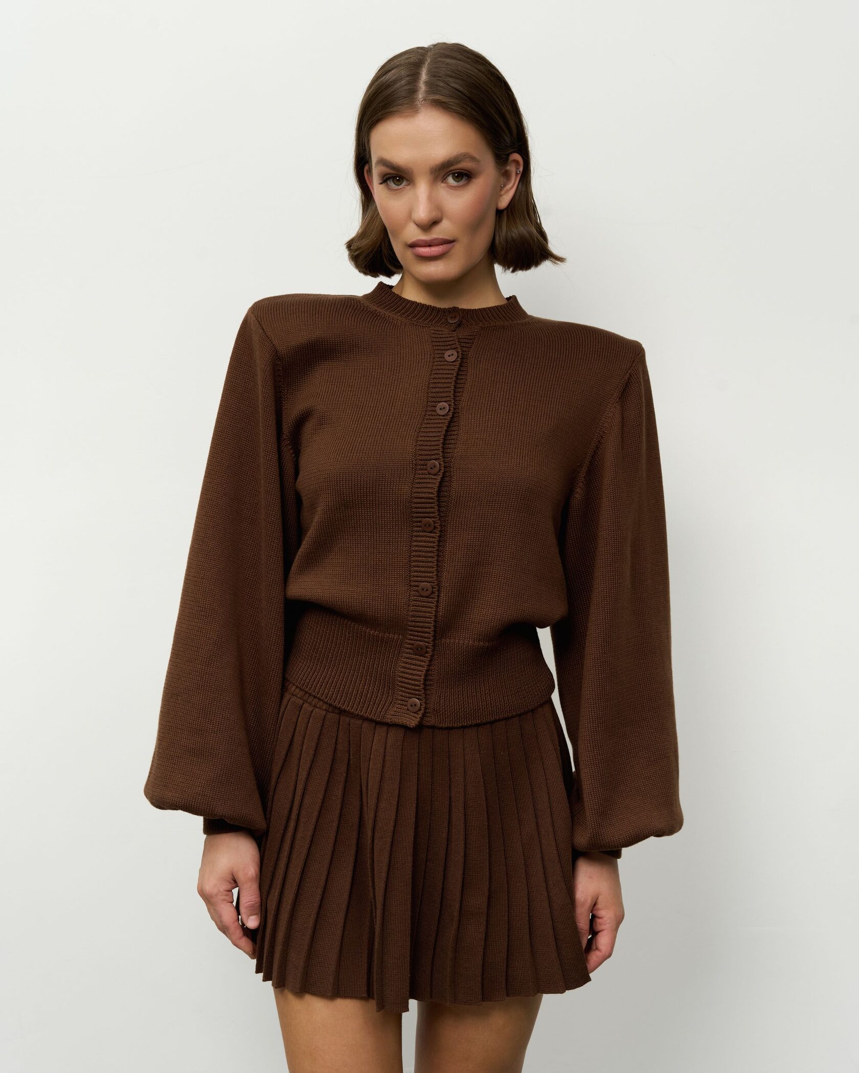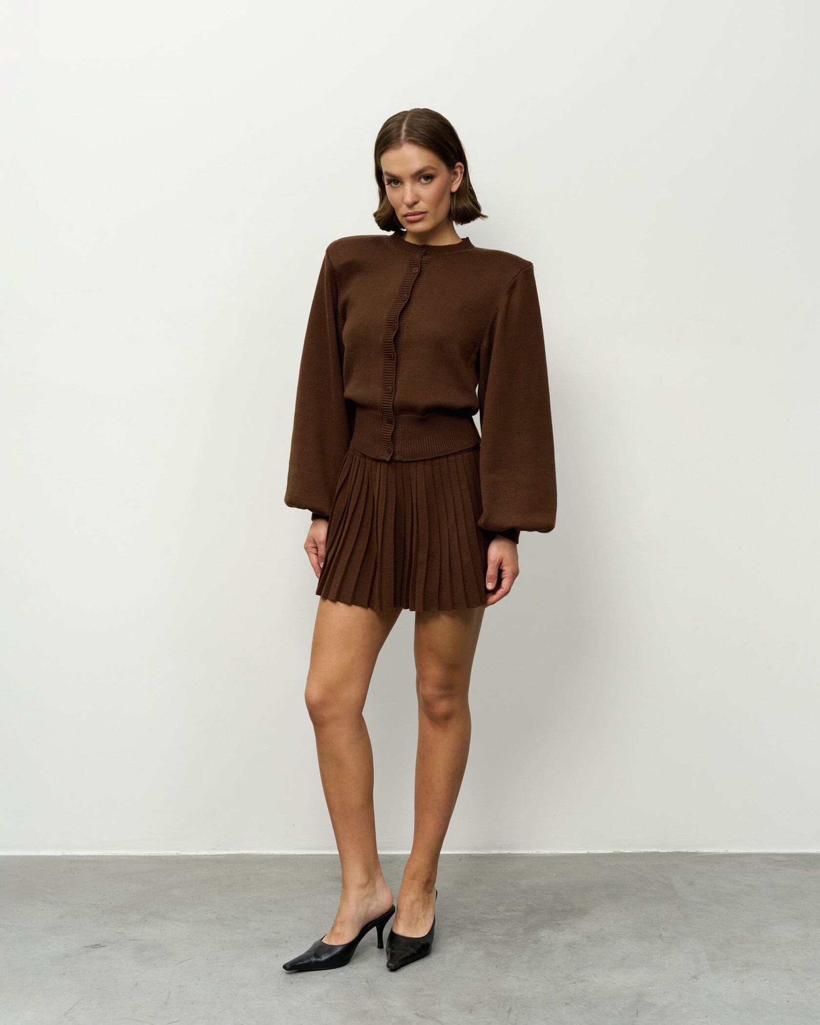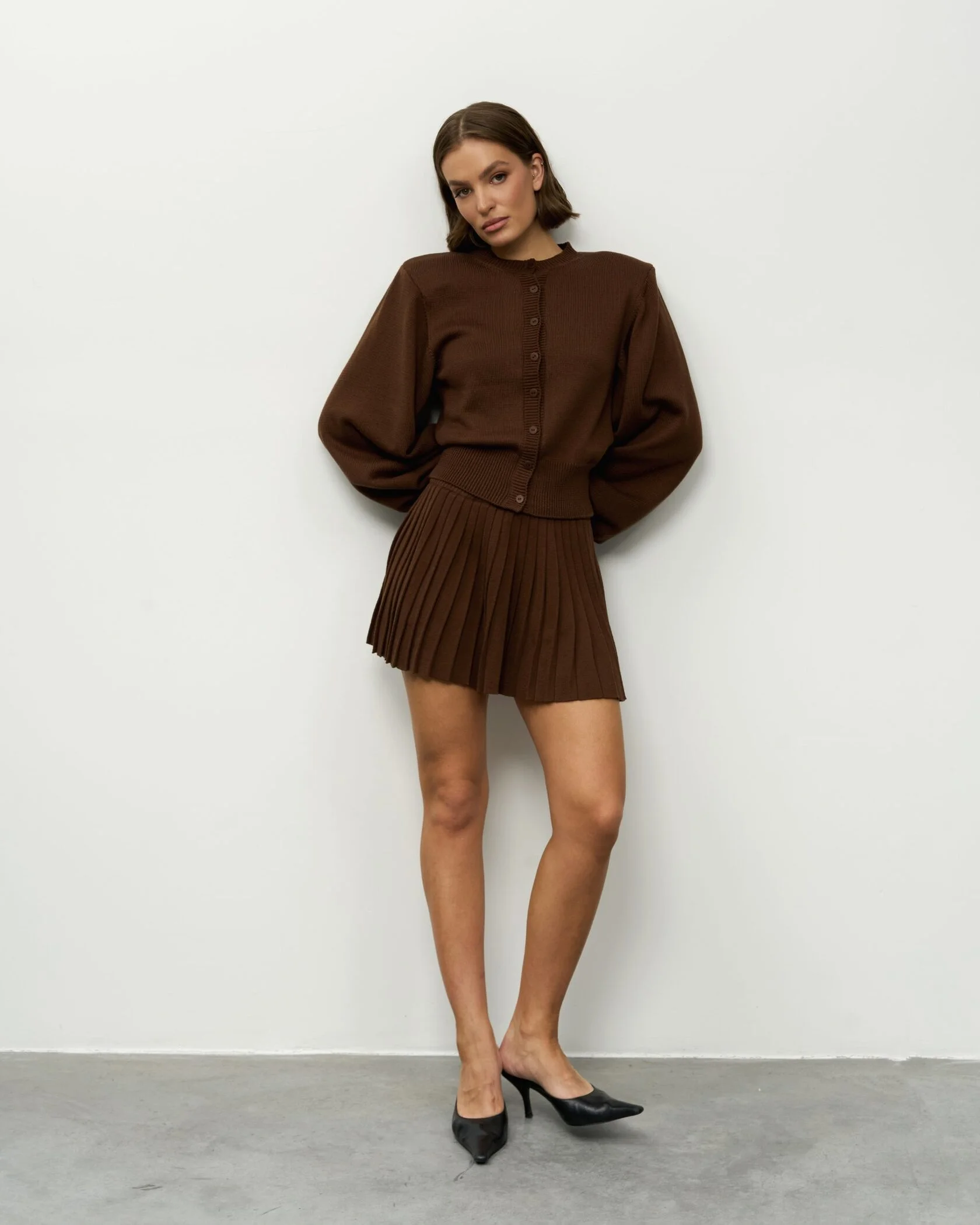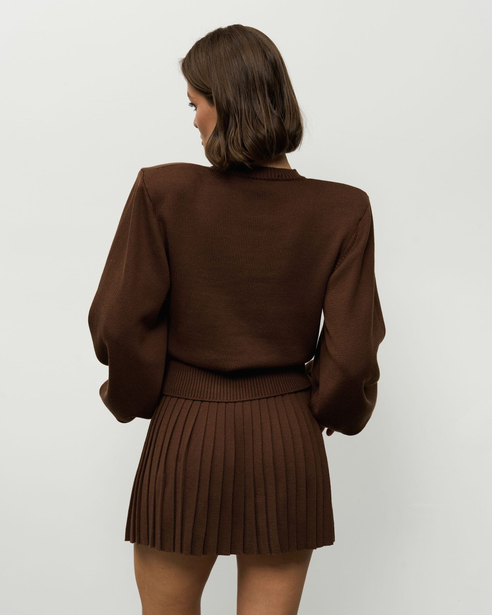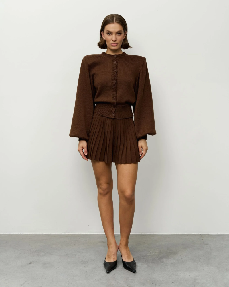 Вязаный костюм в шоколадном оттенке — это безупречный выбор для эффектных городских выходов, встреч и стильных образов, где важны баланс уюта и современной дерзости.
