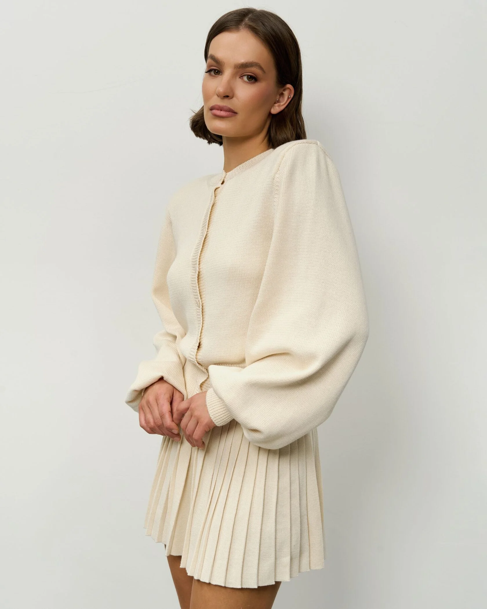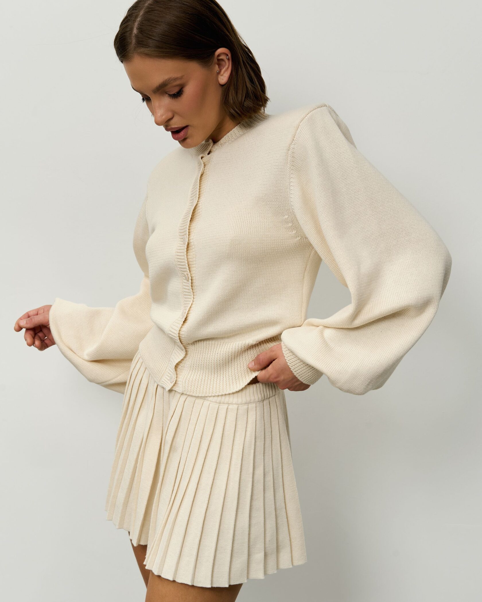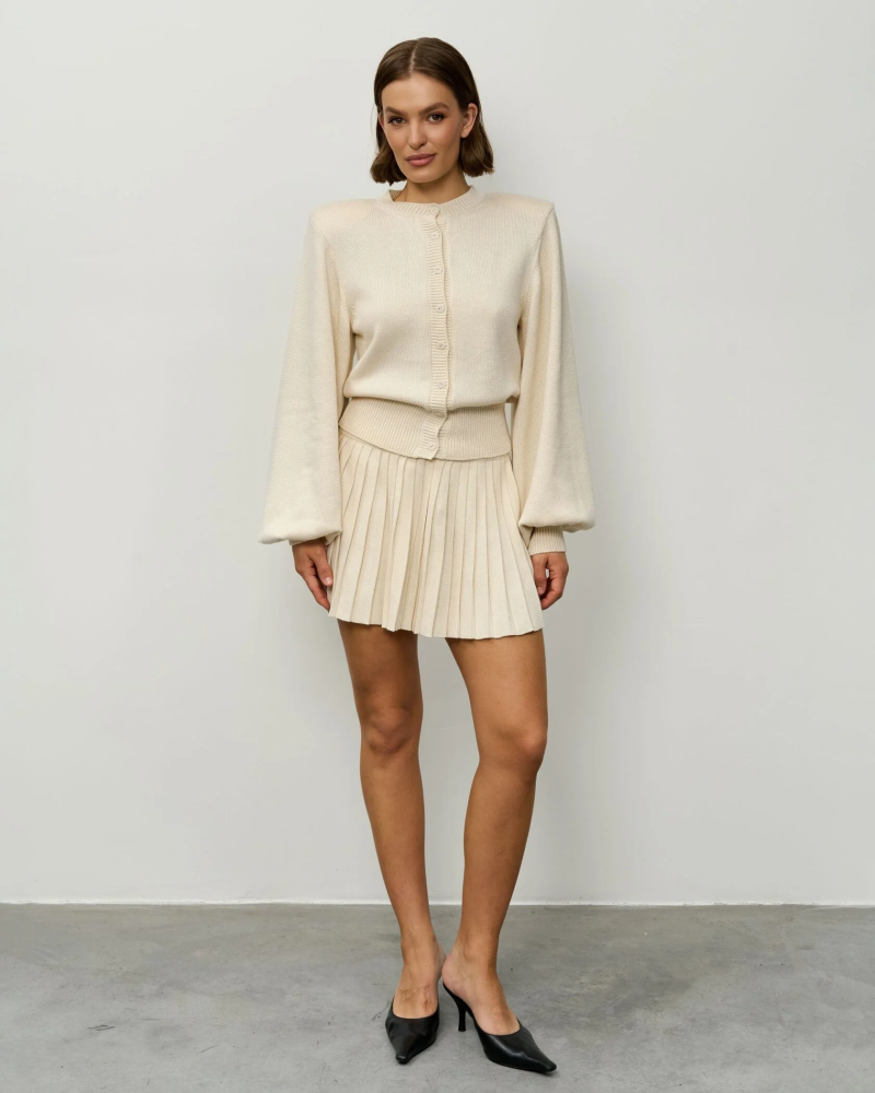 Вязаный костюм в молочном цвете — это безупречный выбор для дневных выходов, атмосферных свиданий и образов, где важны нежность и утонченность.
