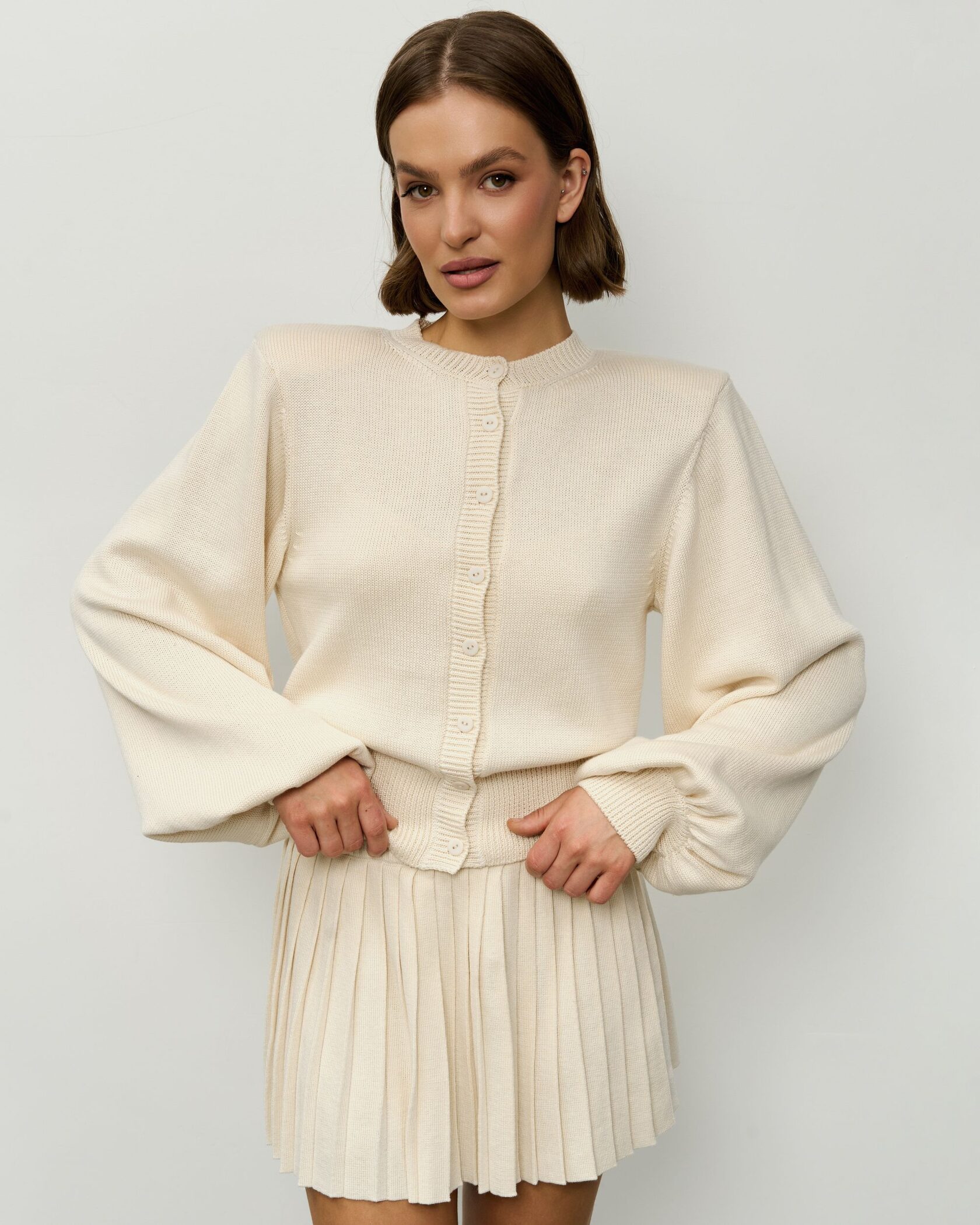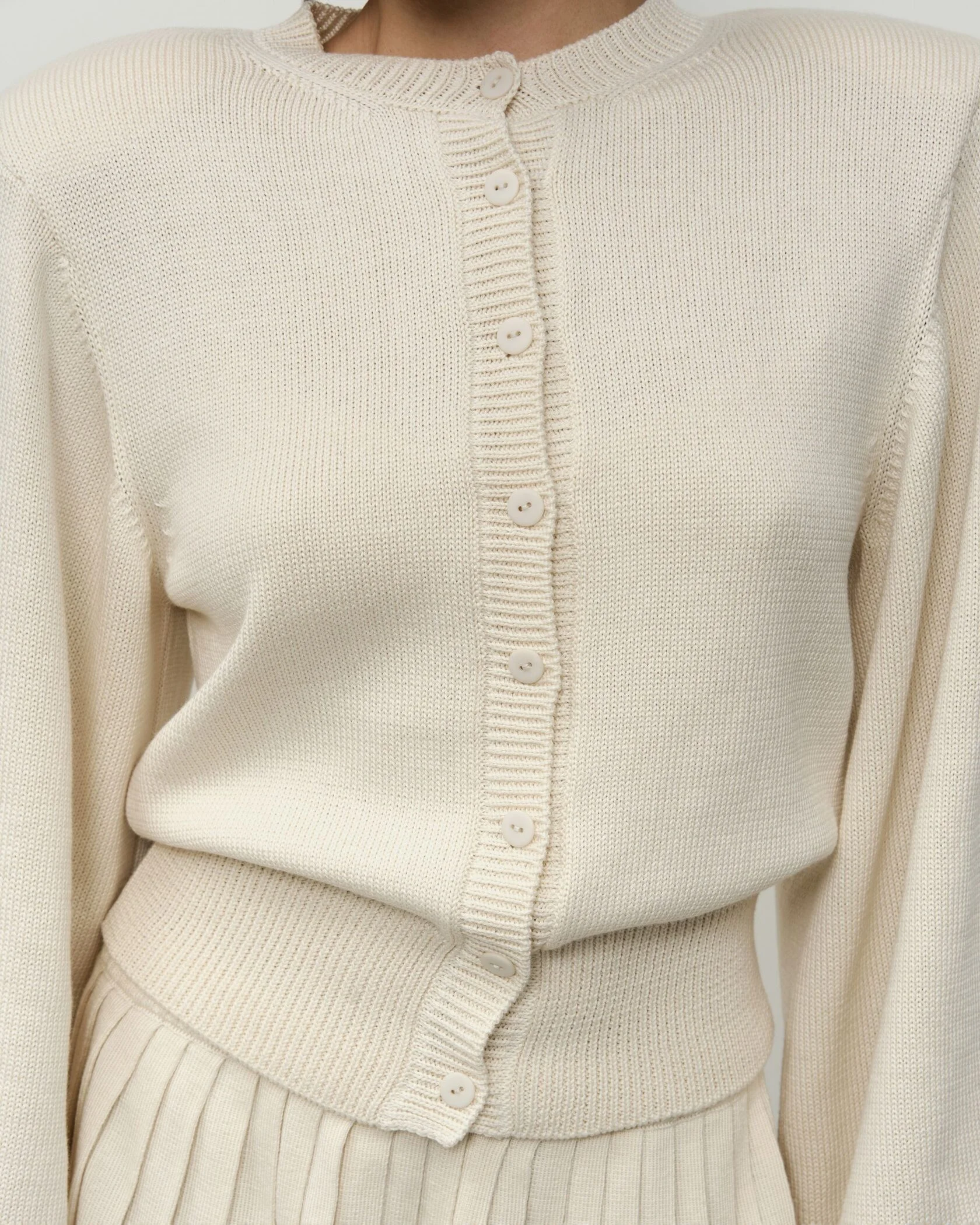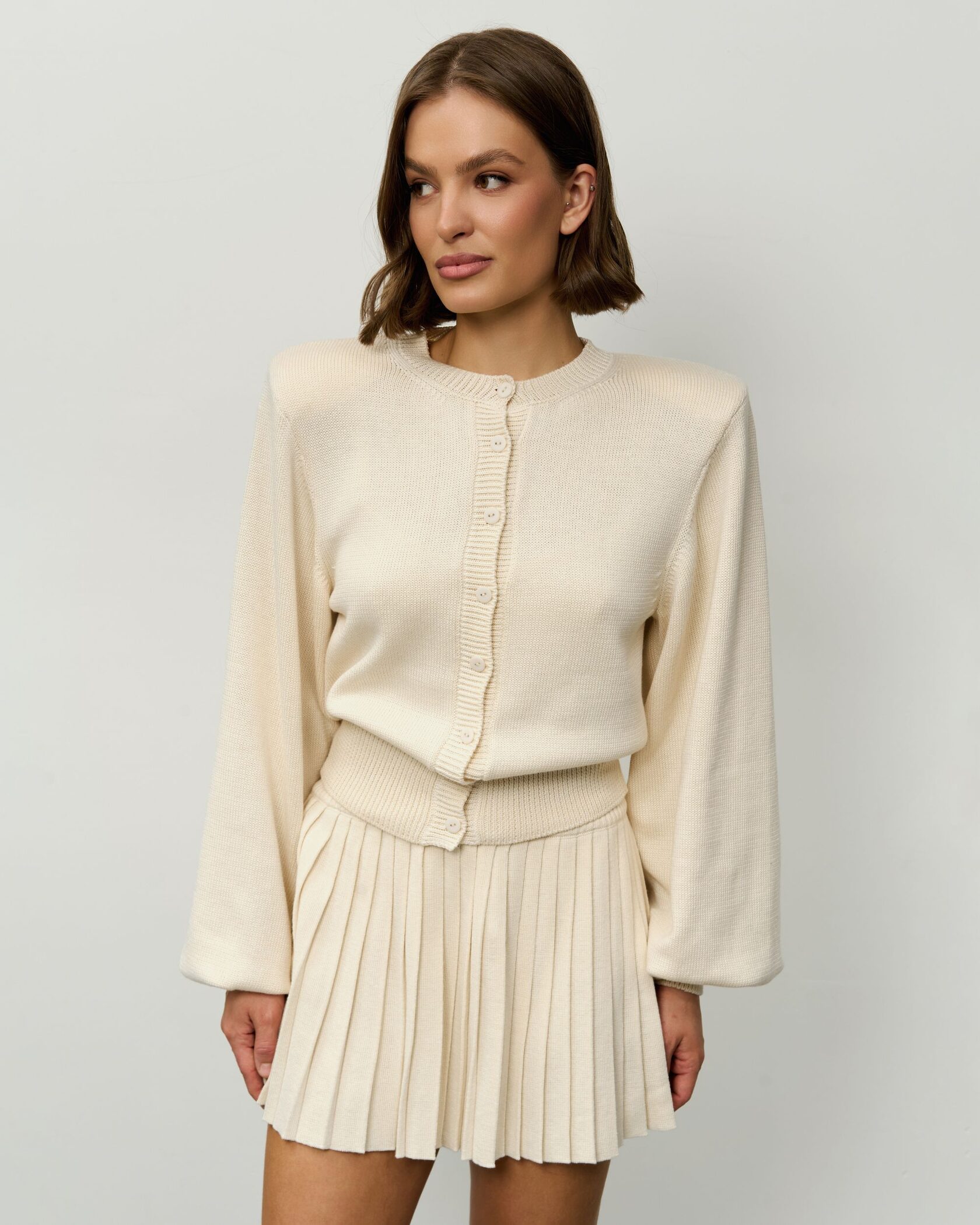 Вязаный костюм в молочном цвете — это безупречный выбор для дневных выходов, атмосферных свиданий и образов, где важны нежность и утонченность.