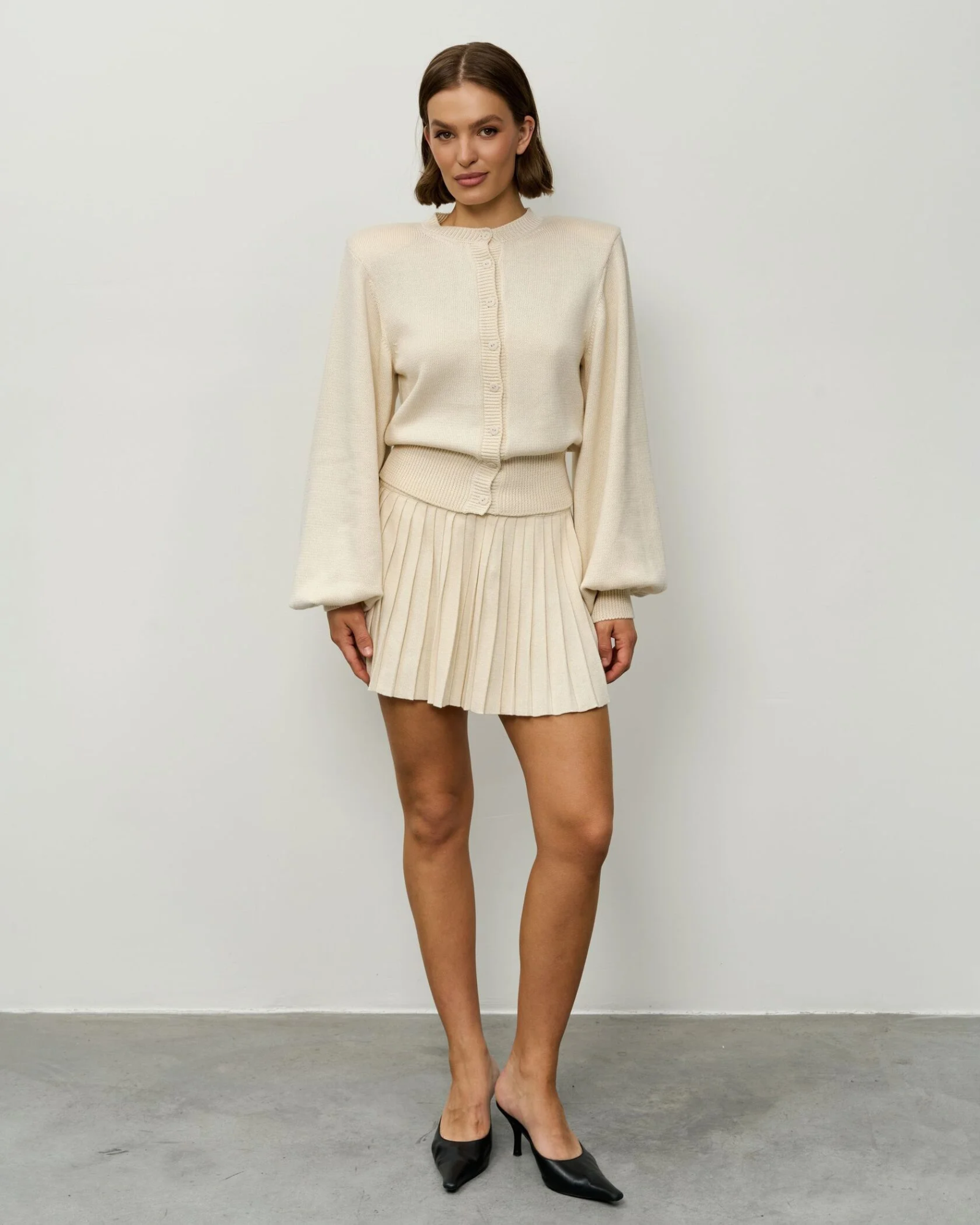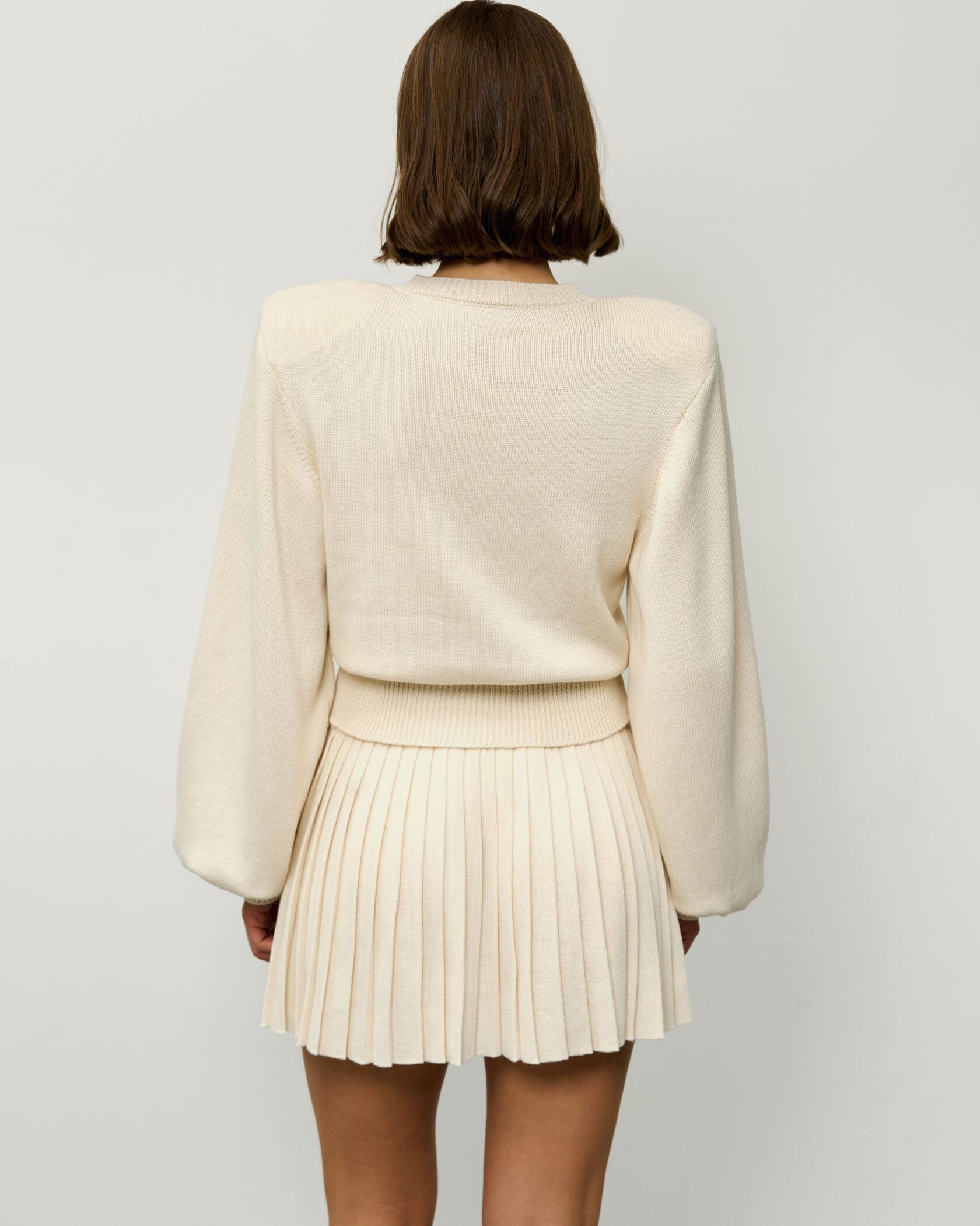 Модель из мягкого фактурного трикотажа деликатно обрамляет силуэт благодаря знаковым подплечникам и летящей юбке-плиссе длины мини, которая подчеркивает линию ног, придавая образу особую свежесть и легкость.