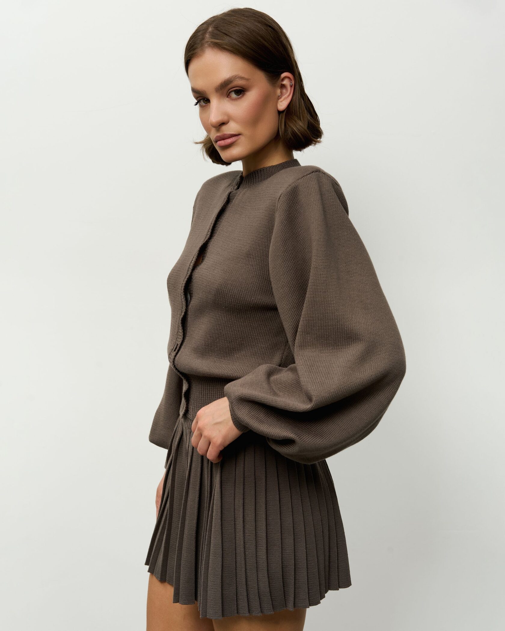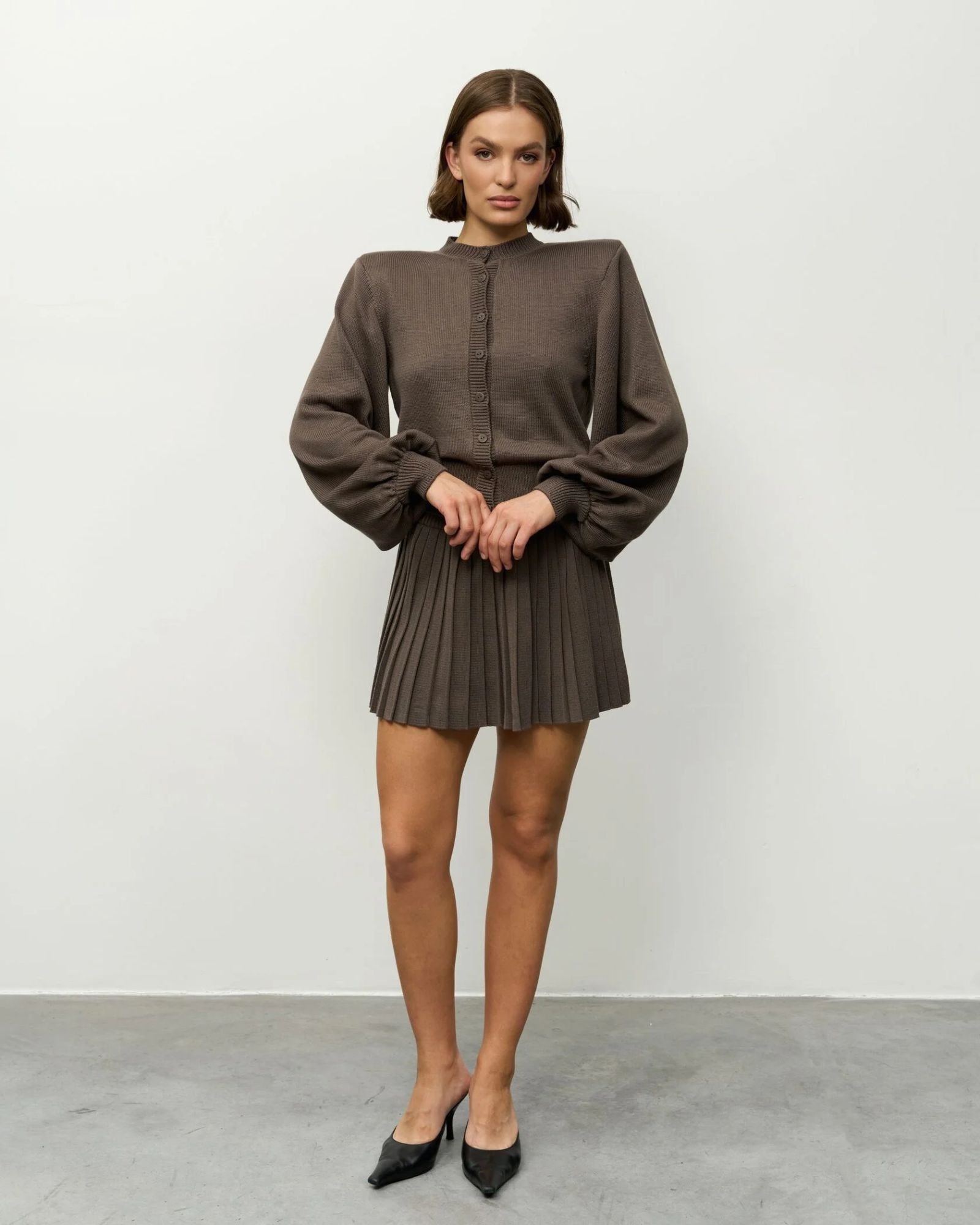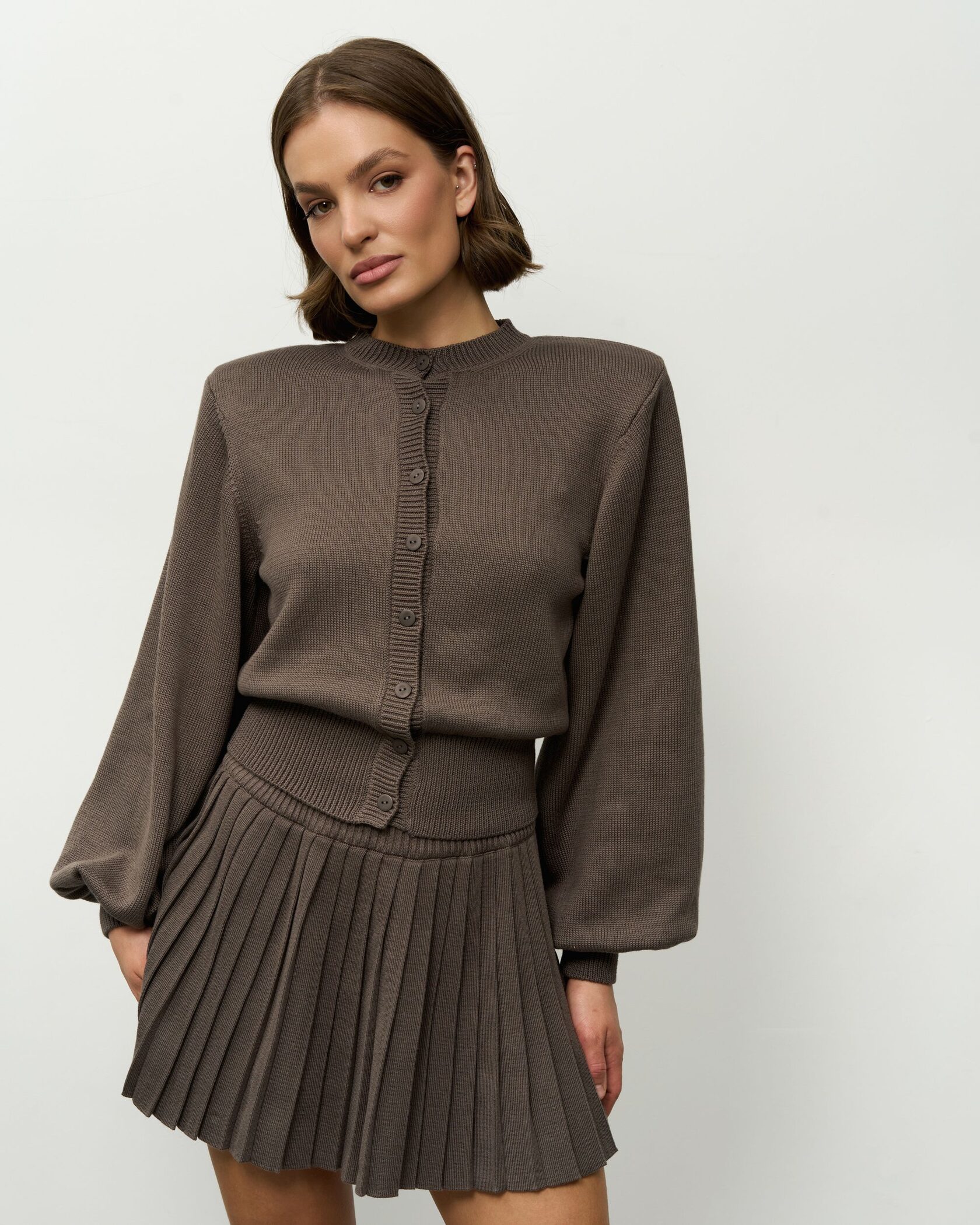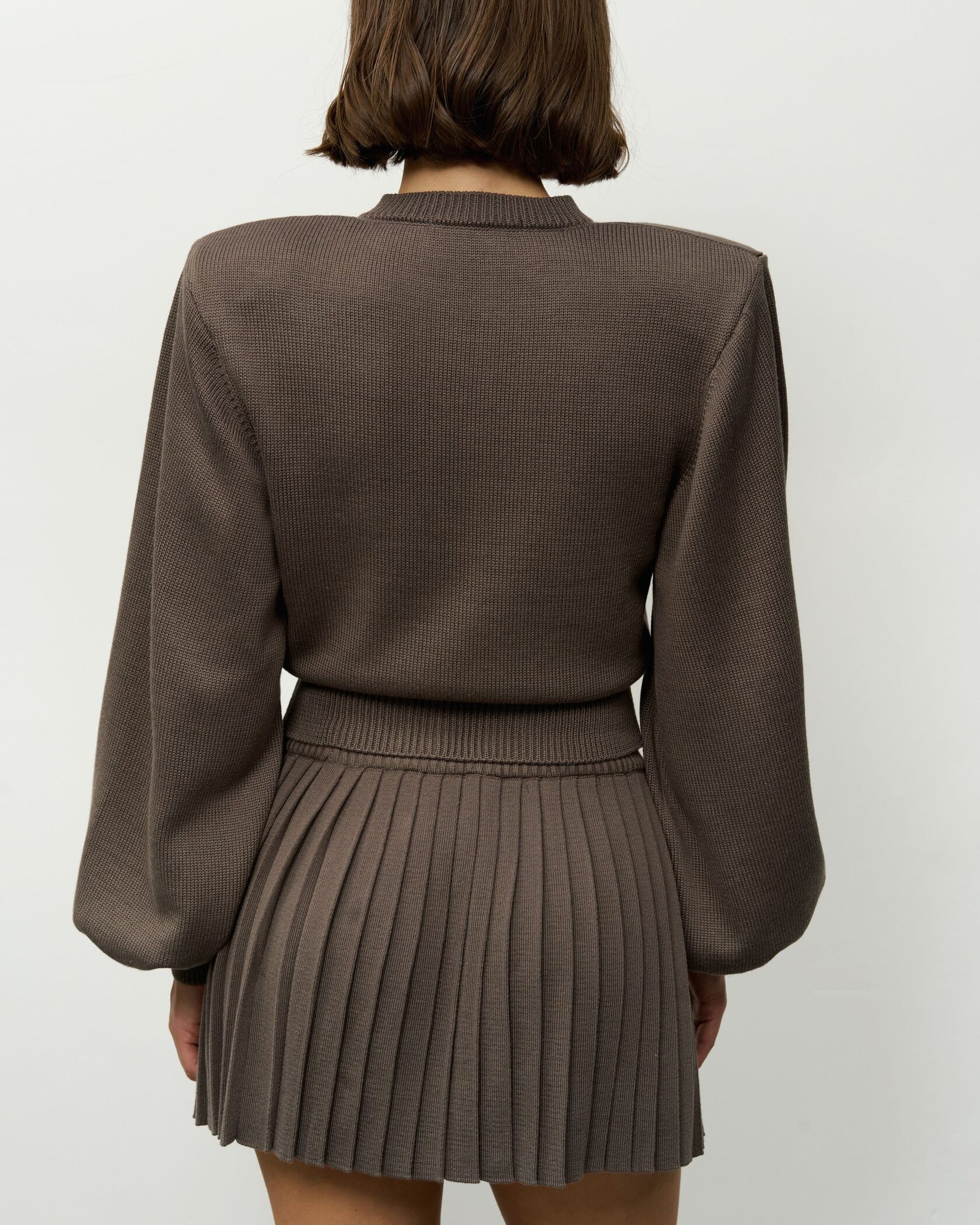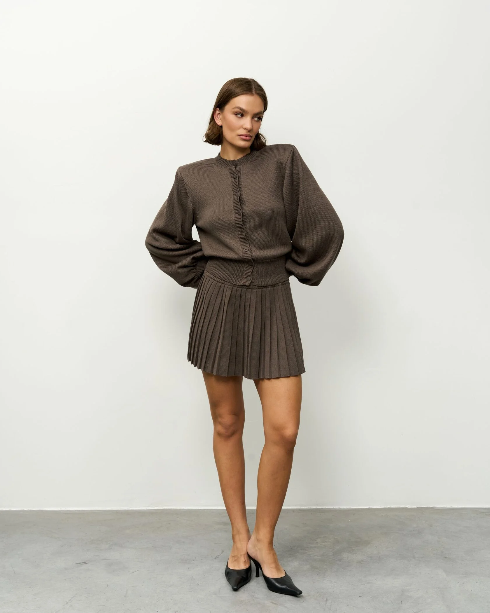 Модель из плотного фактурного трикотажа в графитовом оттенке эффектно структурирует силуэт благодаря выразительным подплечникам и укороченной юбке-плиссе, которая выгодно подчеркивает линию ног, придавая образу динамику и современный акцент.