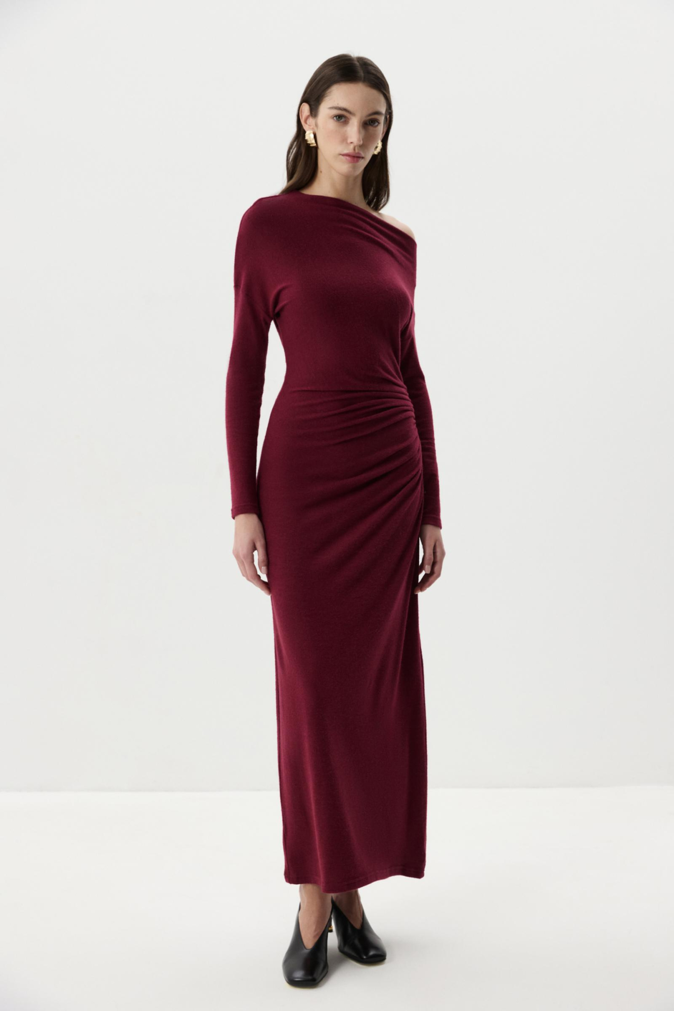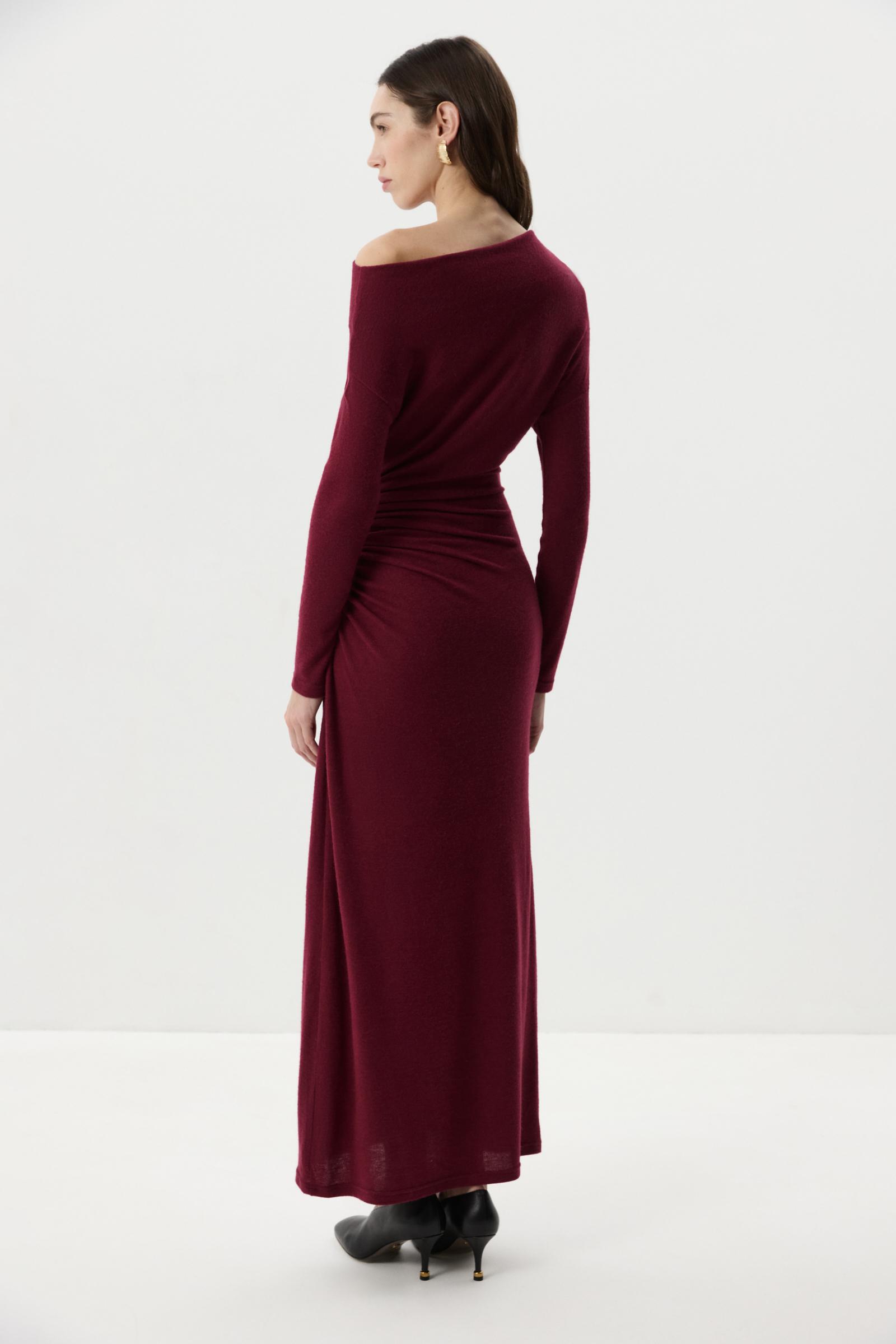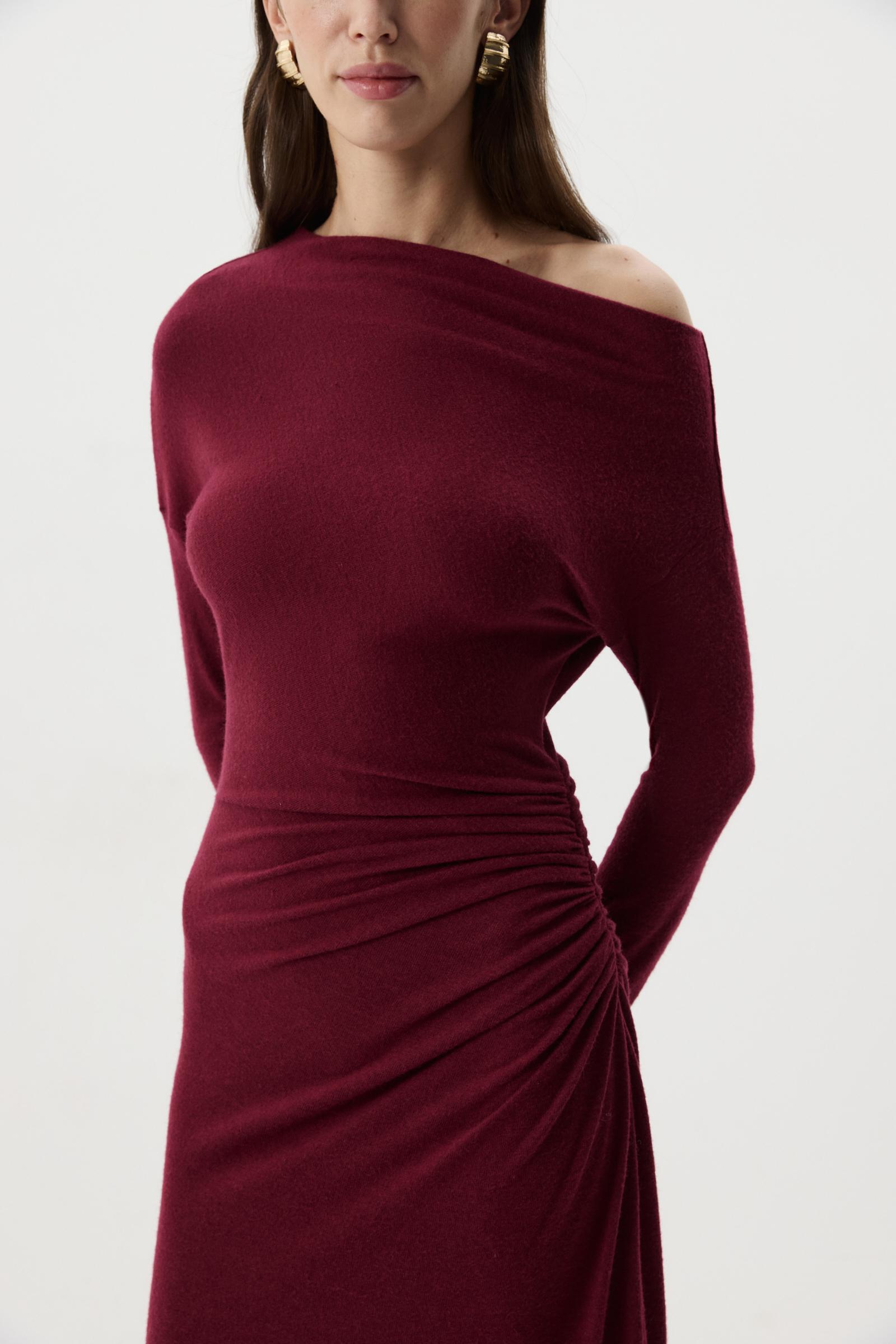 Платье из мягкого свитерного трикотажа в длине макси. По боковому шву сборка, что добавляет акцент по талии. Спущенное плечо подчеркивает линию плеч и ключиц.