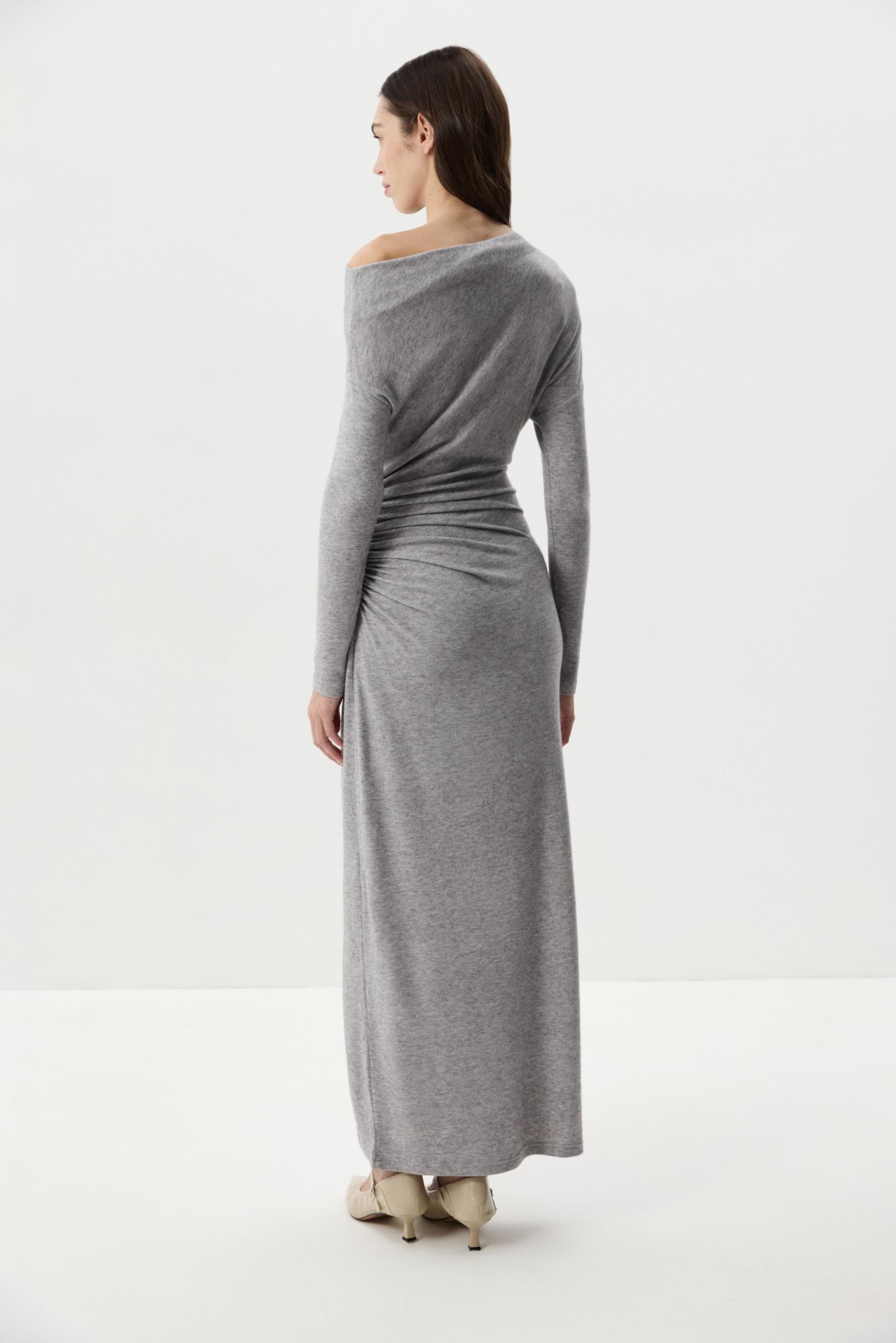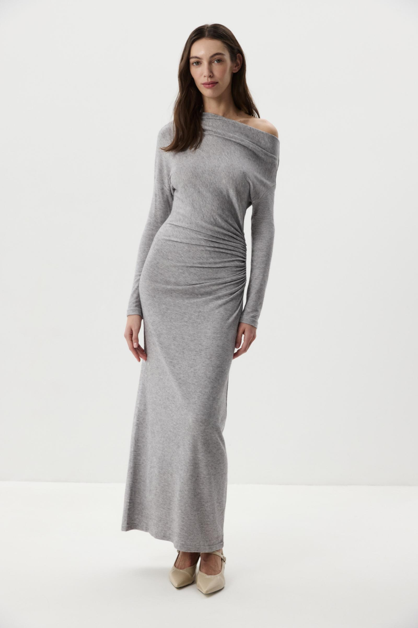 Платье из мягкого свитерного трикотажа в длине макси. По боковому шву сборка, что добавляет акцент по талии. Спущенное плечо подчеркивает линию плеч и ключиц.