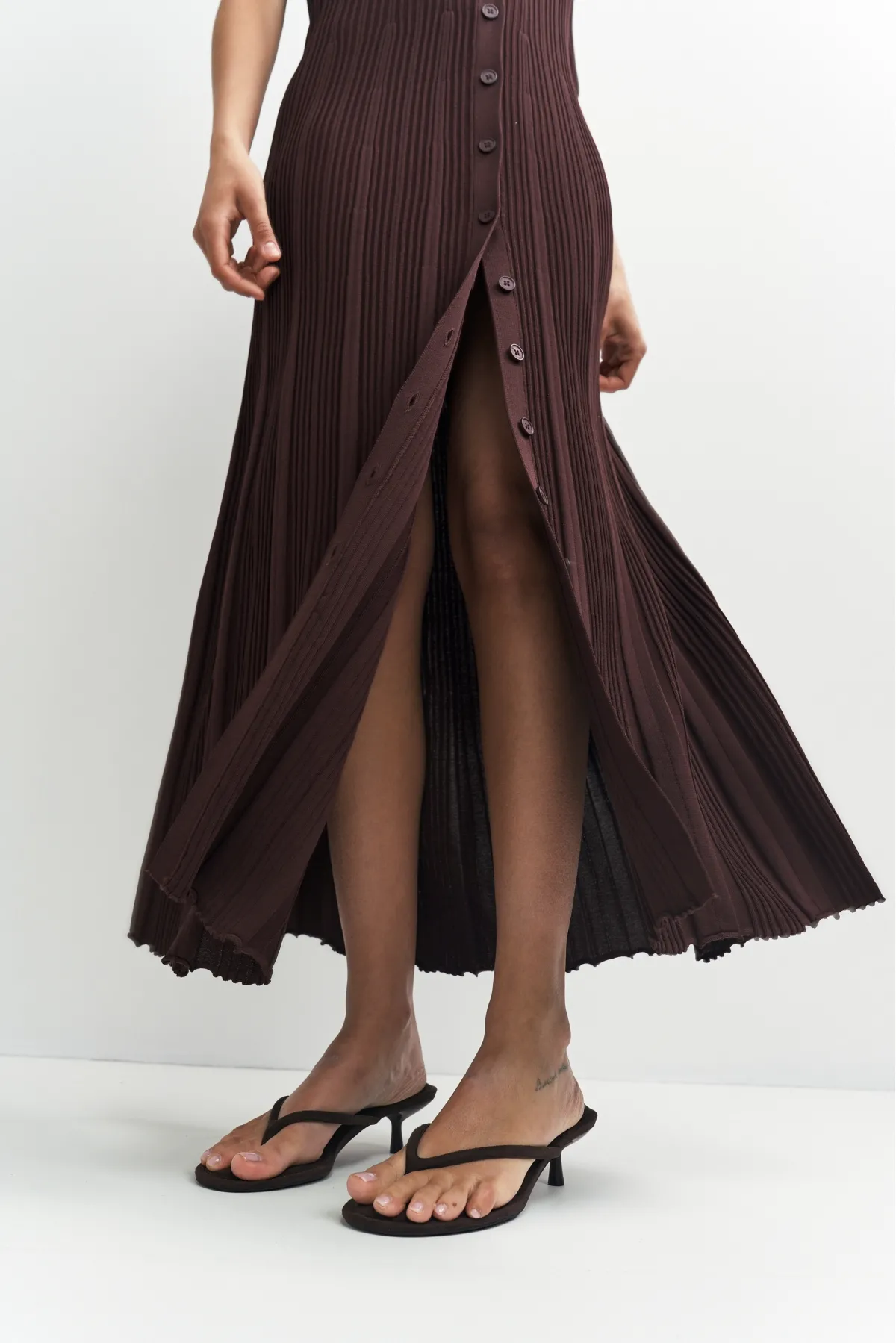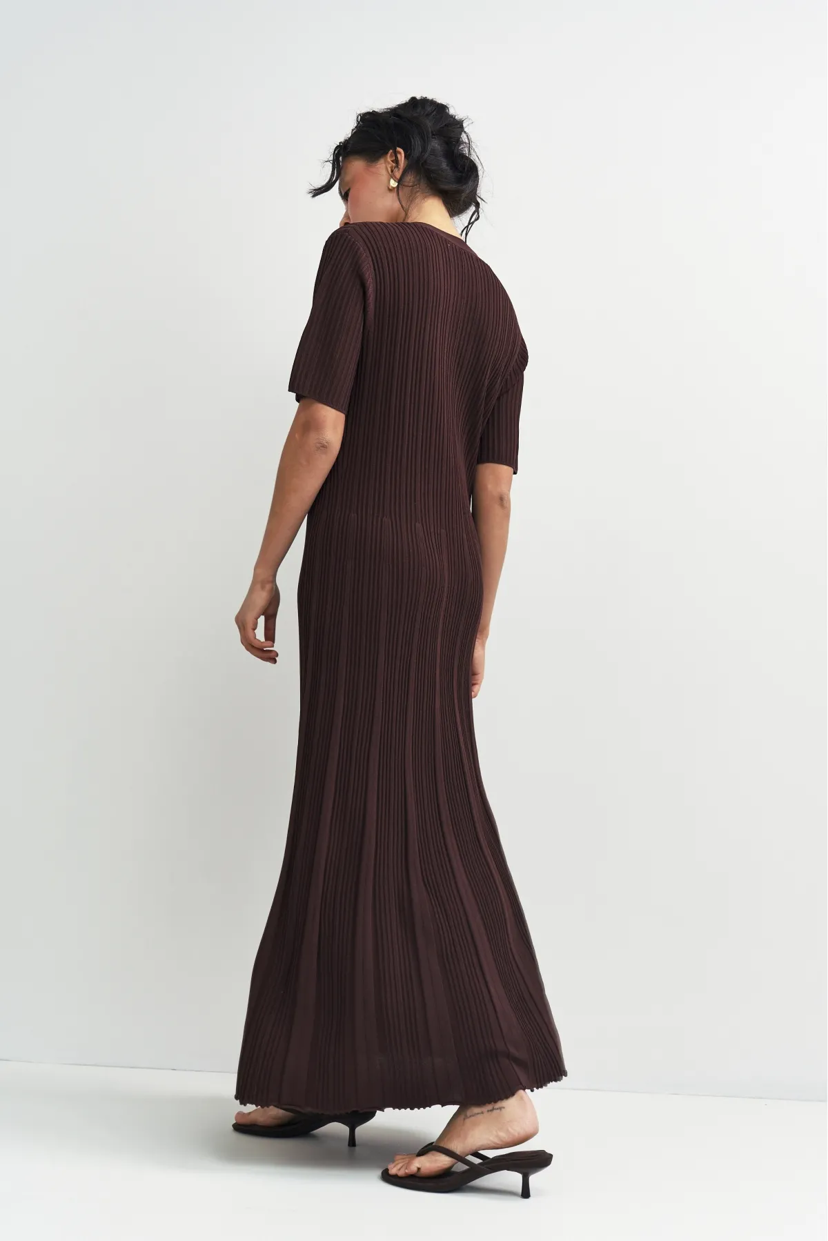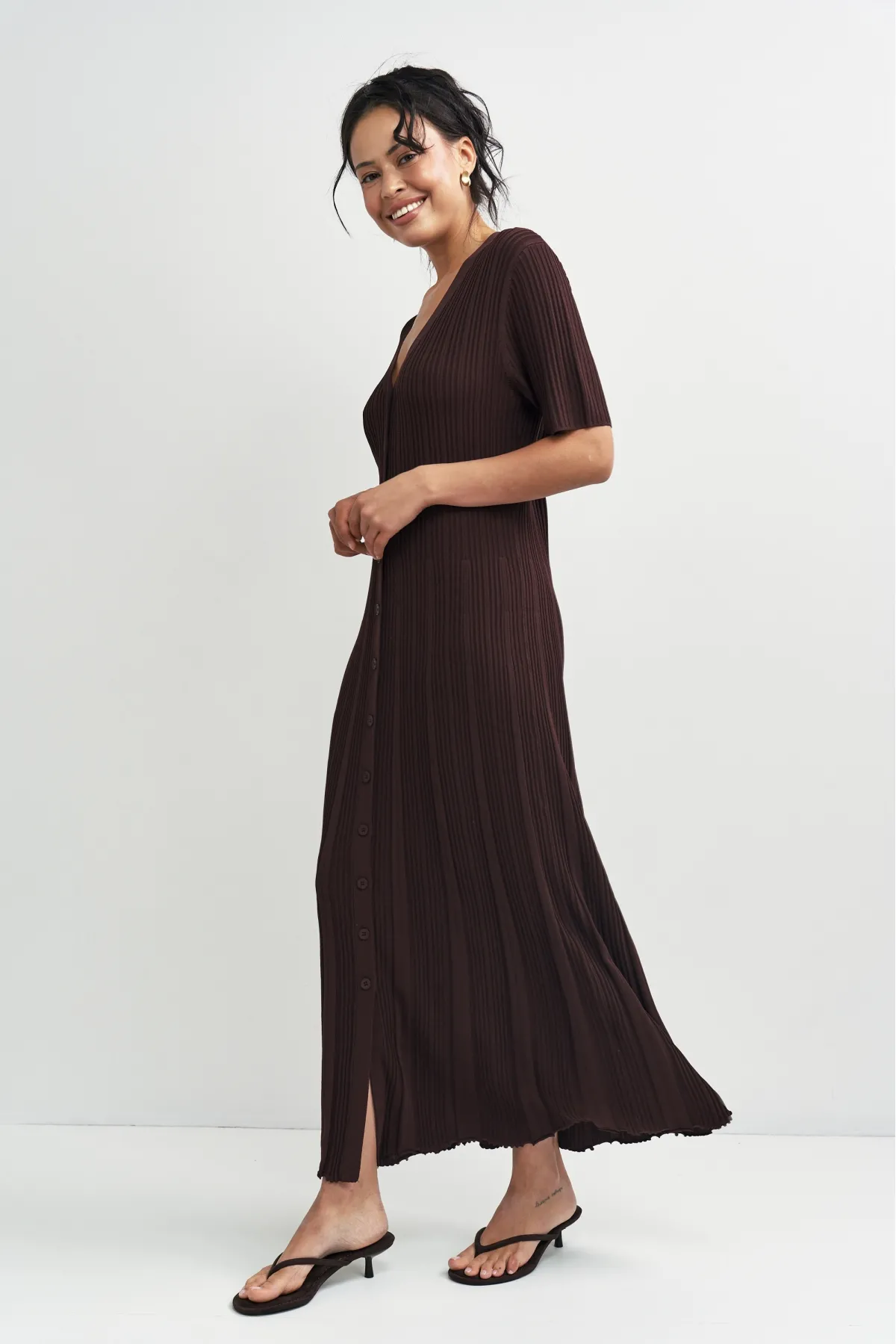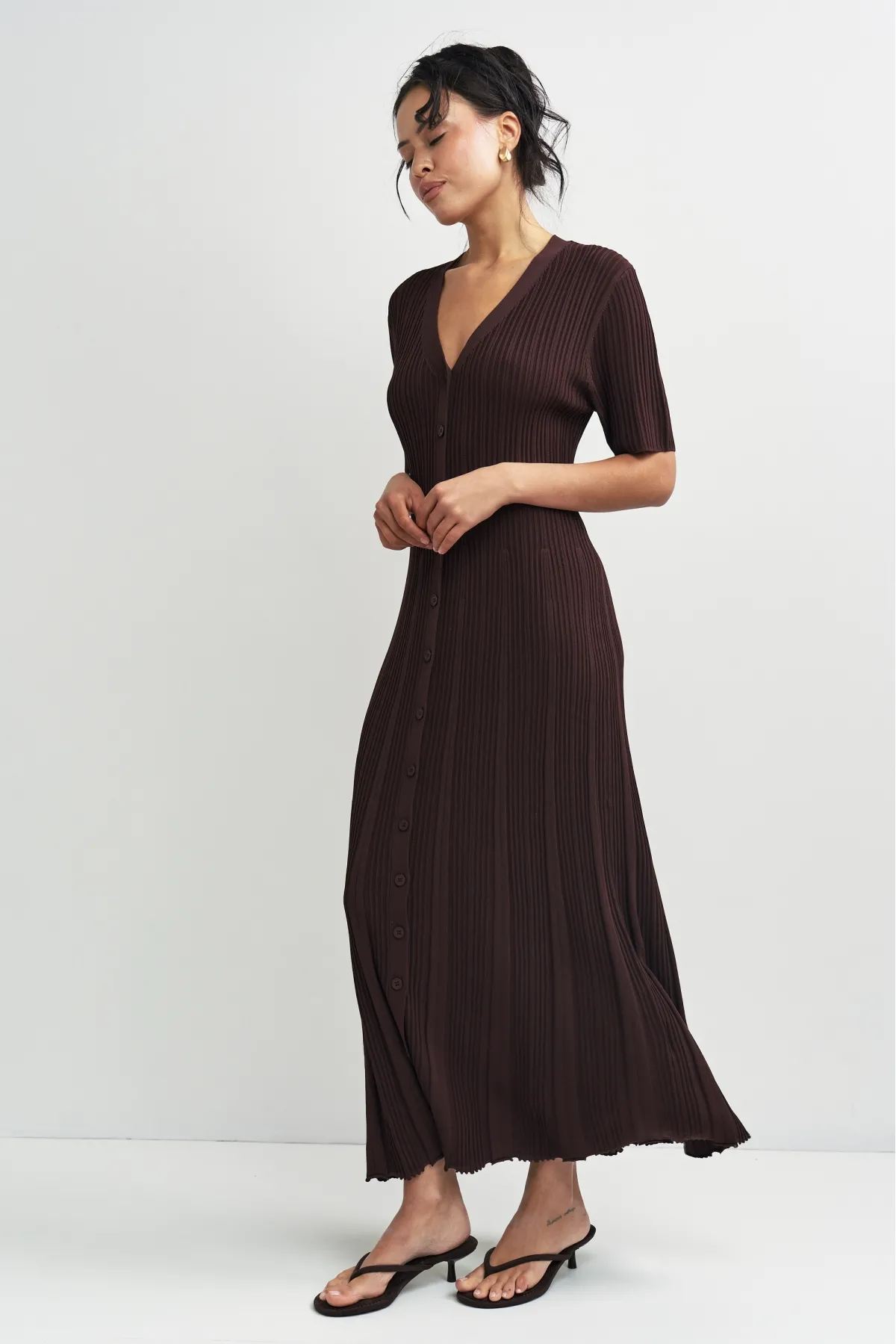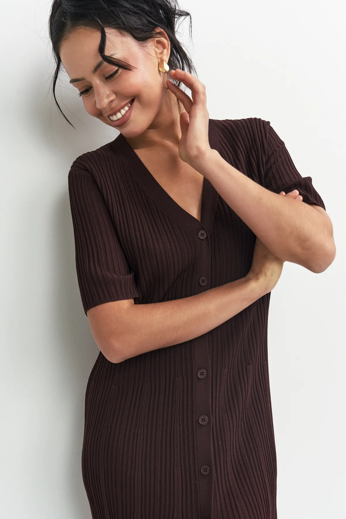 Трикотажное платье с V‑образным вырезом и пуговицами по всей длине. Плотный материал держит форму и обеспечивает комфорт. Длина до щиколотки и рукава до локтя делают модель универсальной — она впишется в любой гардероб и подойдёт для разных случаев. Просто, стильно, удобно.