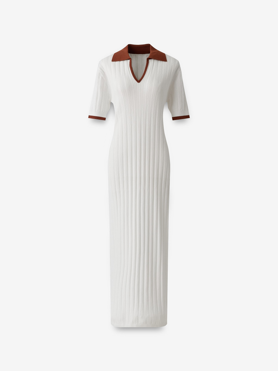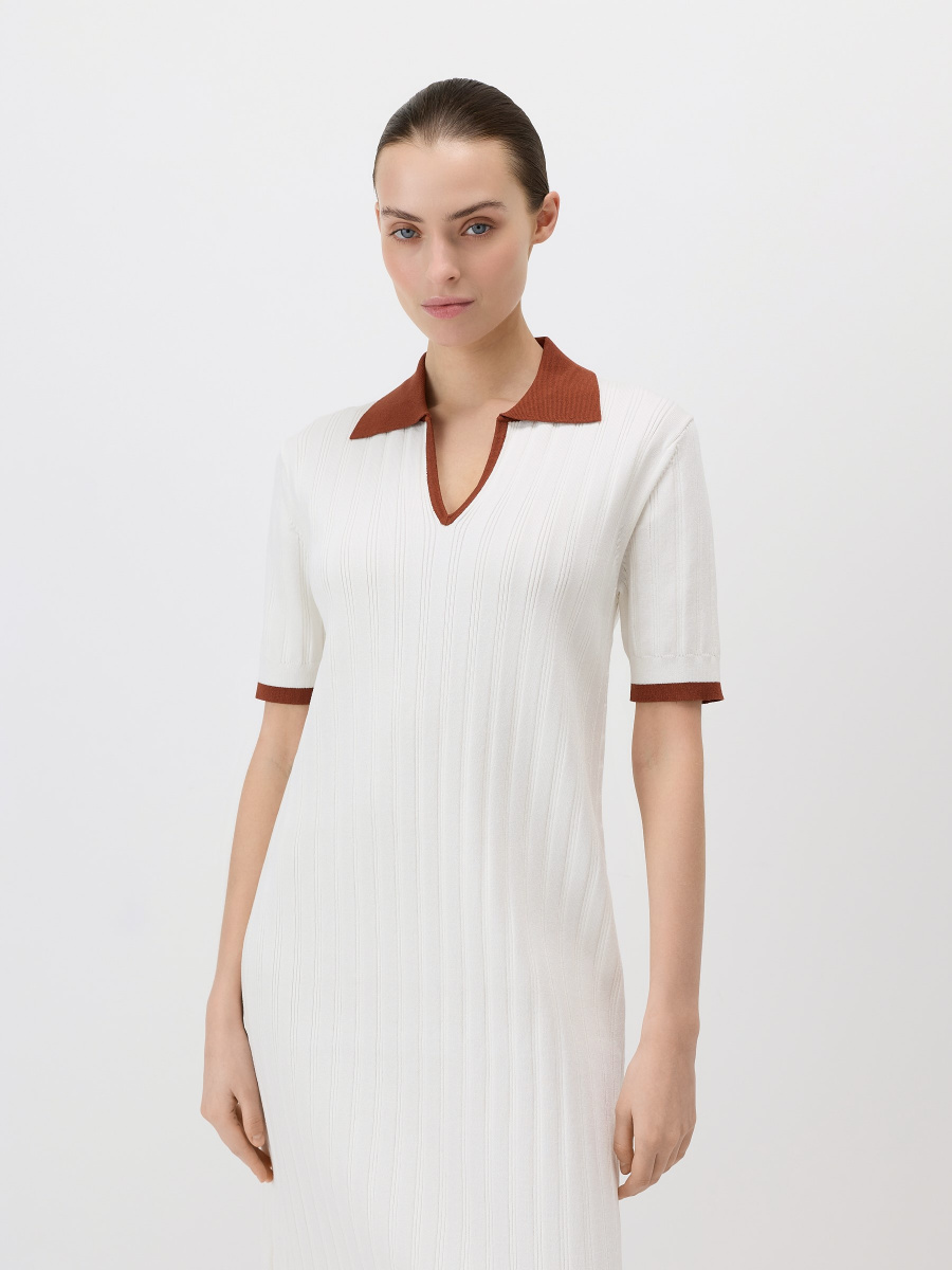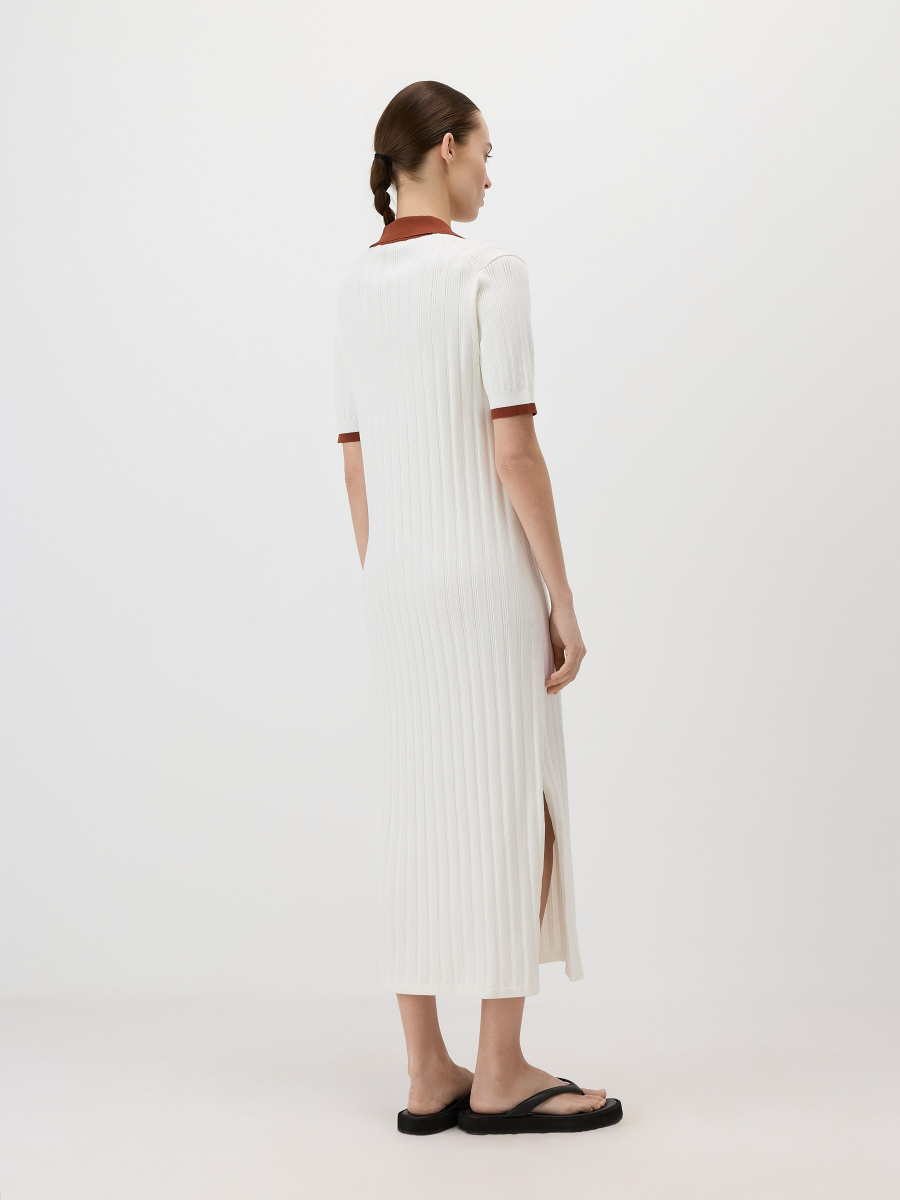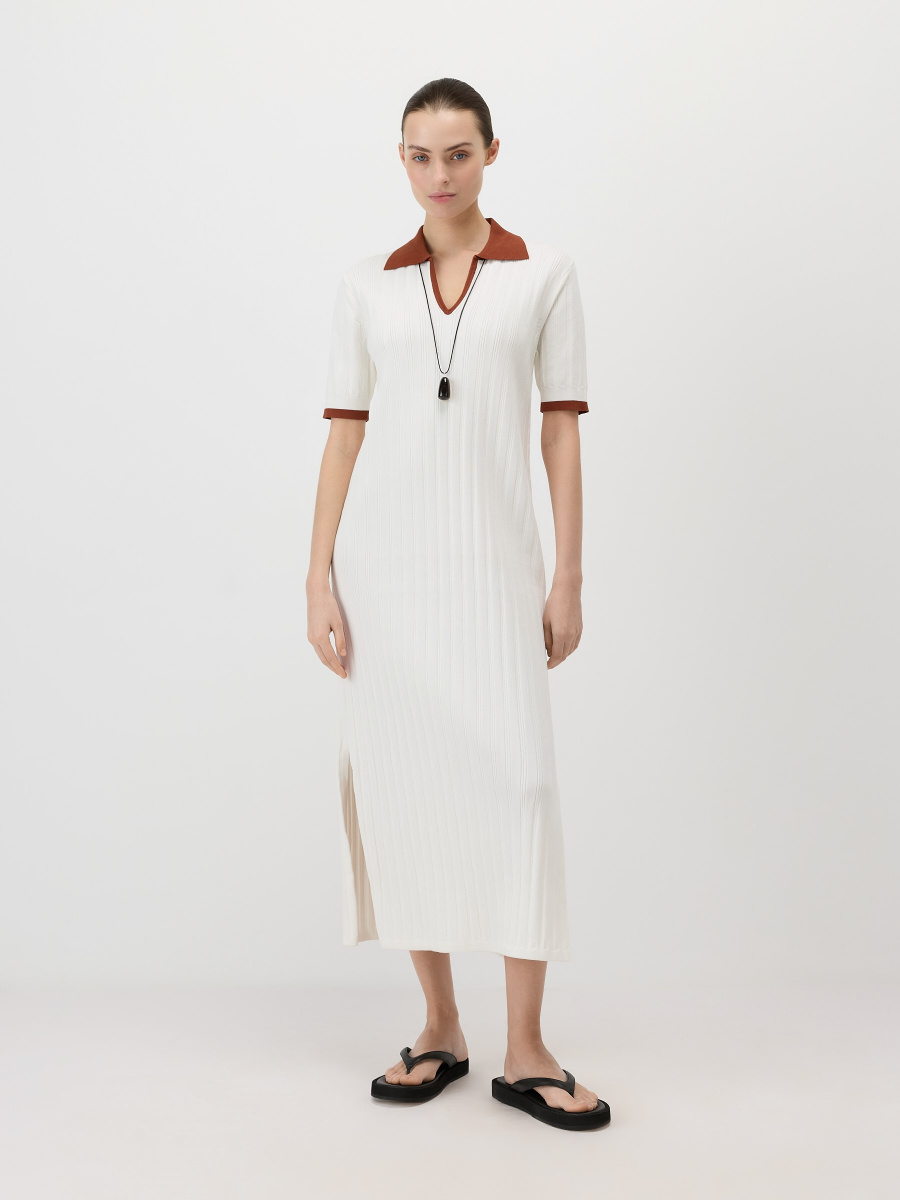 Прямое платье мидакси с воротником-поло. Вертикальное вязание в широкий рубчик вытягивает силуэт, а плечевые швы для улучшения посадки смещены на спинку. Боковые разрезы с деликатной обработкой служат декоративным элементом и позволяют свободно двигаться. Эластичное “сухое” полотно на основе вискозы с нитями нейлона сохраняет форму и цвет, не скатывается.