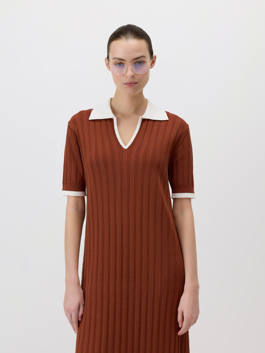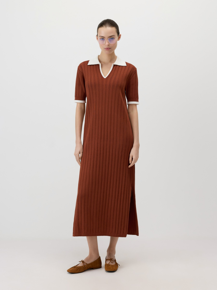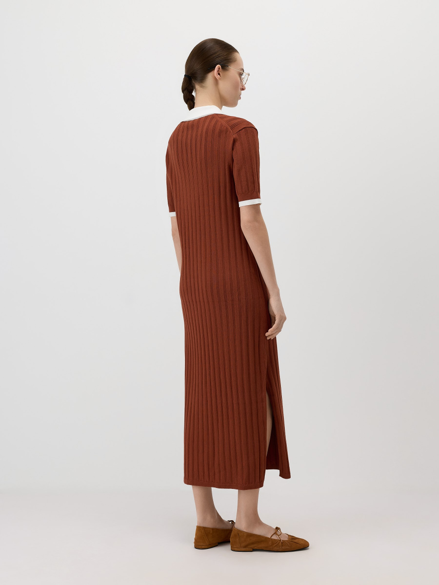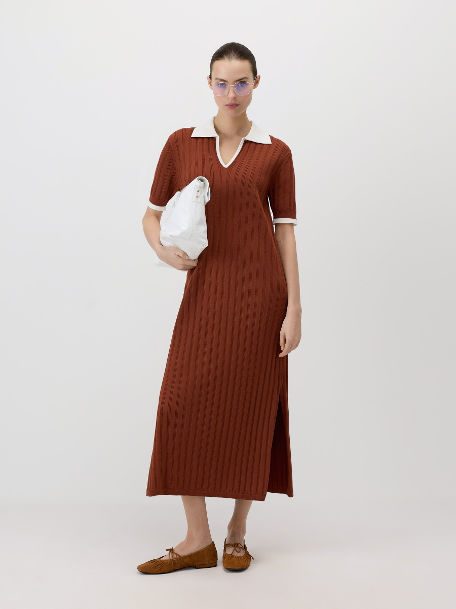 Прямое платье мидакси с воротником-поло. Вертикальное вязание в широкий рубчик вытягивает силуэт, а плечевые швы для улучшения посадки смещены на спинку. Боковые разрезы с деликатной обработкой служат декоративным элементом и позволяют свободно двигаться. Эластичное “сухое” полотно на основе вискозы с нитями нейлона сохраняет форму и цвет, не скатывается.